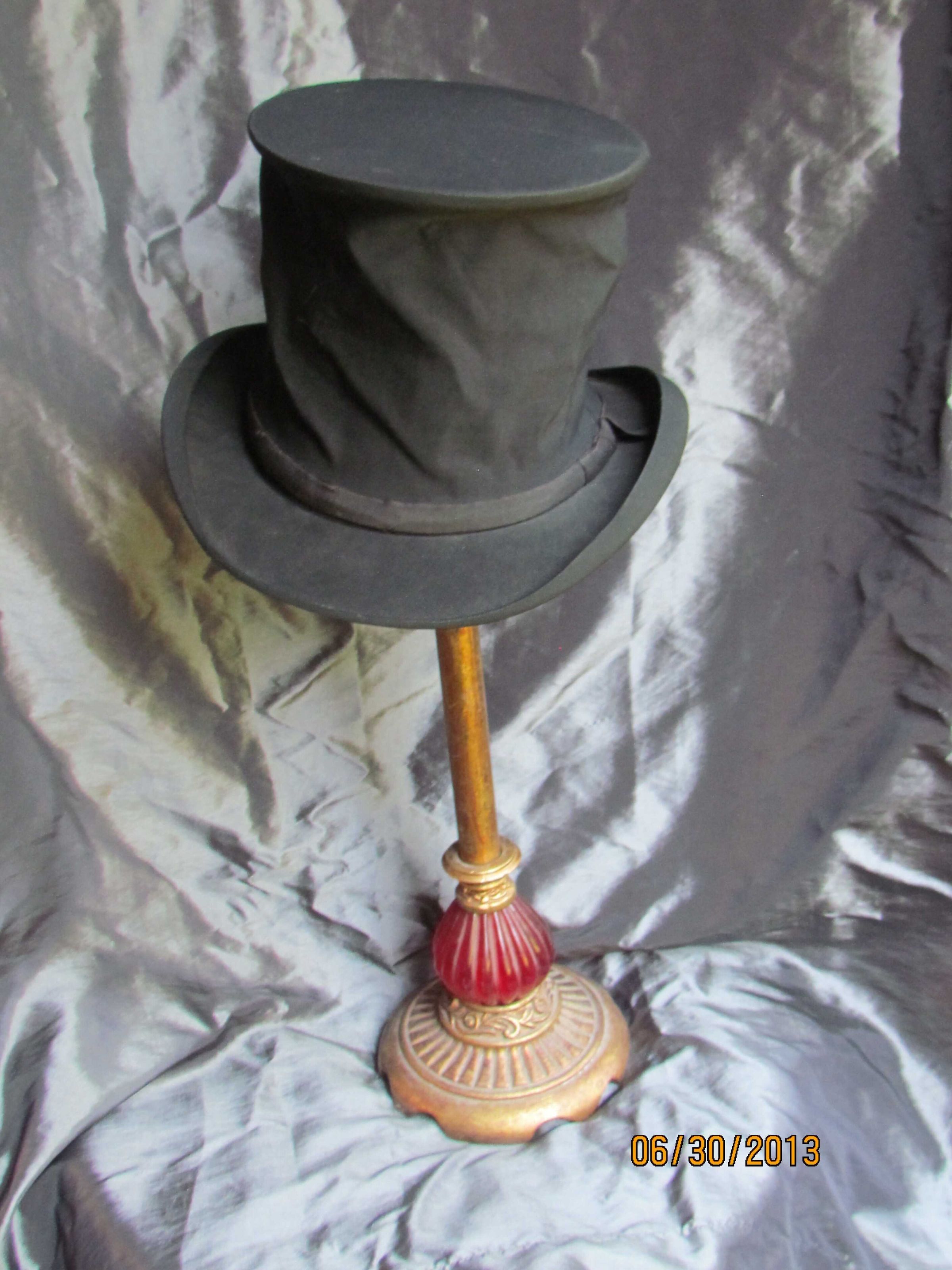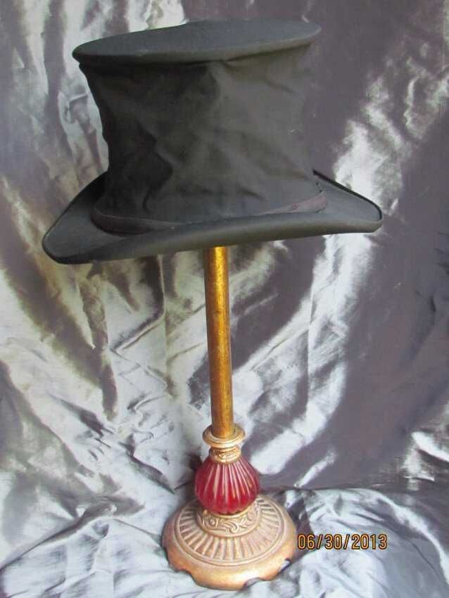 Hat, wool and silk gabardine collapsible top hat with satin lining and brim rolled on sides. Inside label reads, "Fisher and Co. San Francisco".Collection