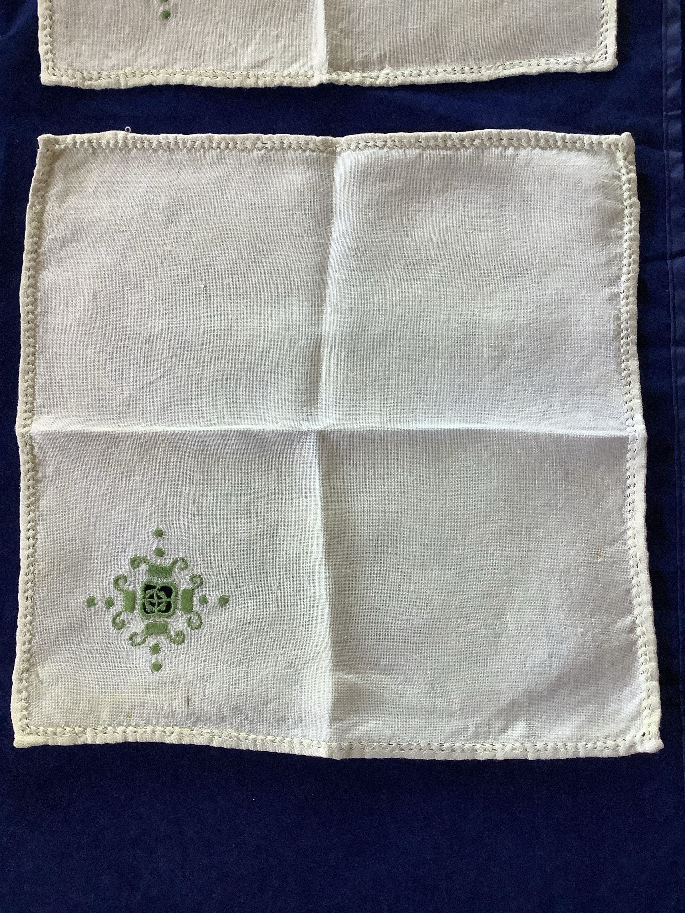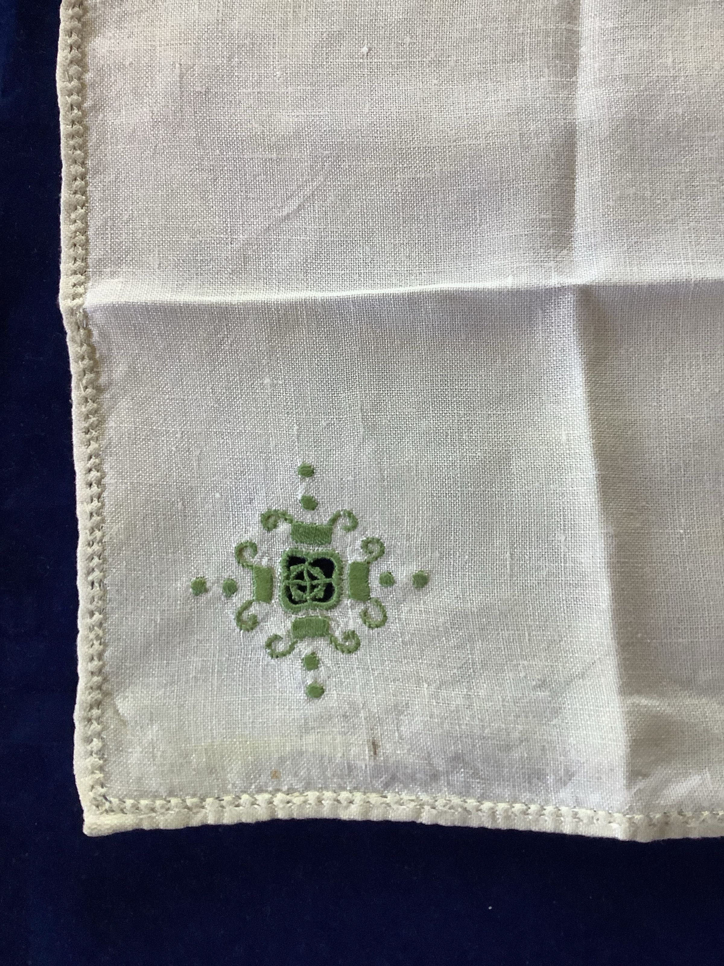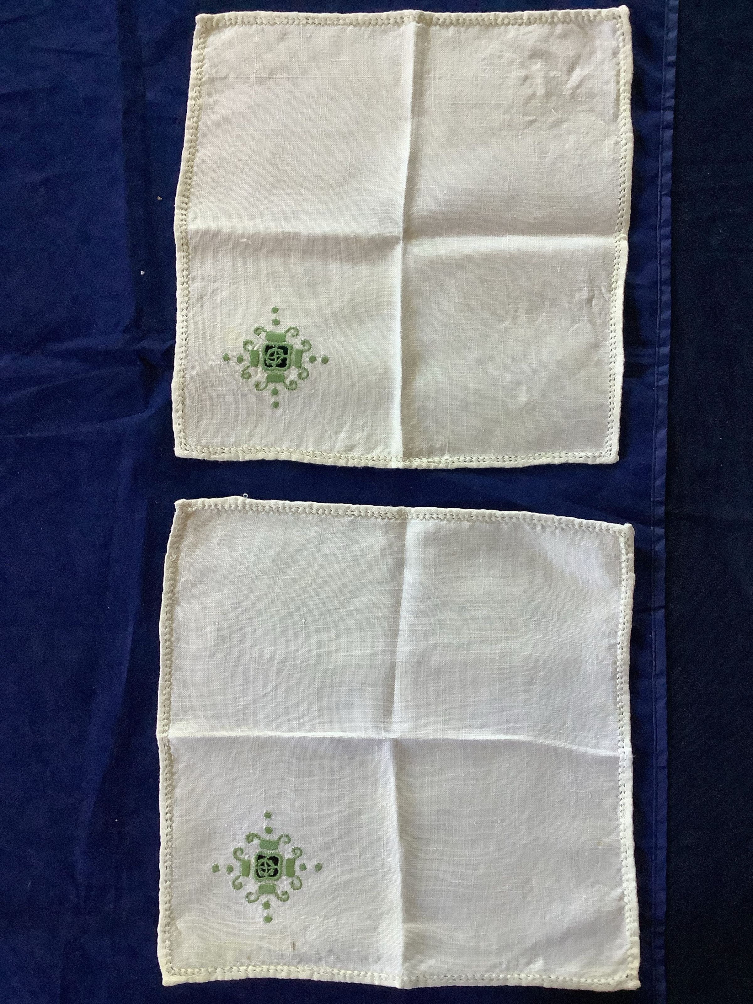 Two square handkerchiefs with a green embroidered design. The edges are hemmed