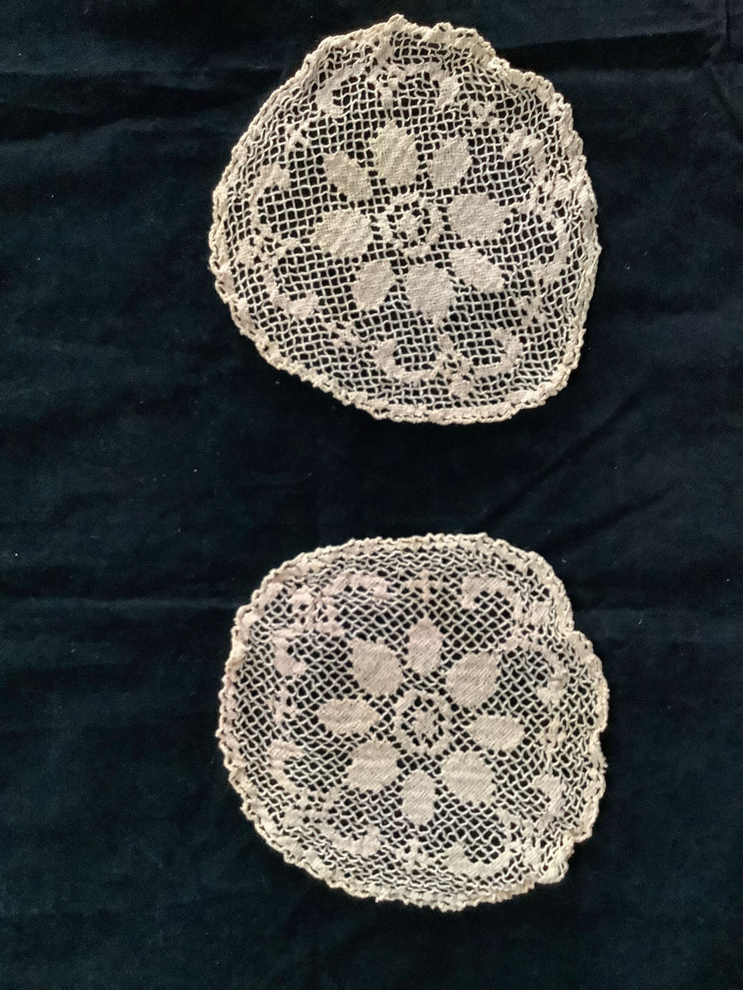 Two lace doily’s with a flower design in the middle. circular shape, somewhat misshapen into an oval. Both are in good condition