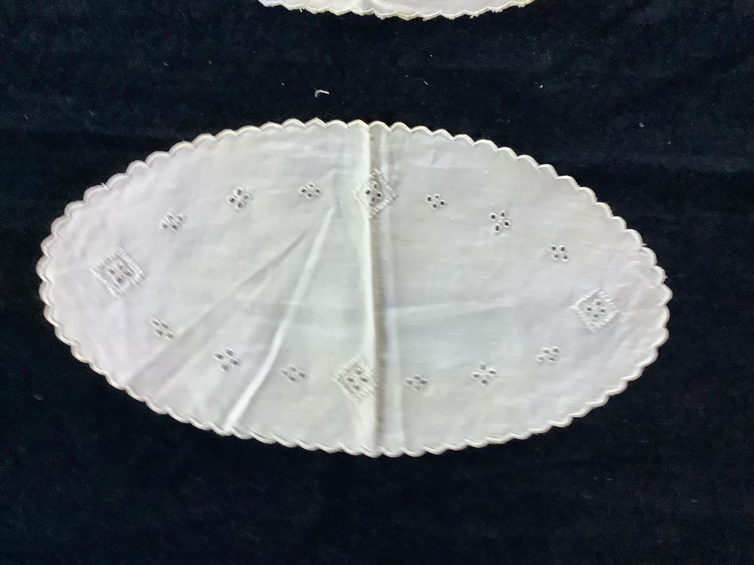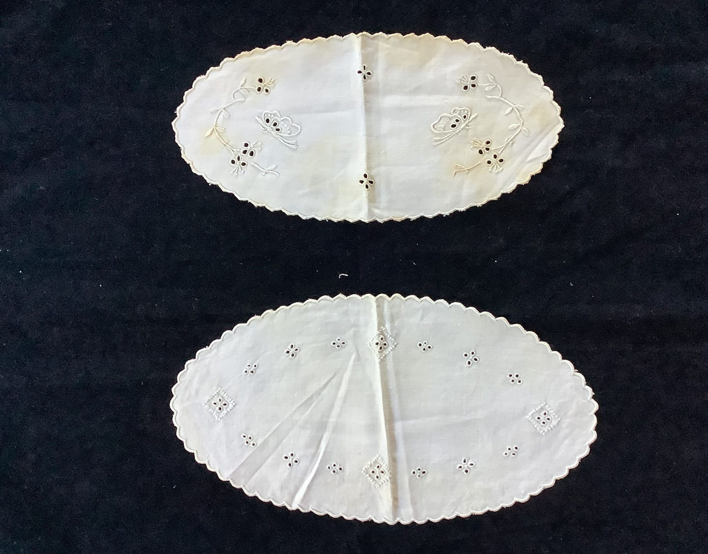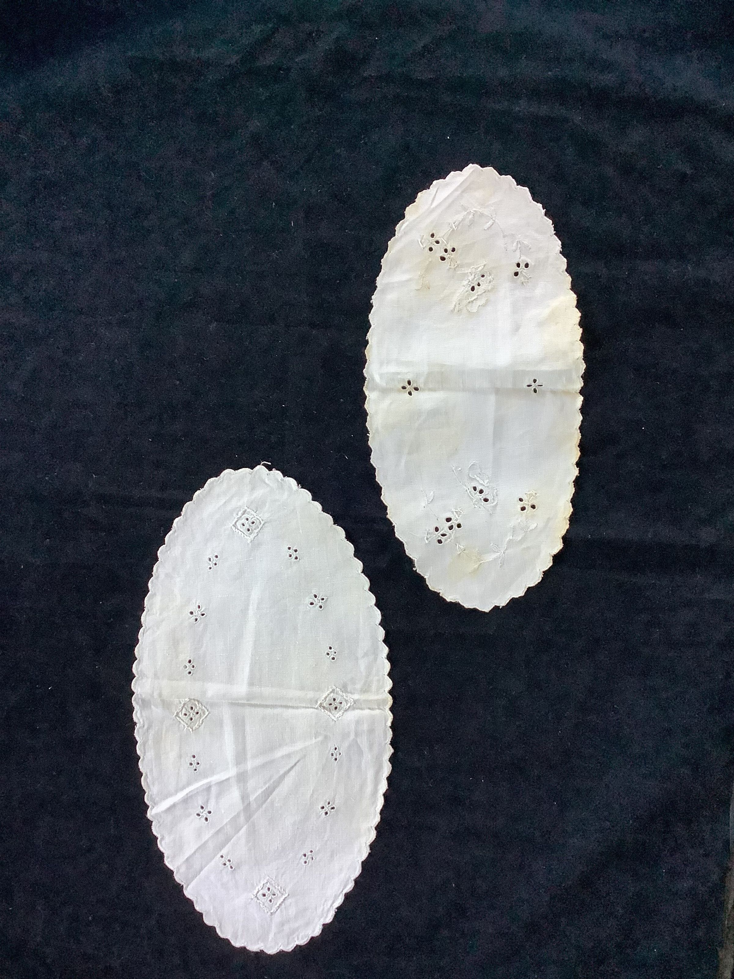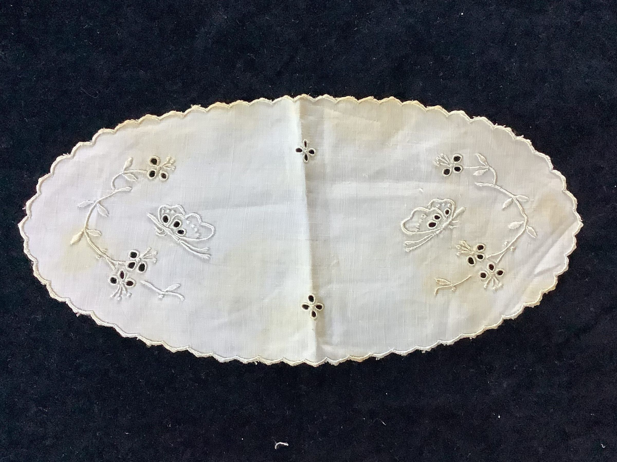 Two small embroidered oval decorative pieces. One has butterflies with drawn holes and the other has square designs with drawn holes
