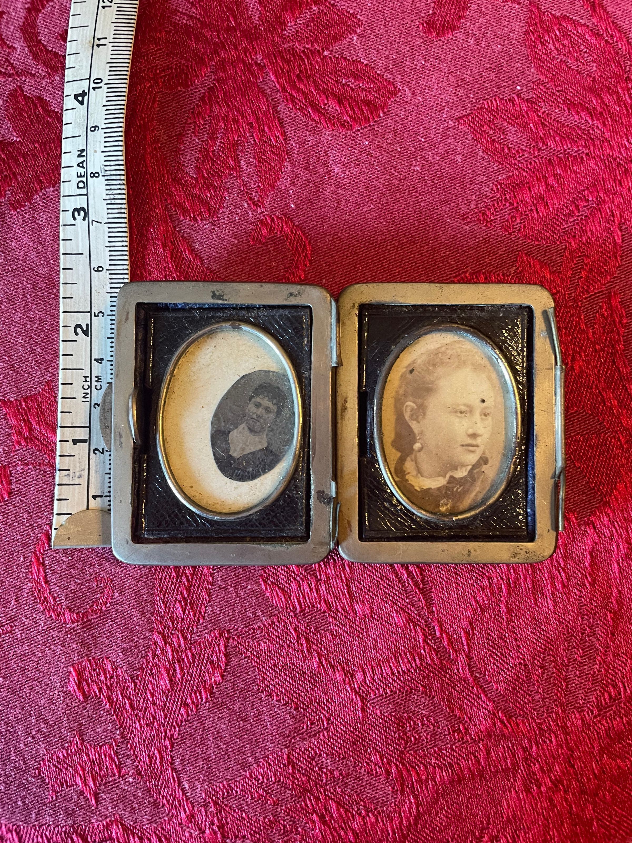 Two small photographs in black and gold frames that were previously connected but the latch has since broken.
