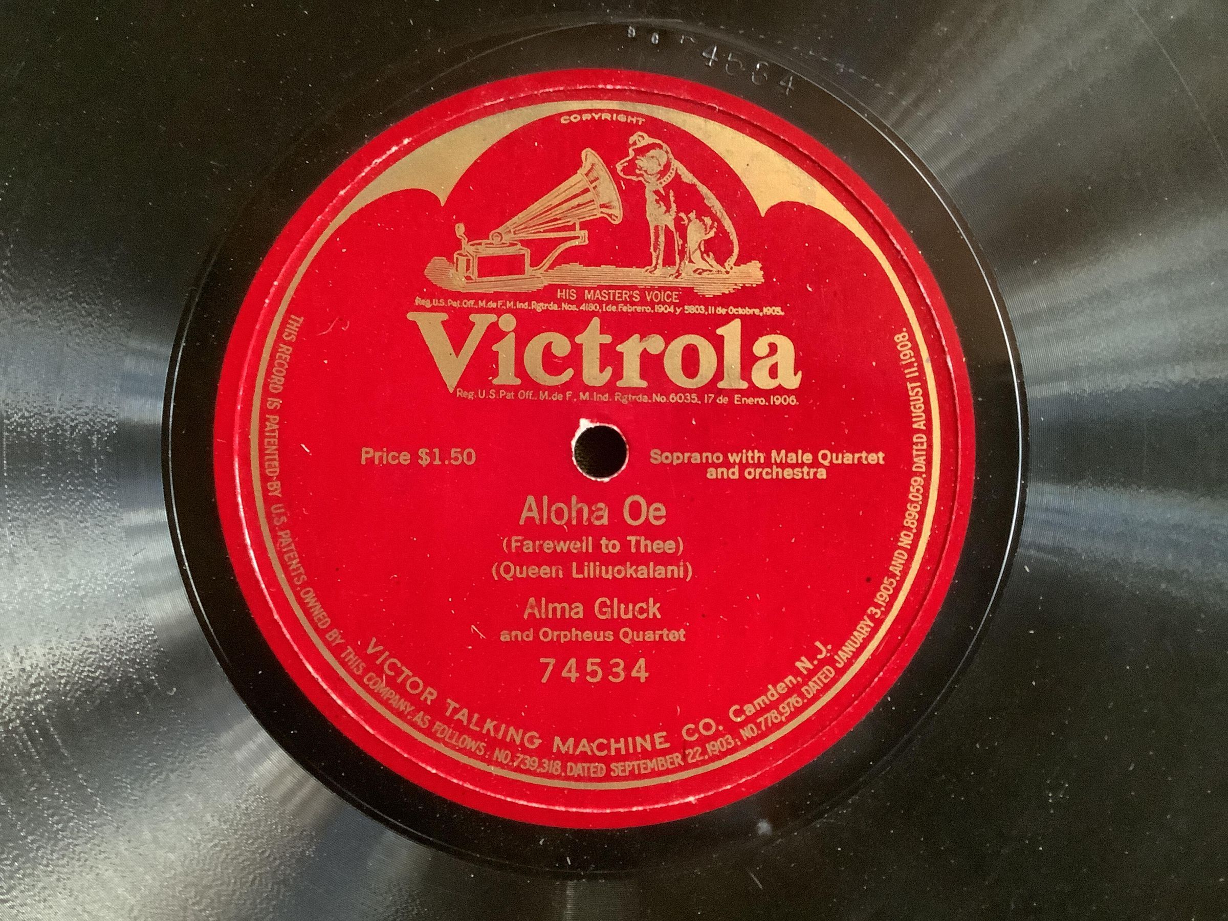 Victrola record. Aloha Oe (Farewell to Thee), Queen Liliuokalani. Soprano with Male Quartet and Orchestra. Alma Gluck and Orpheus Quartet. 74534.Create Date