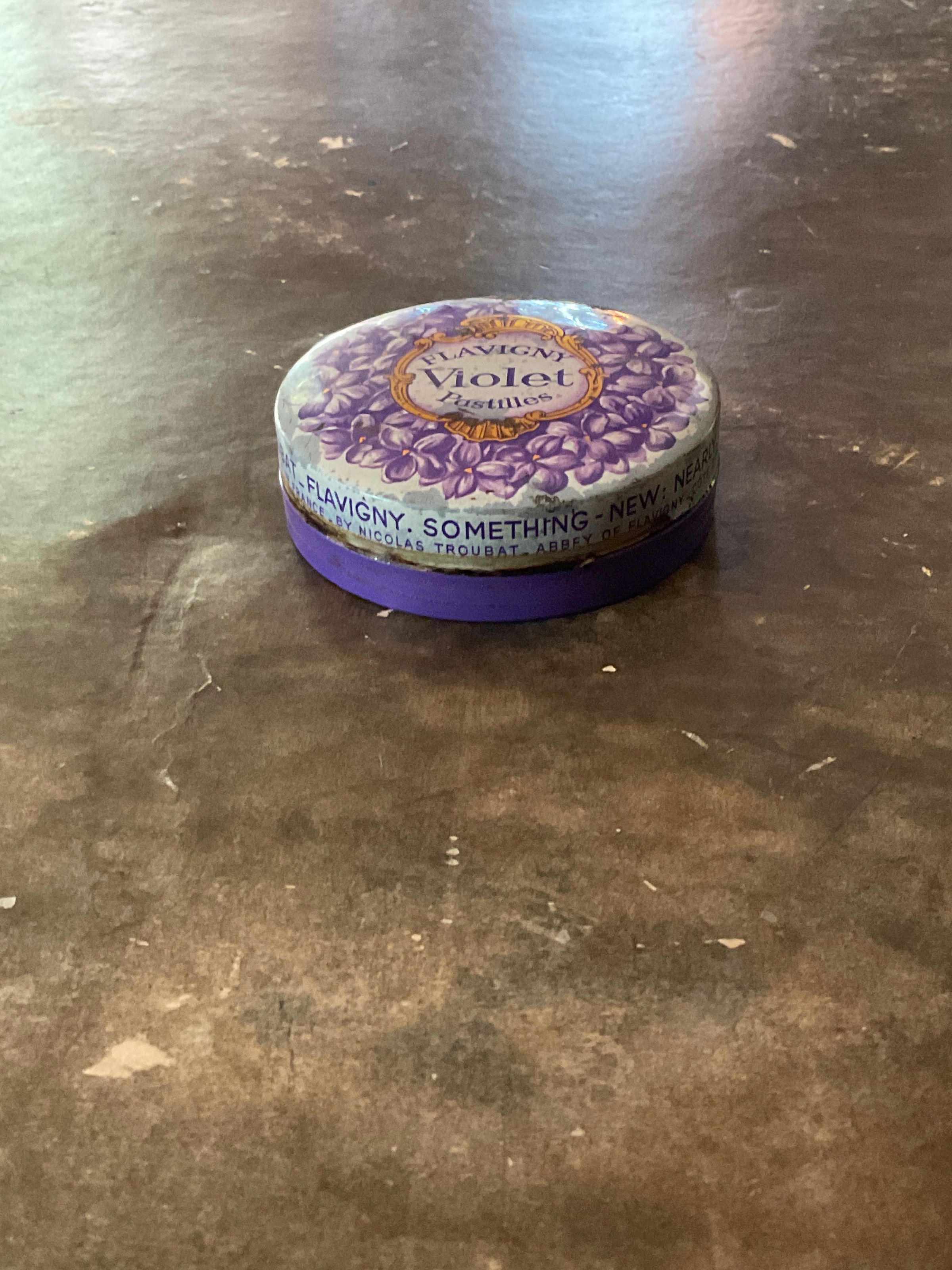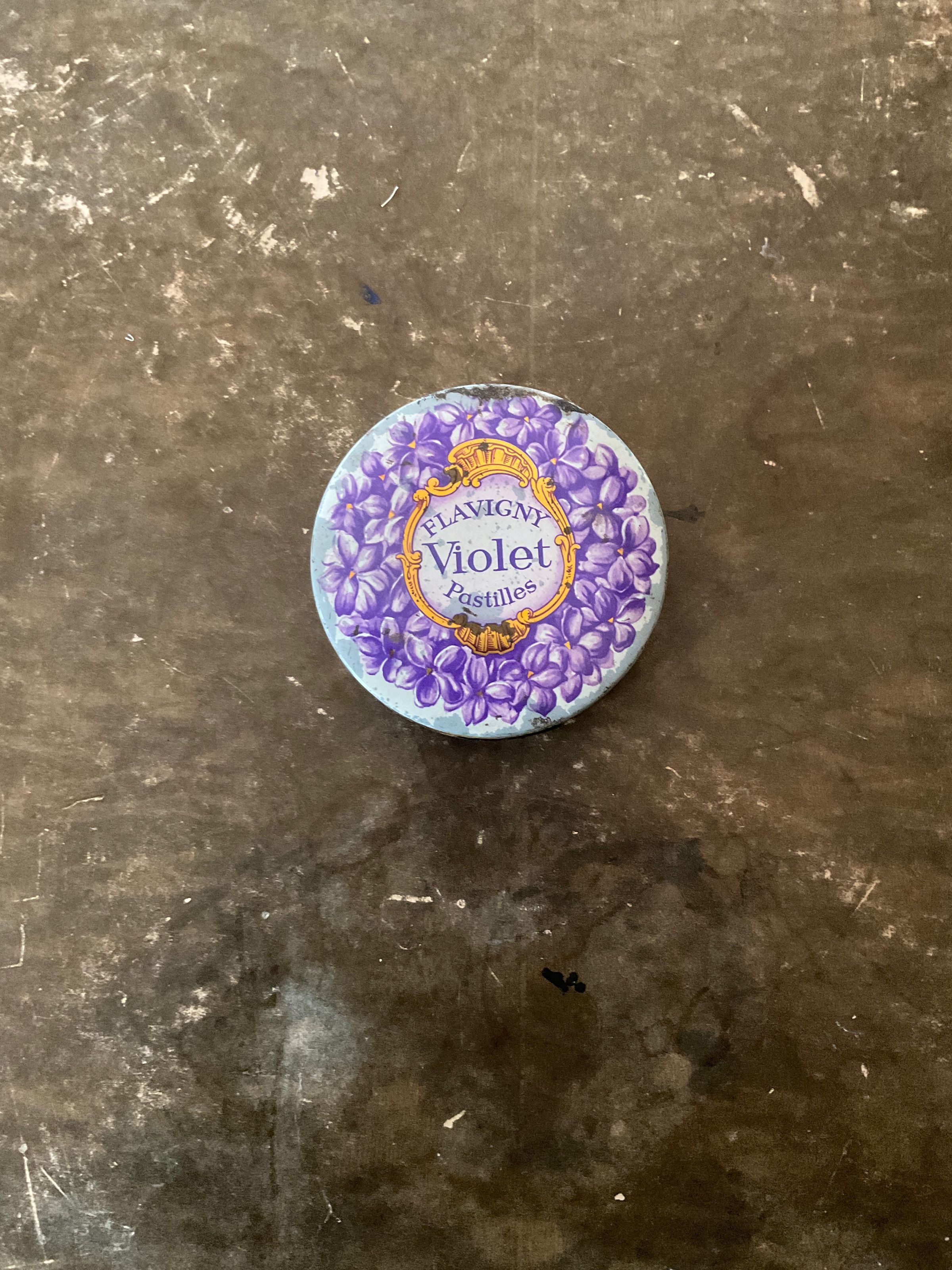 Anis de Flavigny Violet Pastilles are coated with fine layers of sugar and an all-natural Violet flavoring, featuring an aniseed in its center. The tin has violets on the front. This candy is made of a grain of aniseed coated in sugar. In the 17th century it took around 6 months to make, but now it takes only 15 days.
