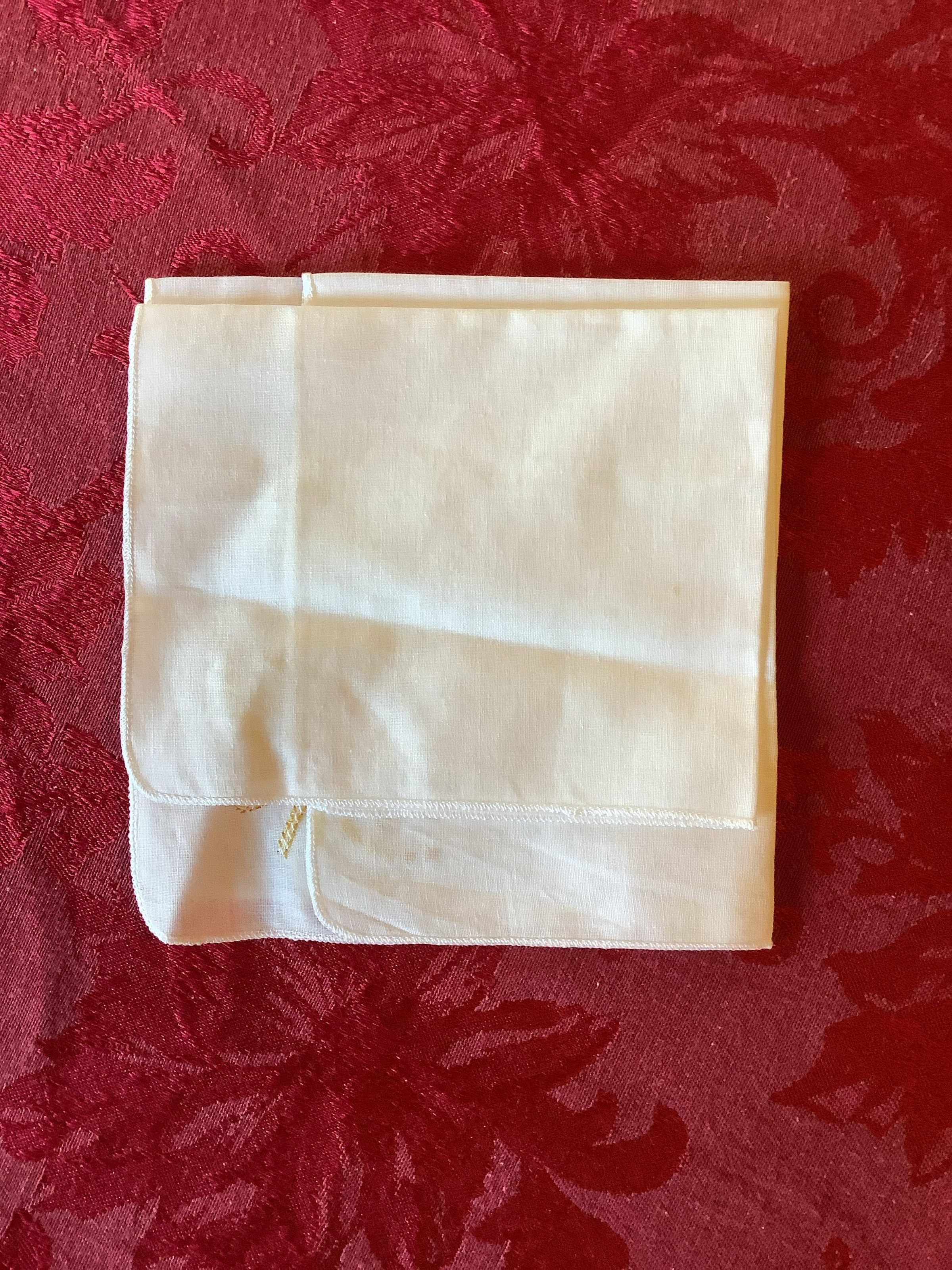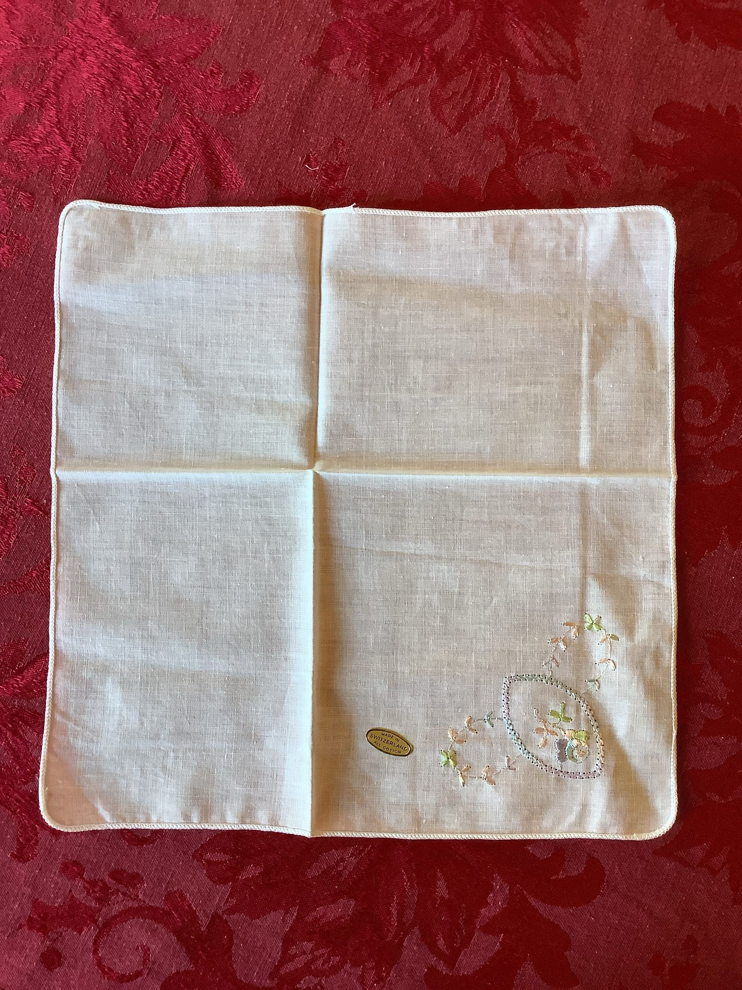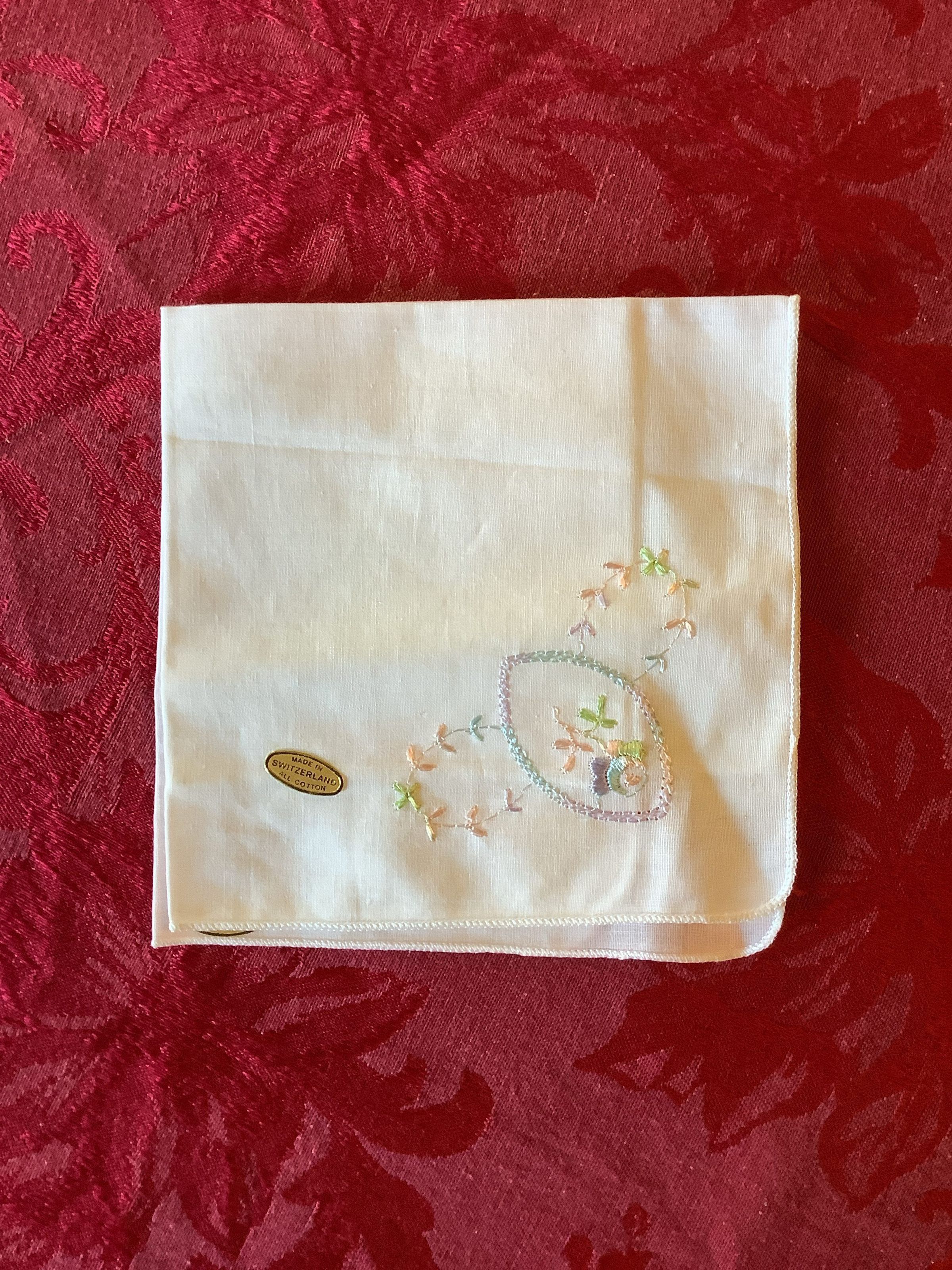 A white handkerchief with multicolored floral embroidery and a “made in Switzerland all cotton” gold sticker.