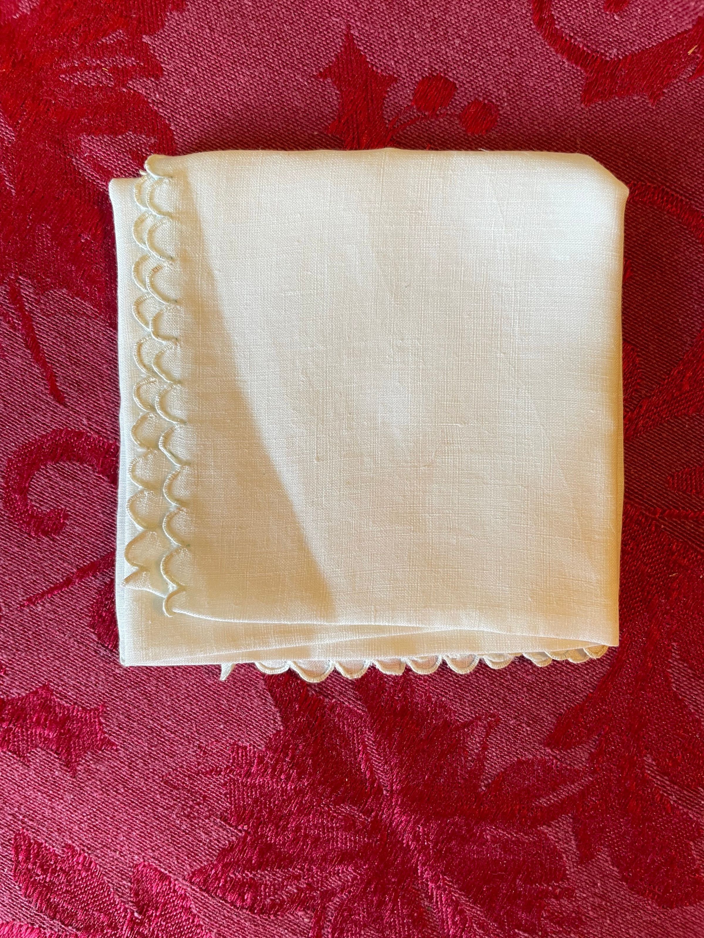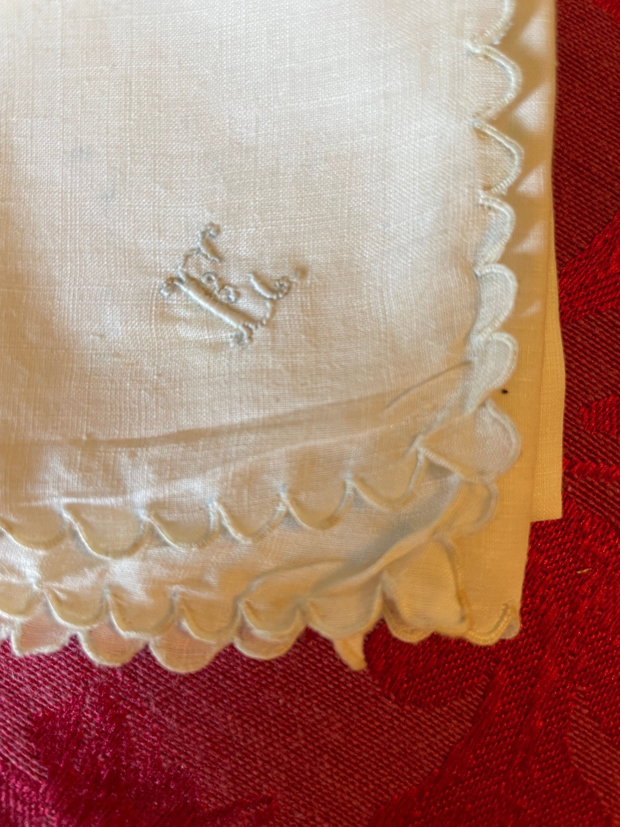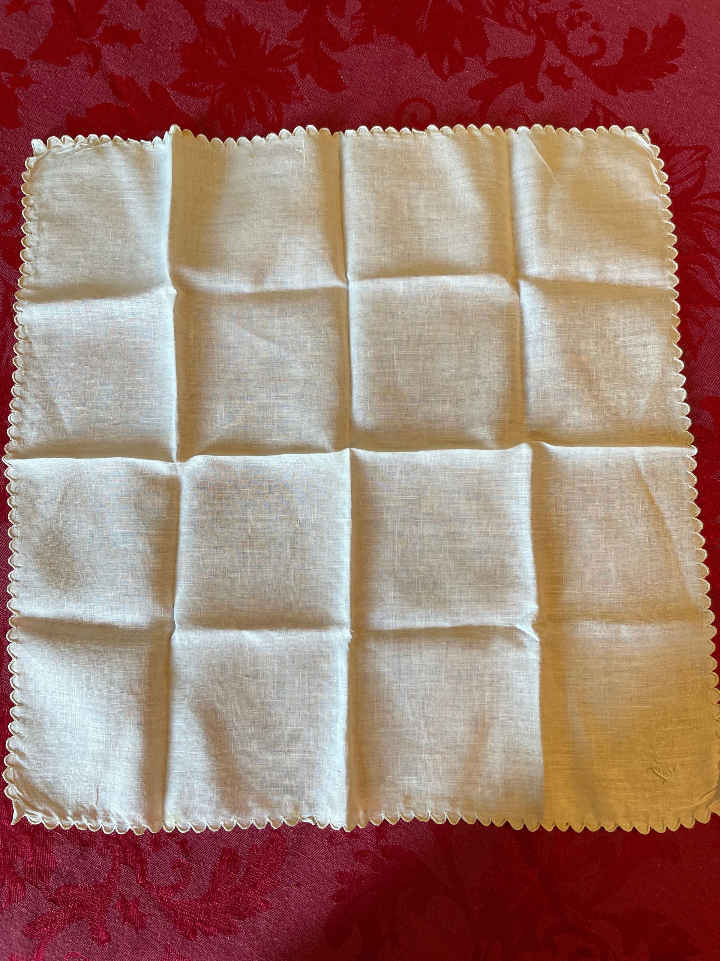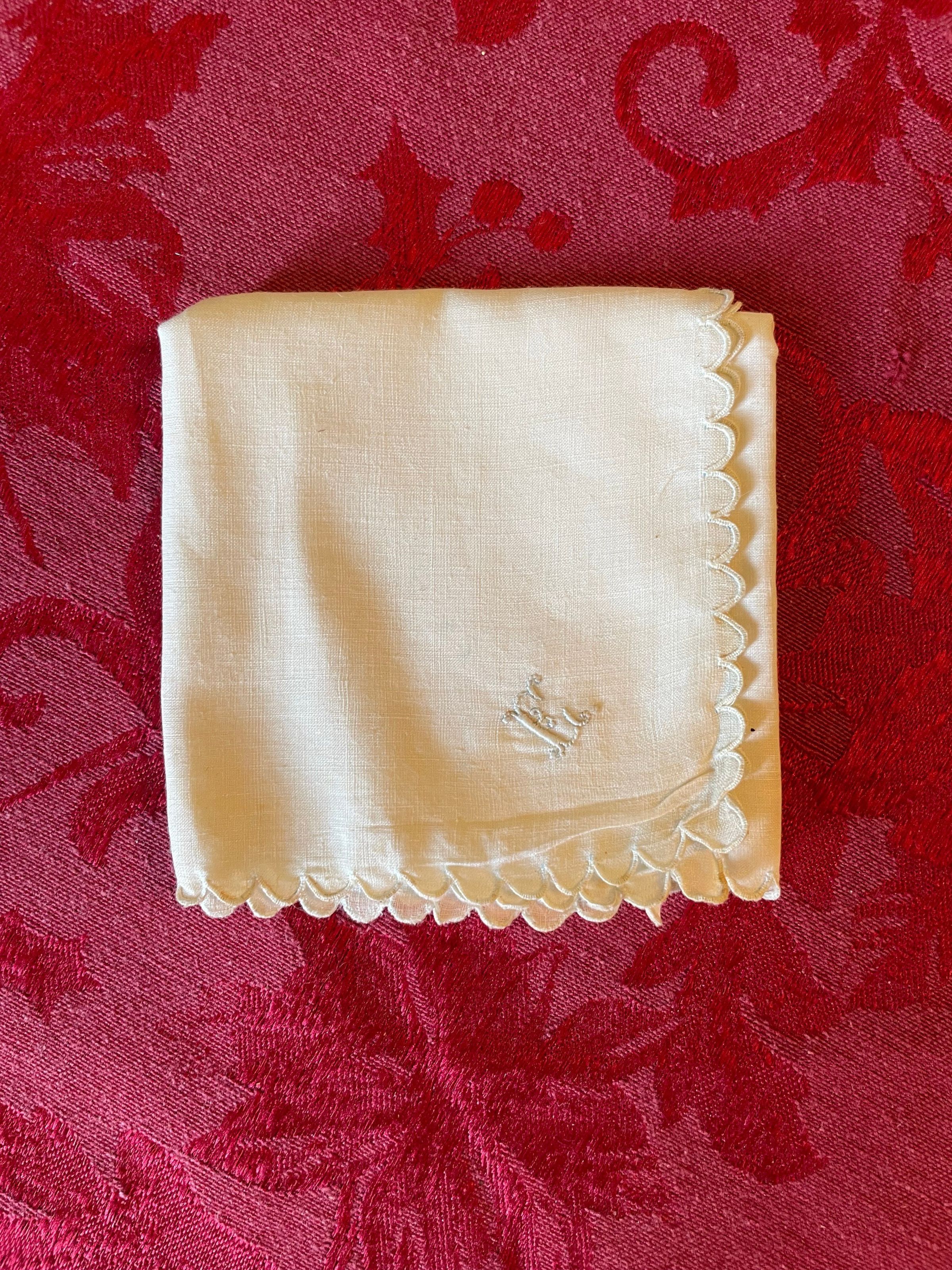 A white embroidered handkerchief with scalloped edges and the initials “E.C” for Emelita Cohen. It appears to be mostly unused.