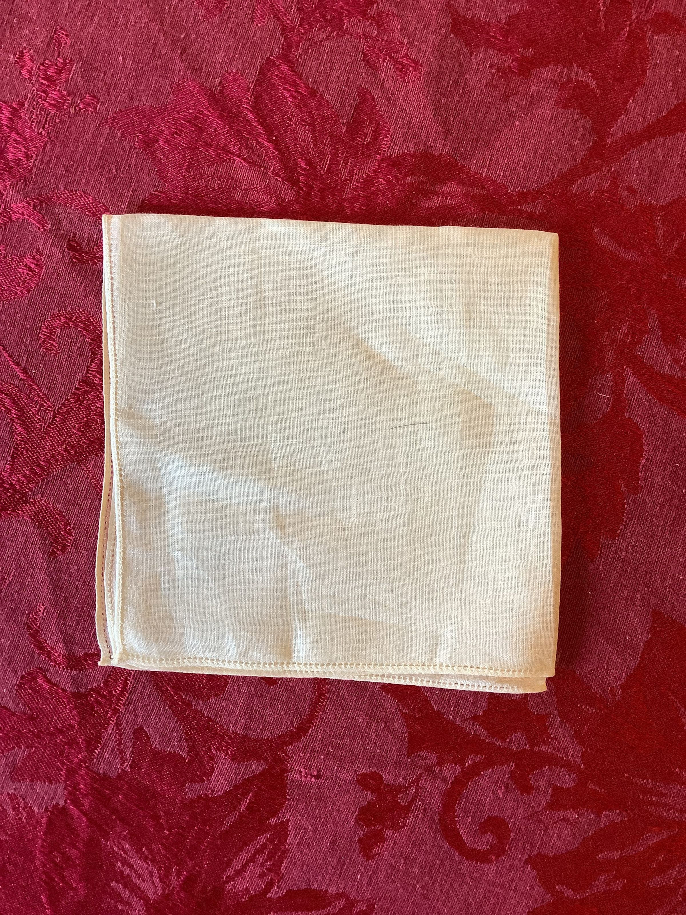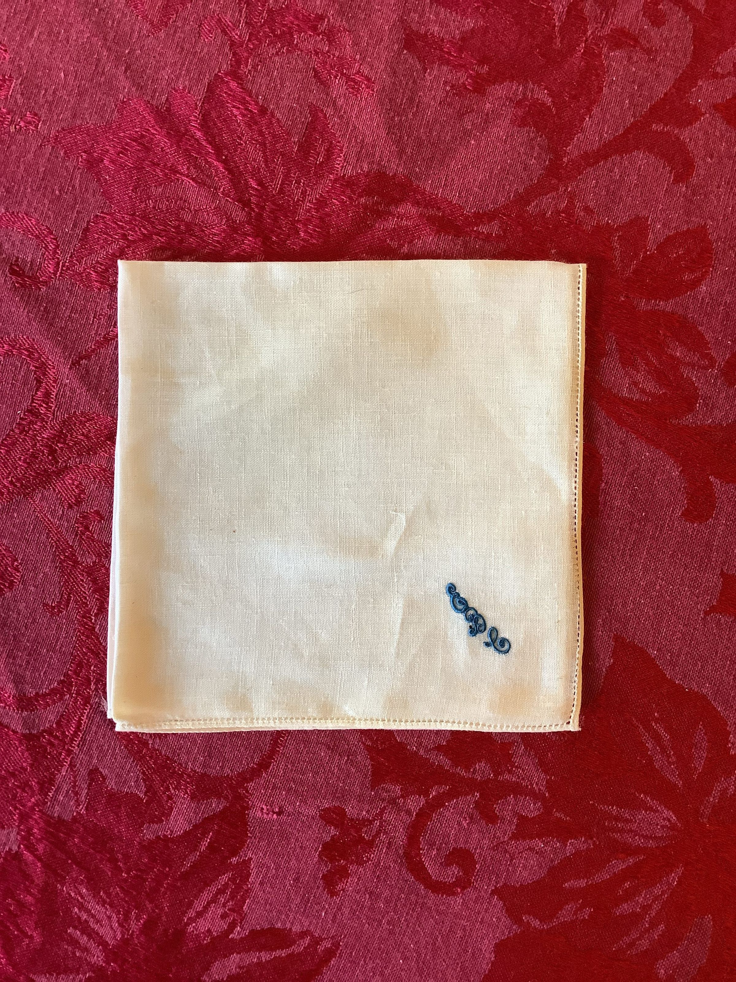 A white embroidered handkerchief that’s been initialed “EEC” for Emelita Cohen. The embroidery is done in dark blue thread.