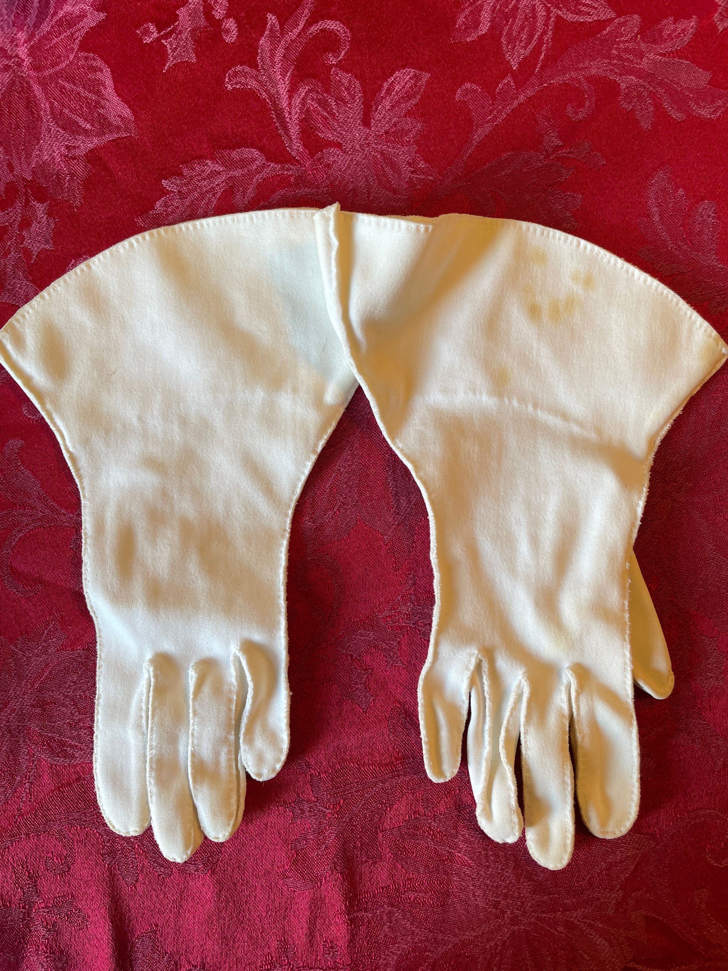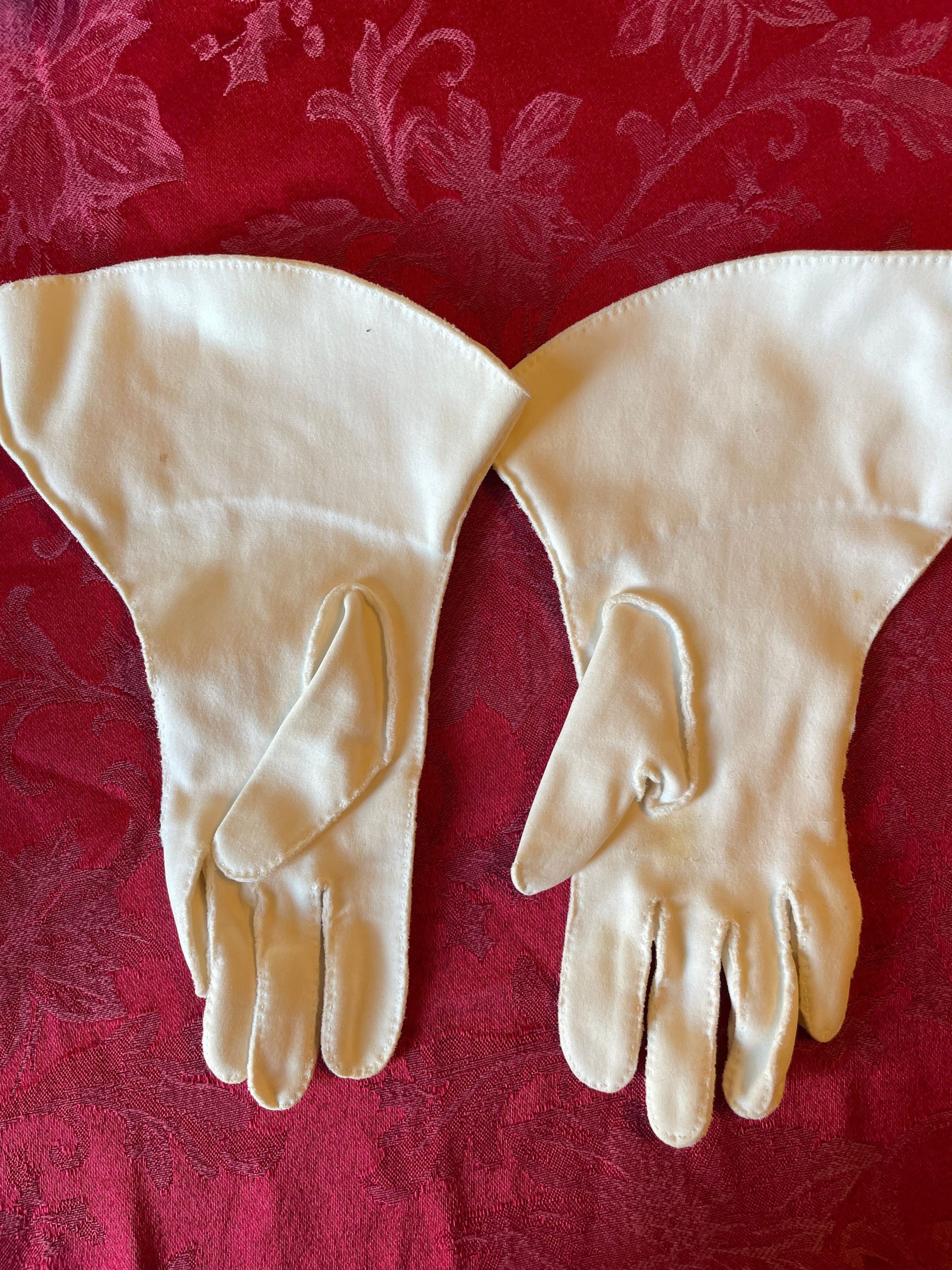 A pair of white gloves with flared openings whose fingers are accented by white stitching. Maker unknown.
