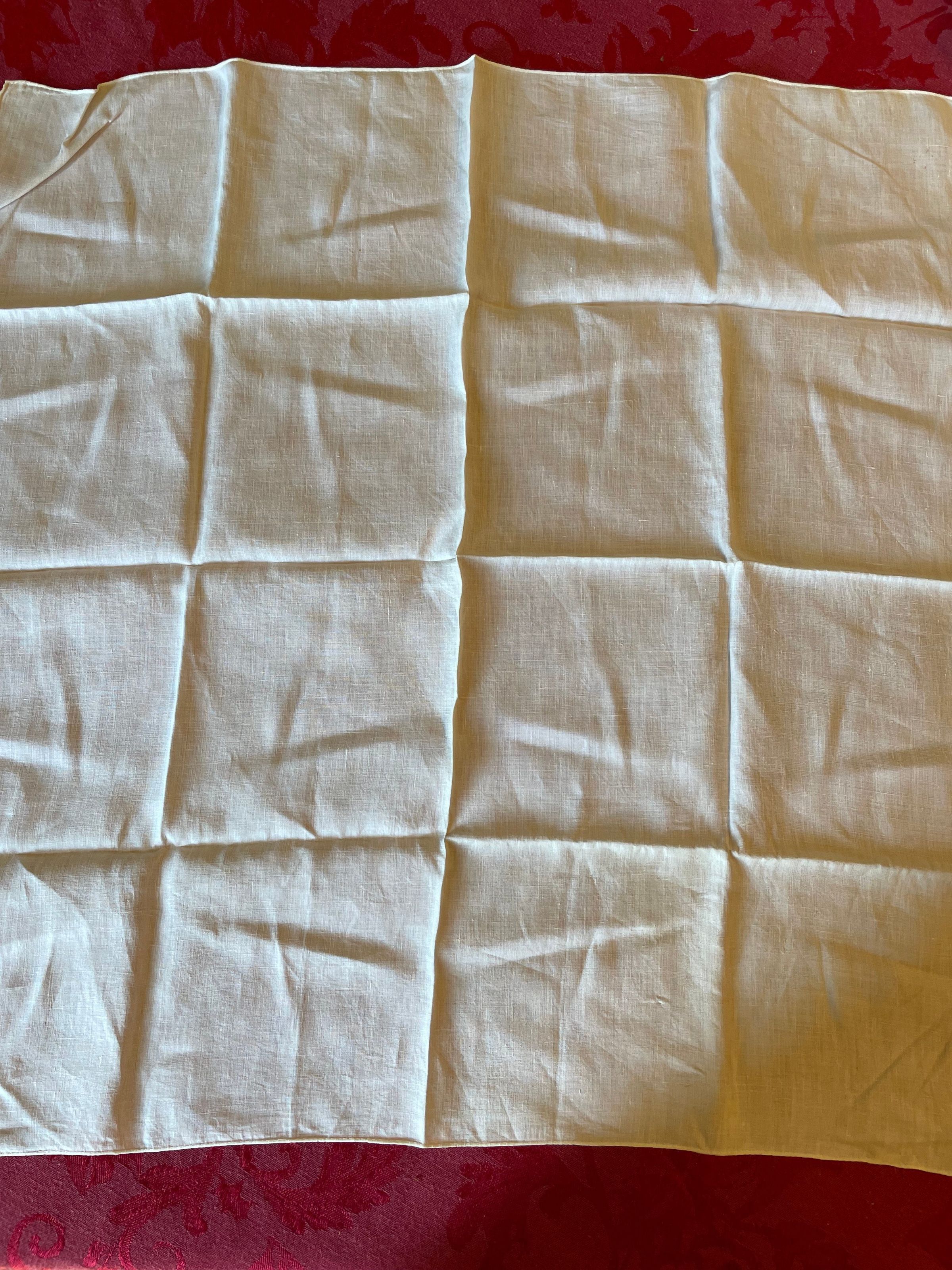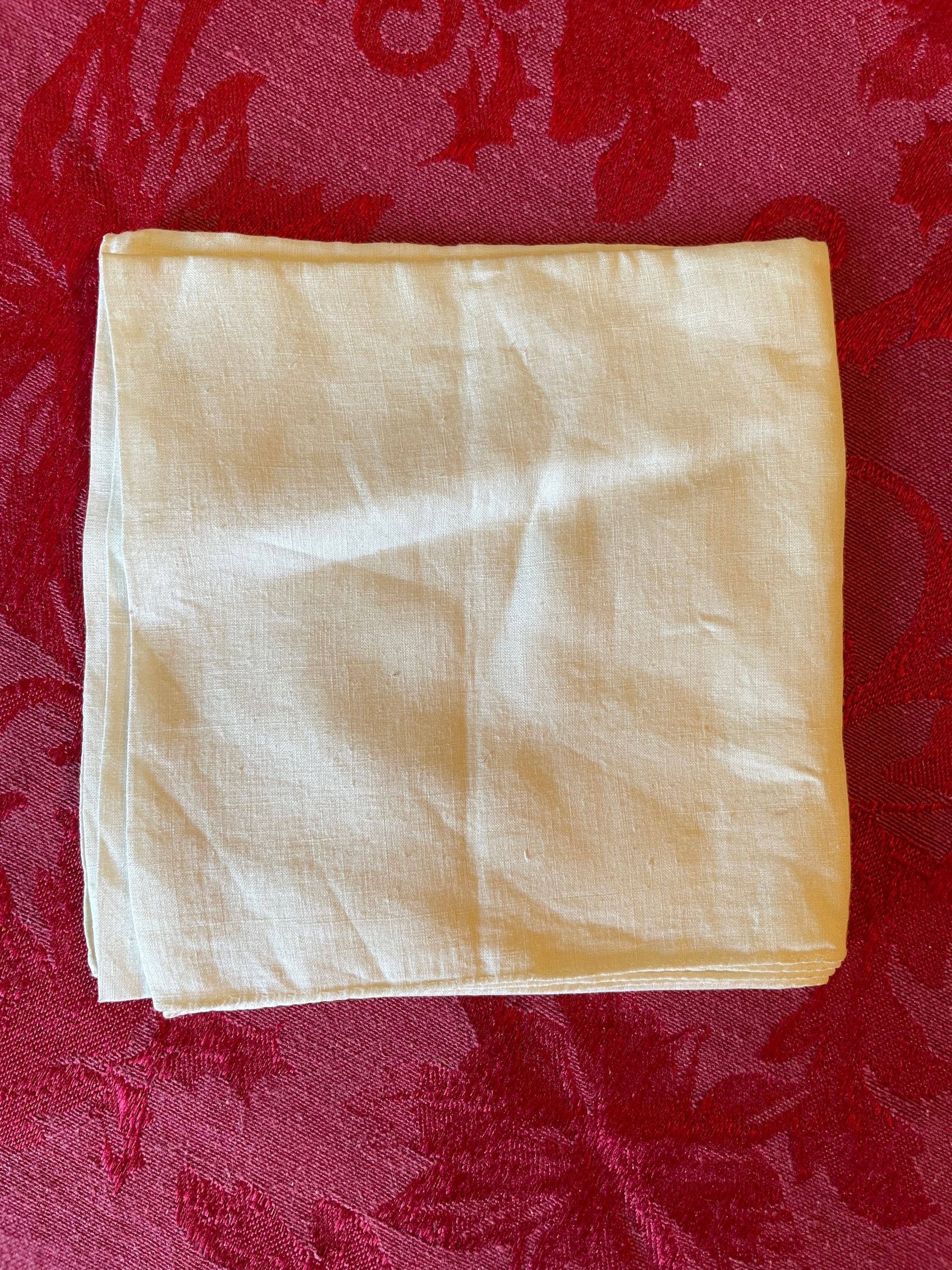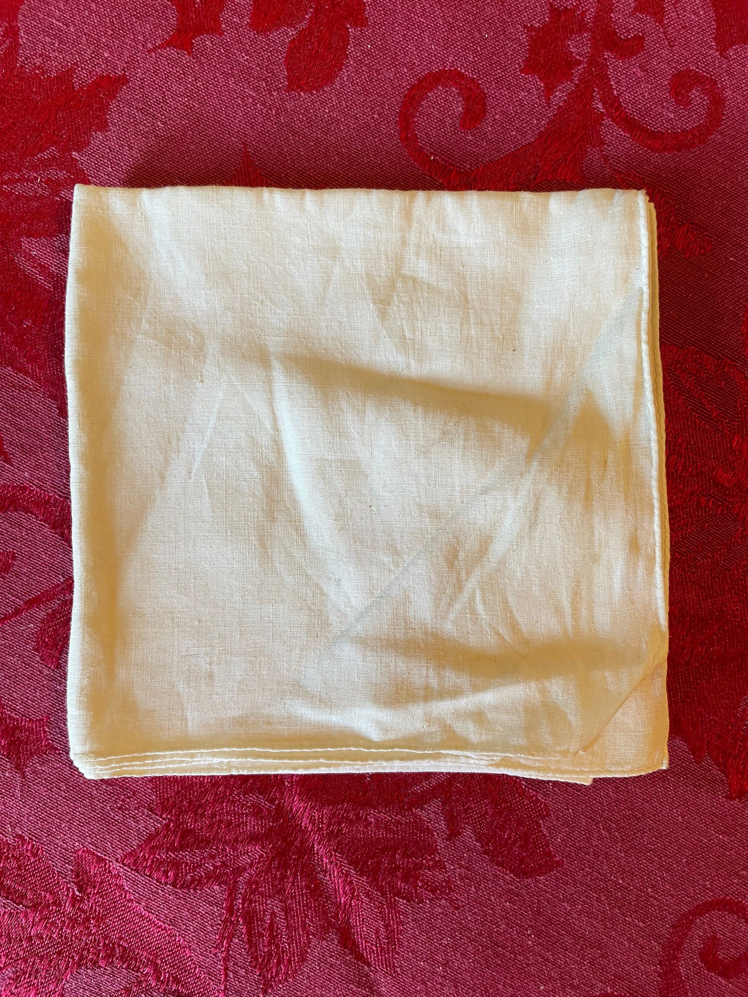 A plain white handkerchief that’s free or any patterns and adornment save for the stitching along the border.