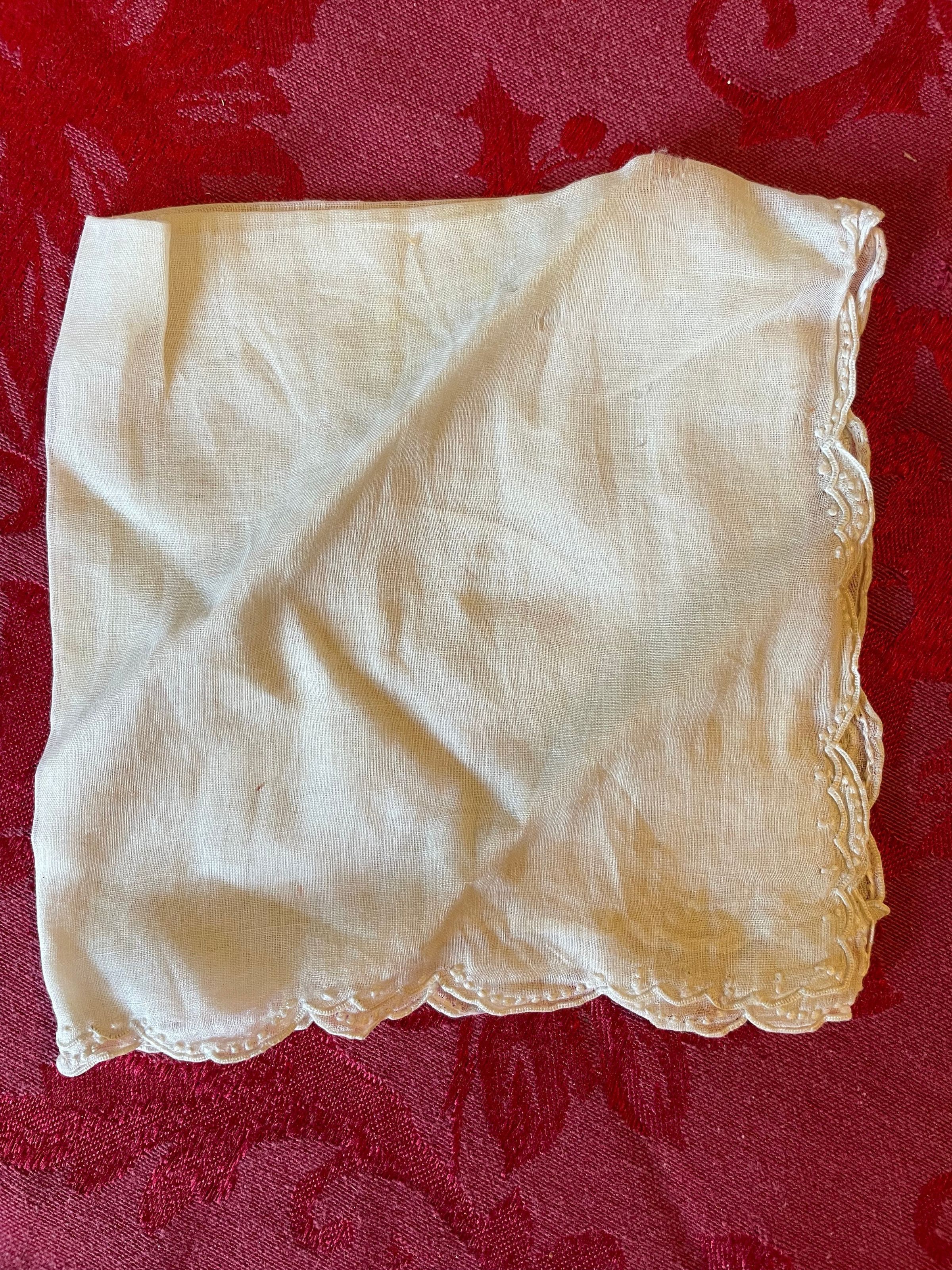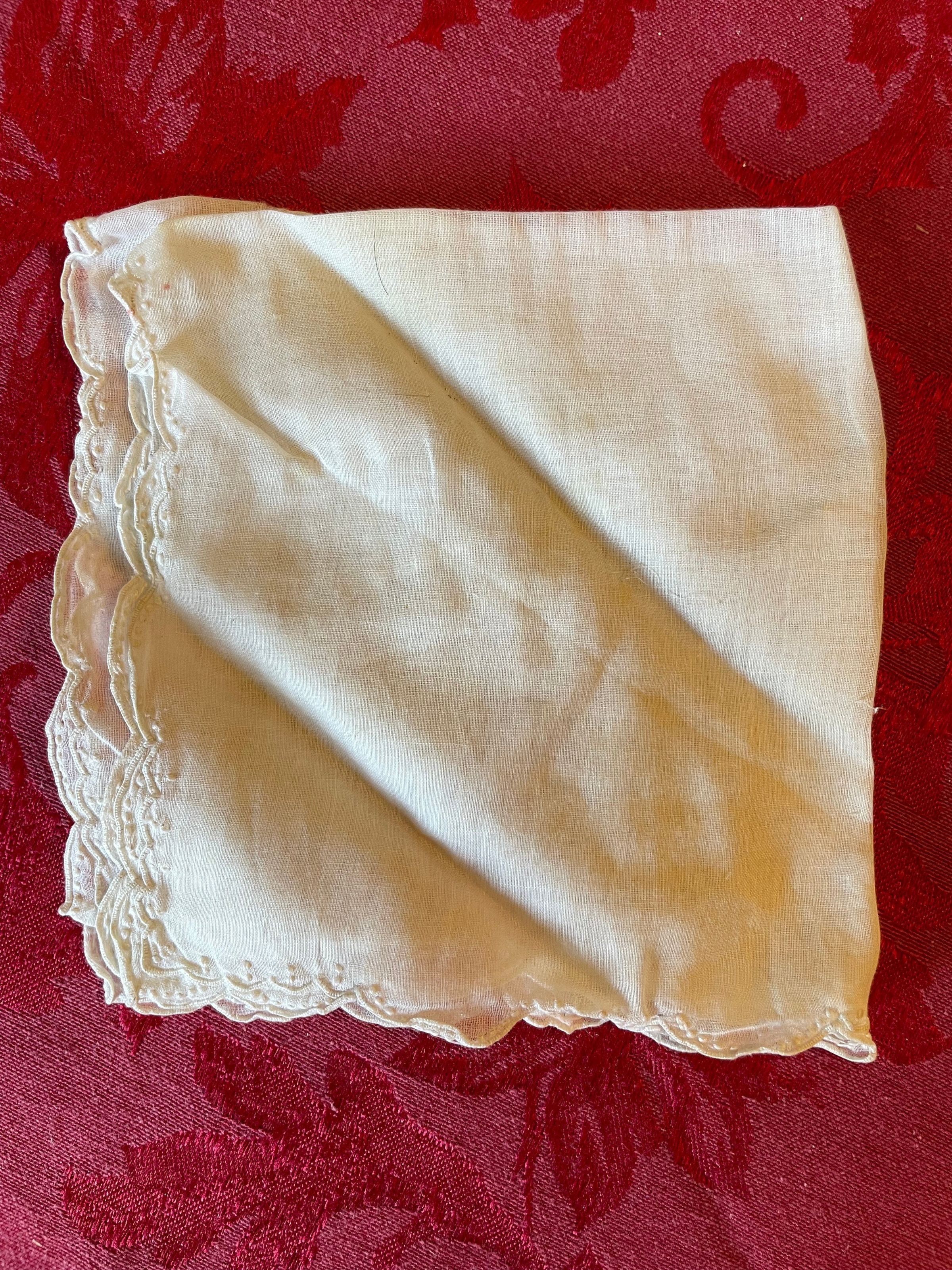 A plain white handkerchief free of patterns and adornment save for the scalloped, patterned border running along the edges and the embroidered dots.