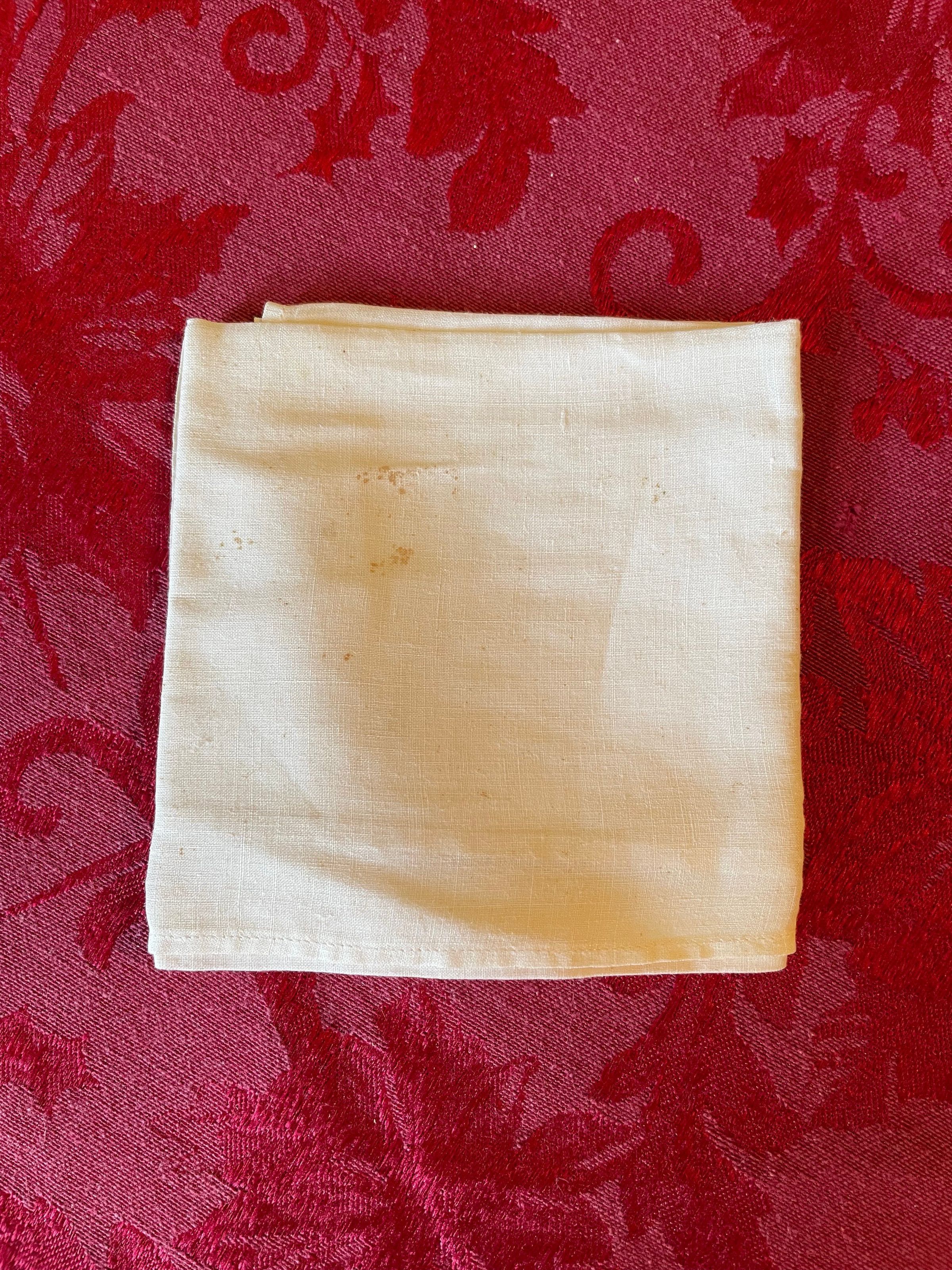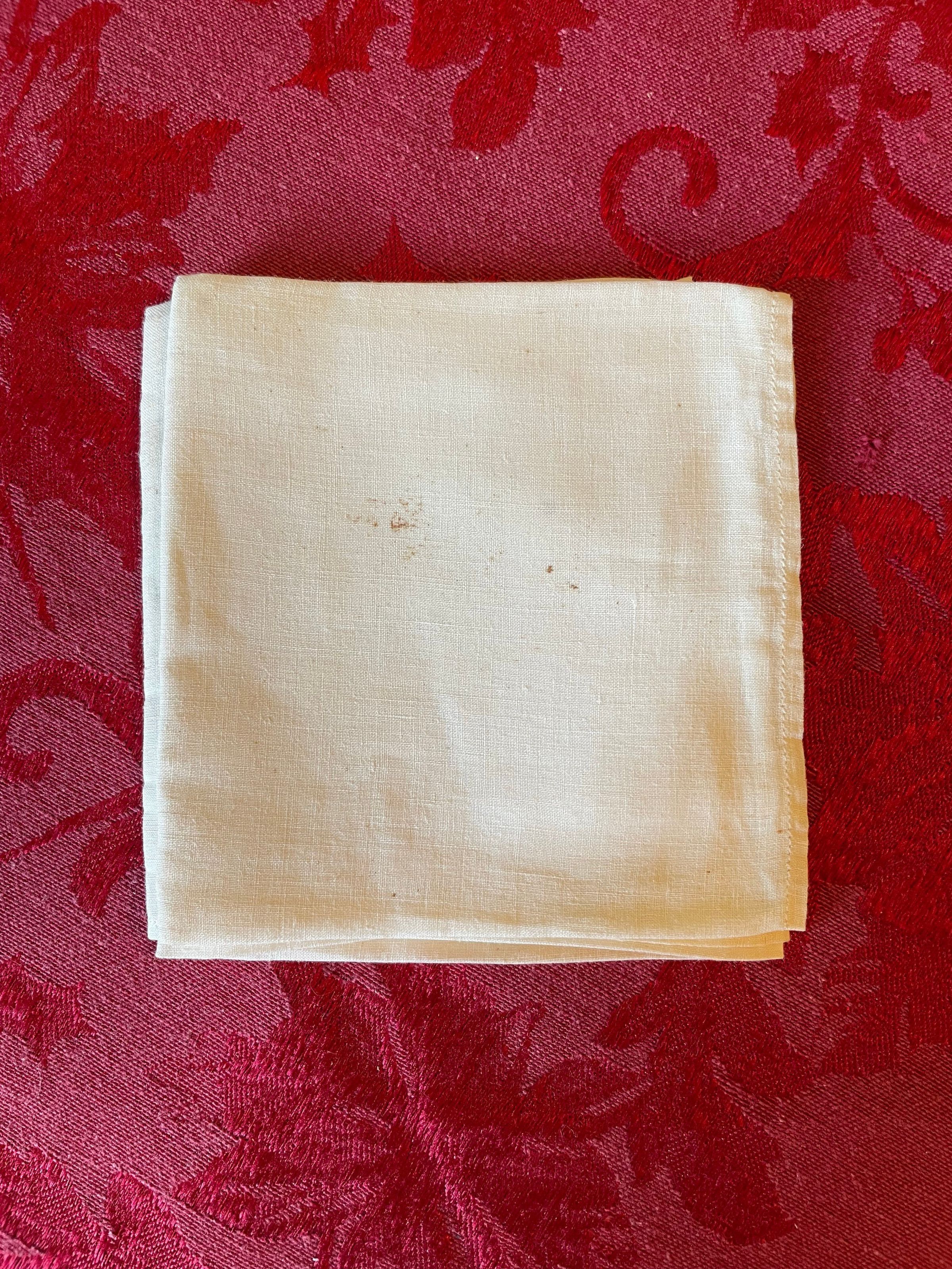 A plain white handkerchief with faint decorative stitching.