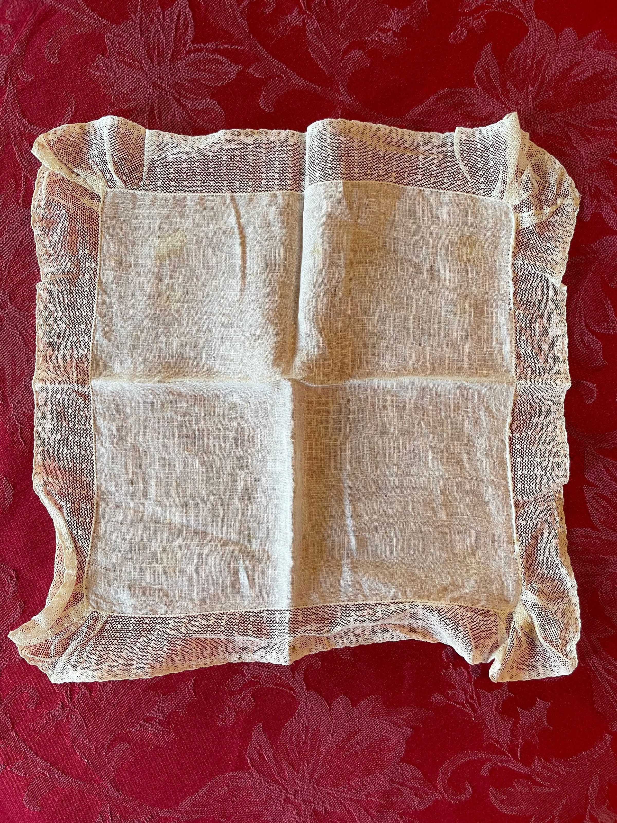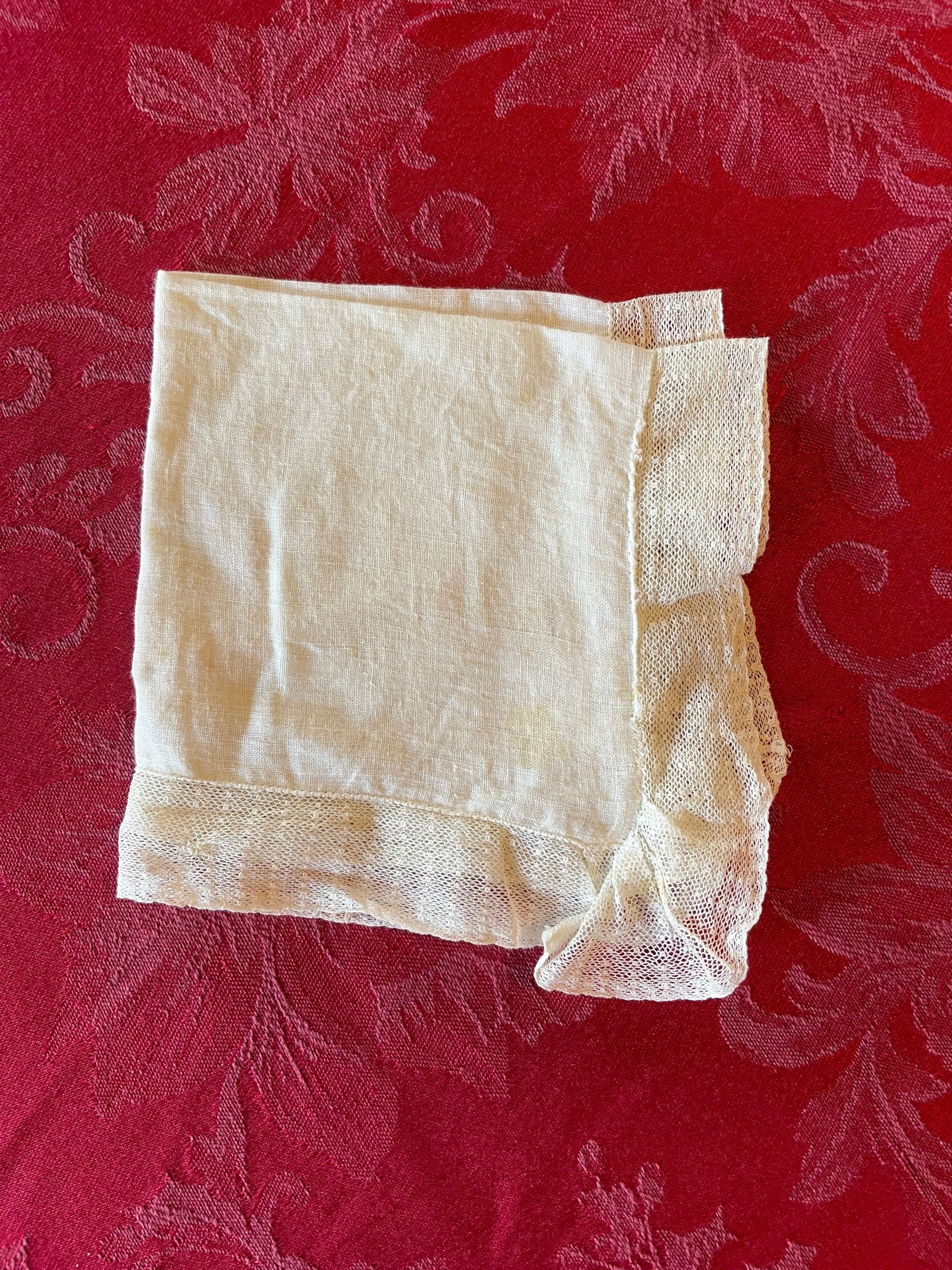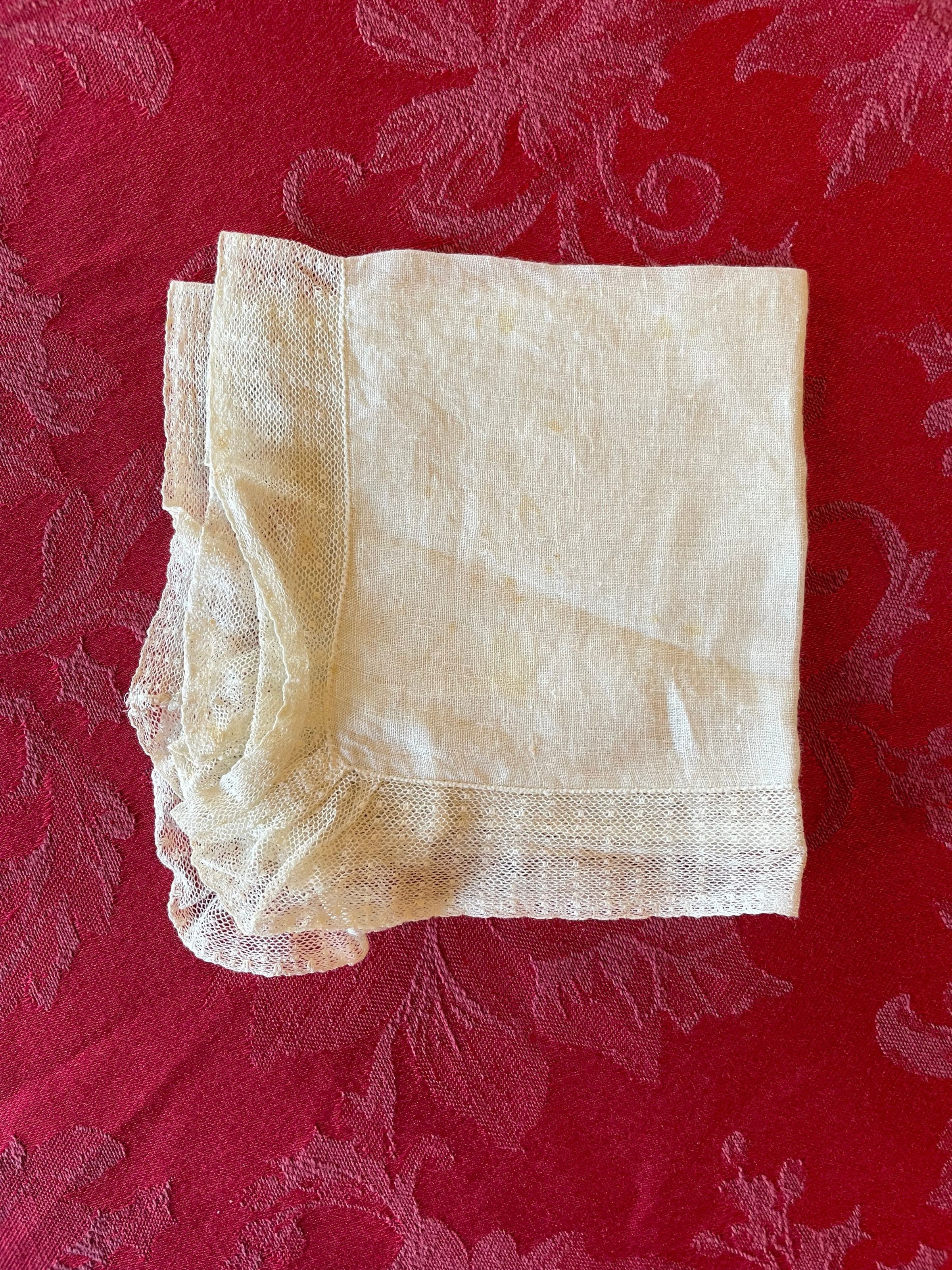 A white handkerchief with a lace trim and slight brown staining across the fabric. It’s not personalized or embroidered and the maker is unknown.