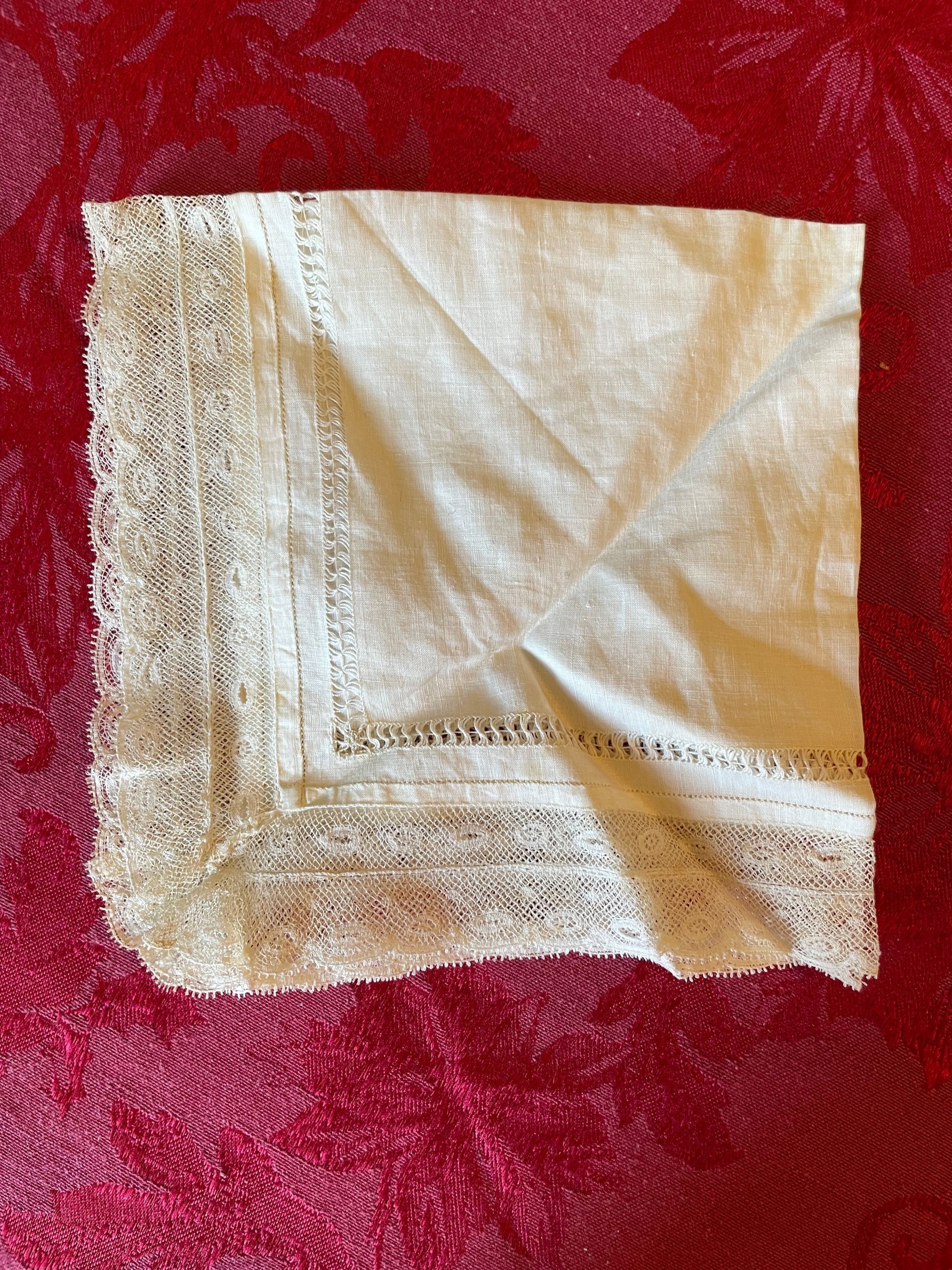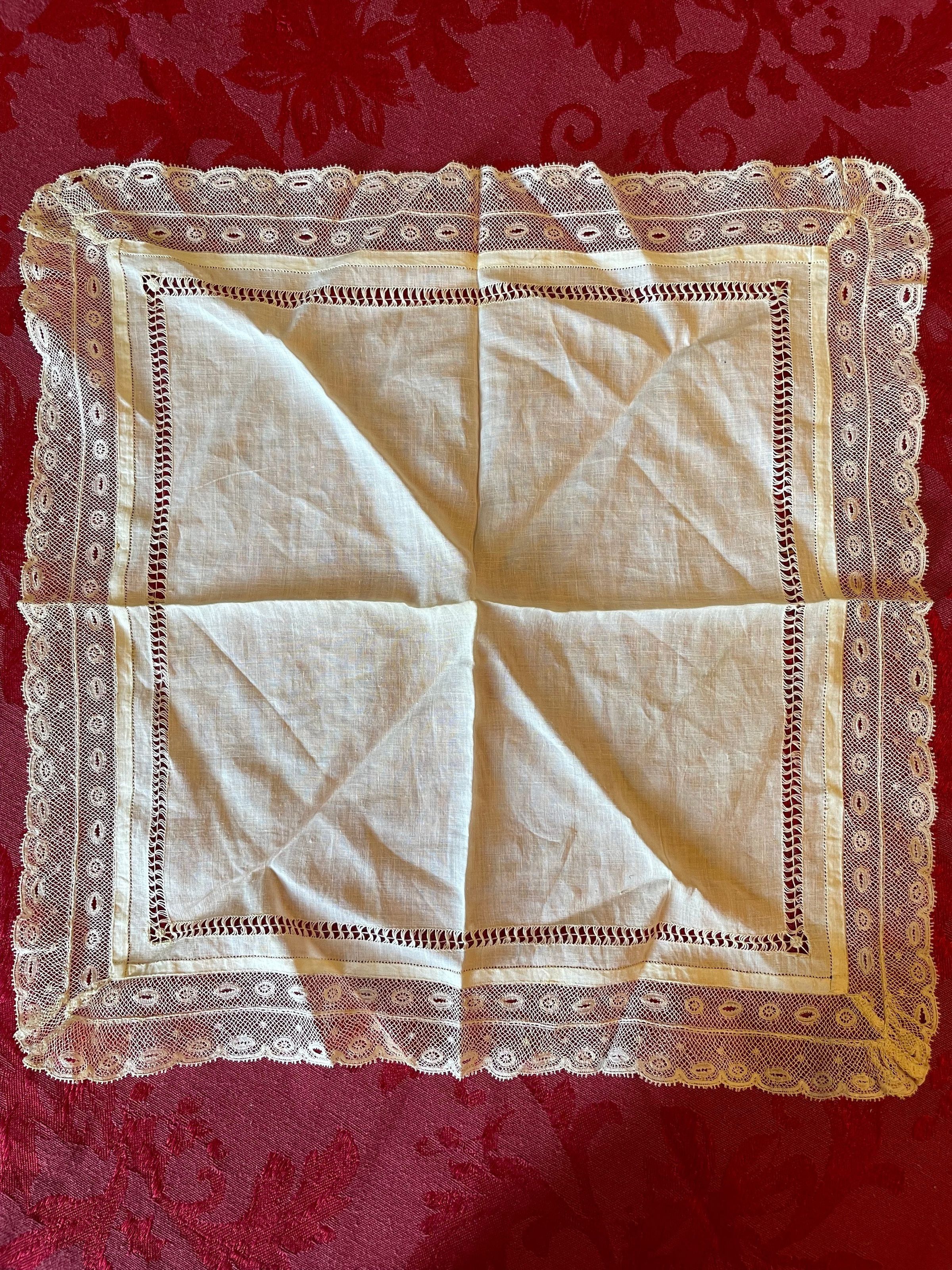 A white lace handkerchief with a type of open stitching running along the inside of the fabric. The lace border has little eyelets strewn throughout and continues that pattern all the way around. There is no visible staining.Create Date