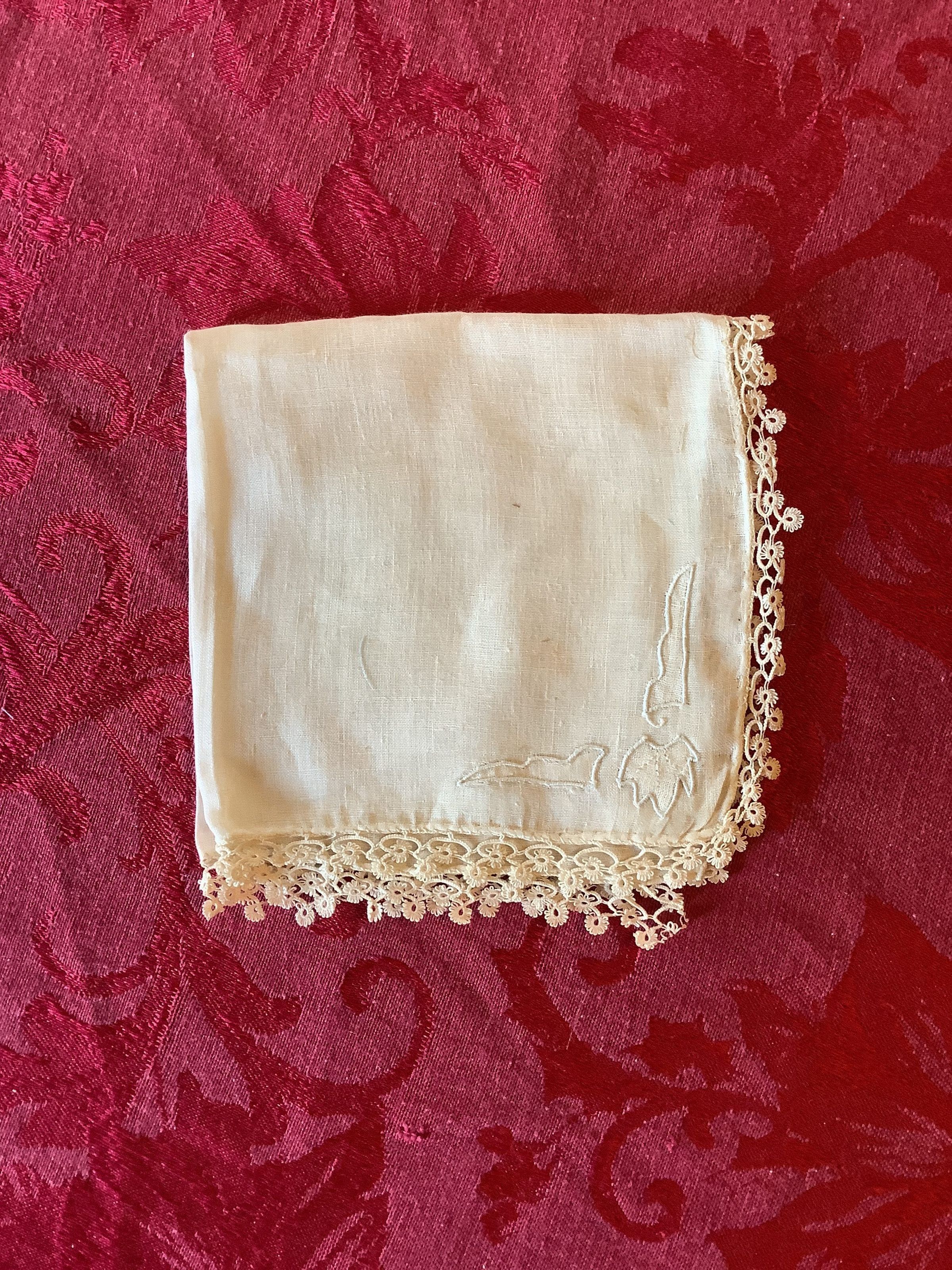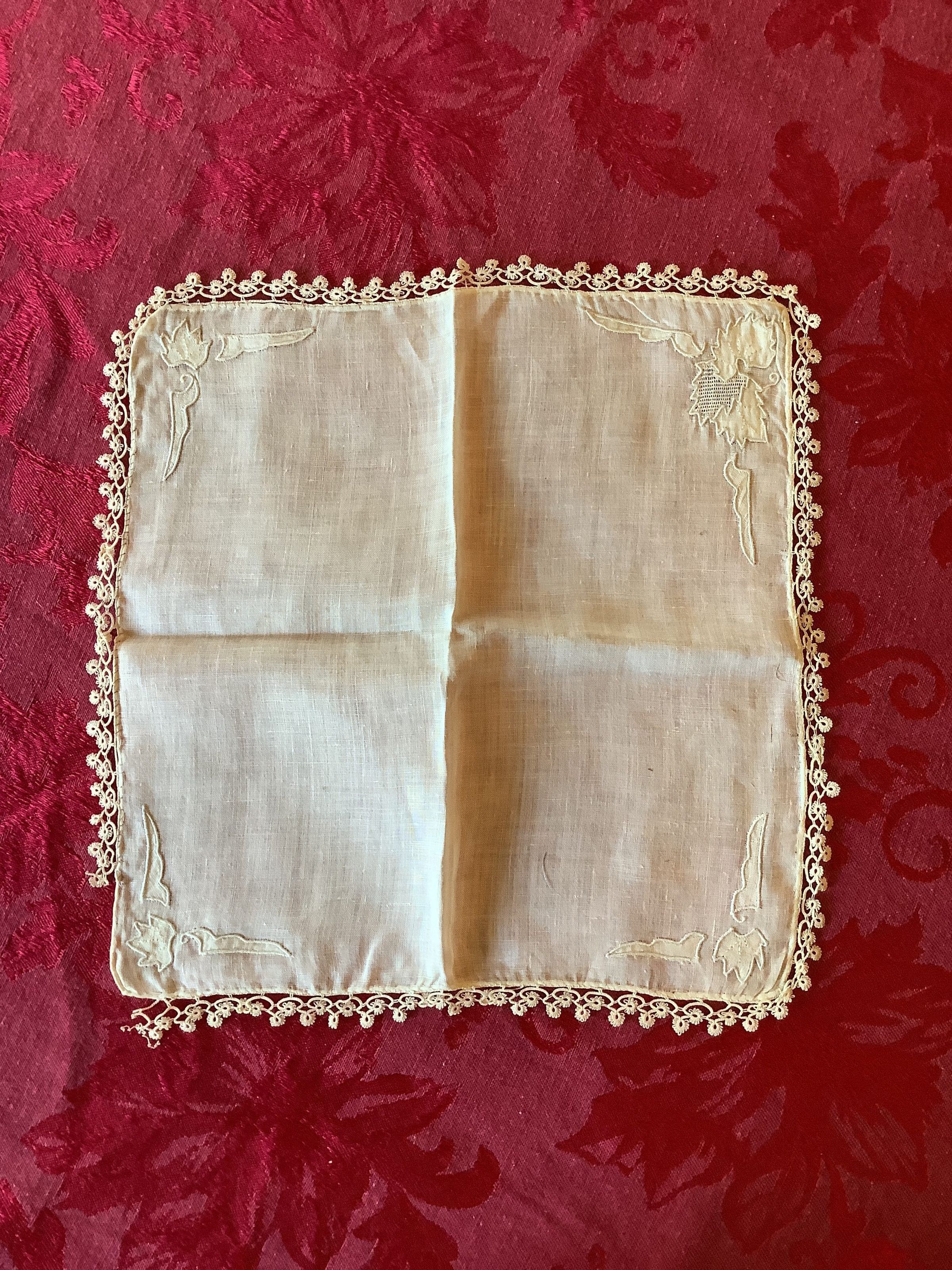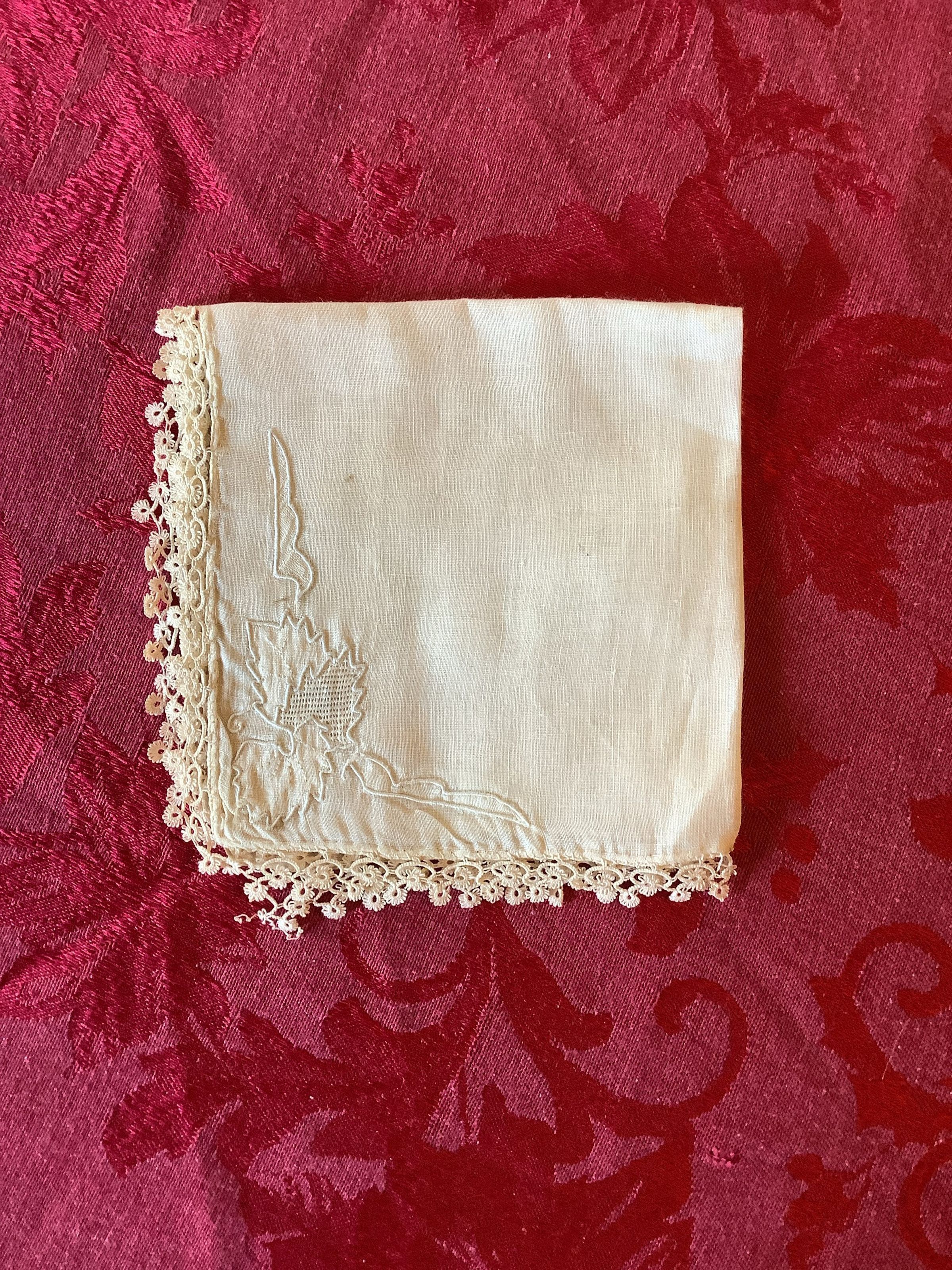 A white textured handkerchief with a floral trim design lining the edges and autumn leaves on one quadrant of the fabric. The other three have a different design.Create Date