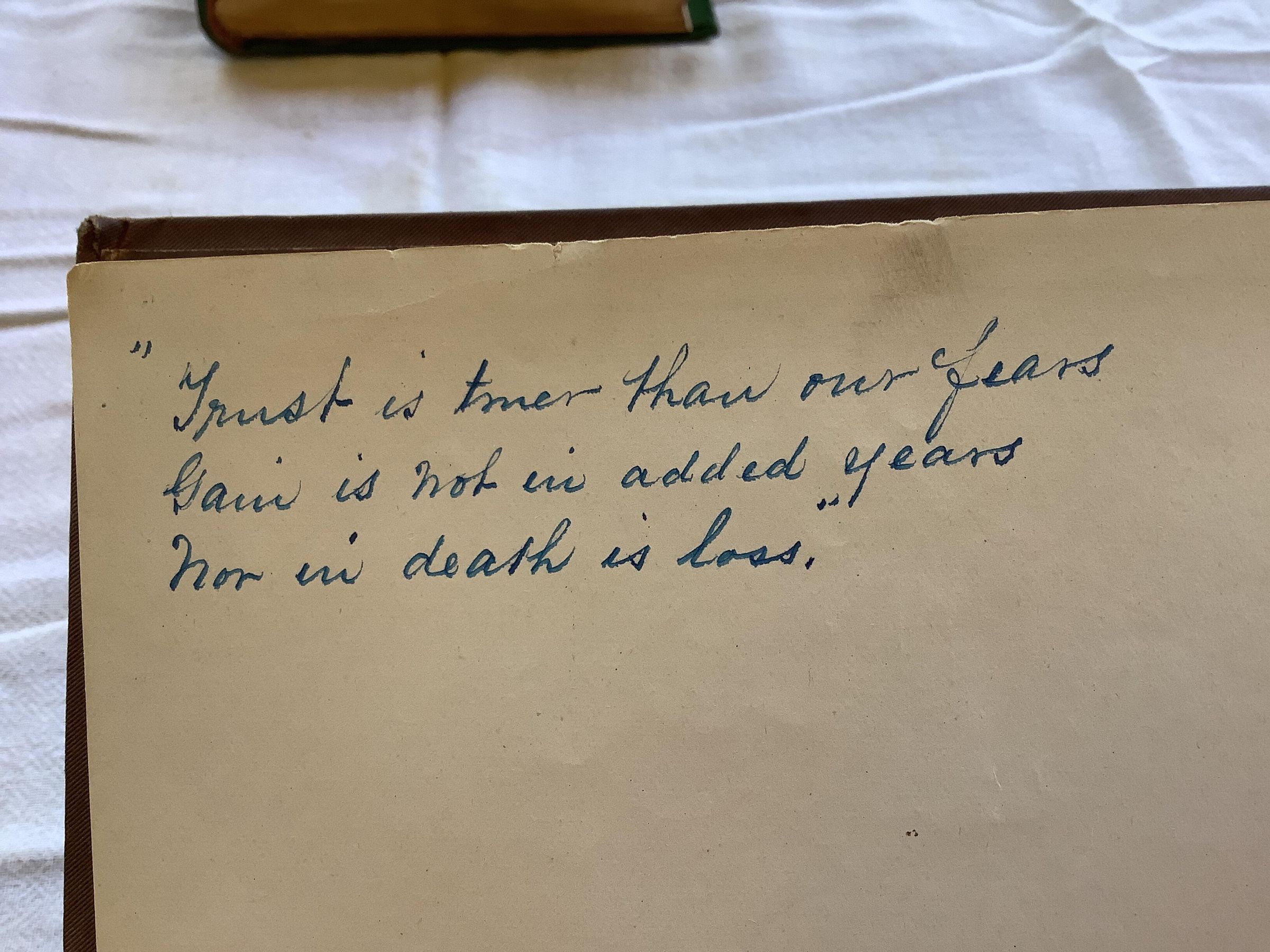 "Trust is [???] than our fears Gain [???] is not in added years Nor in death is loss."