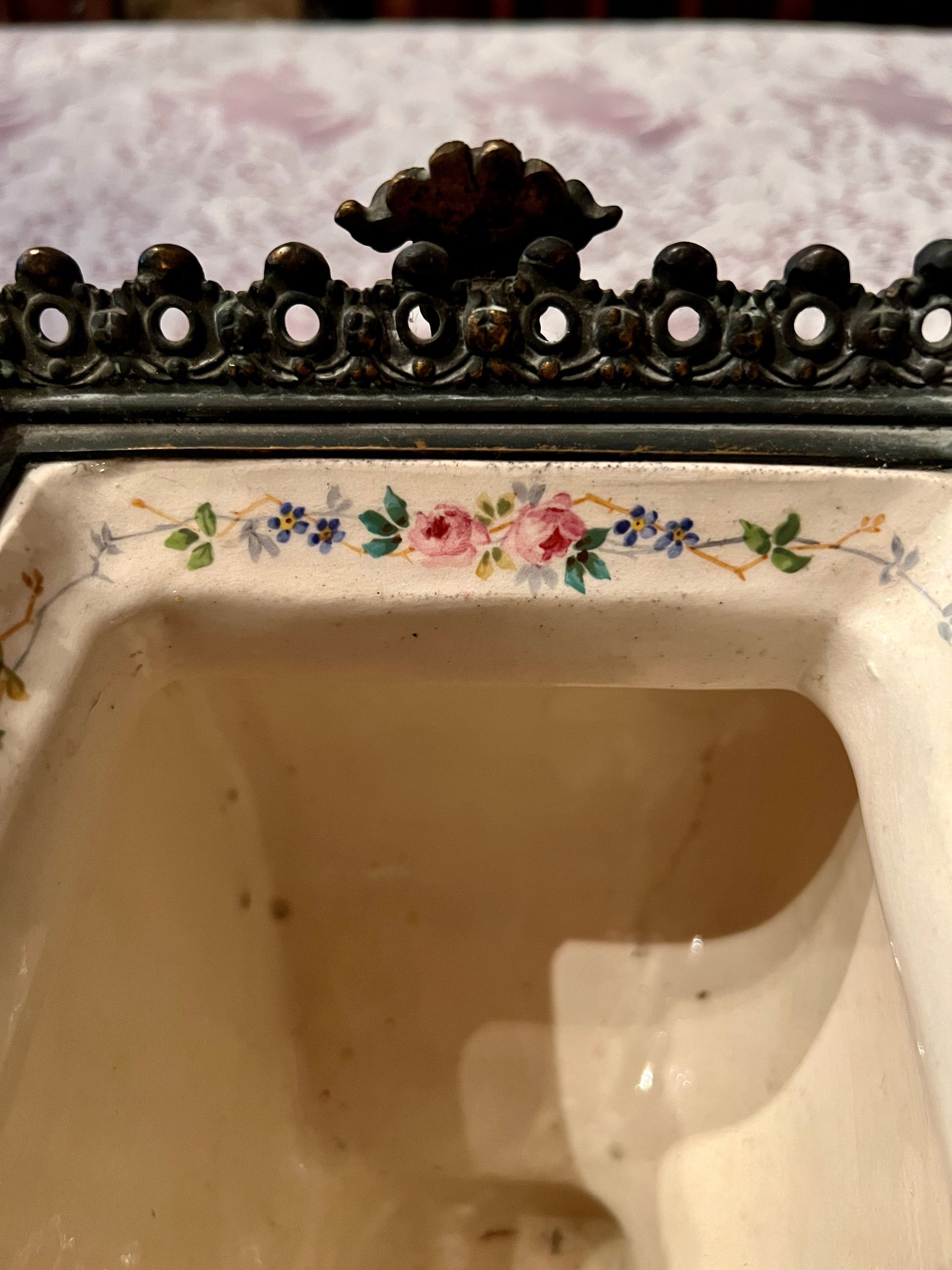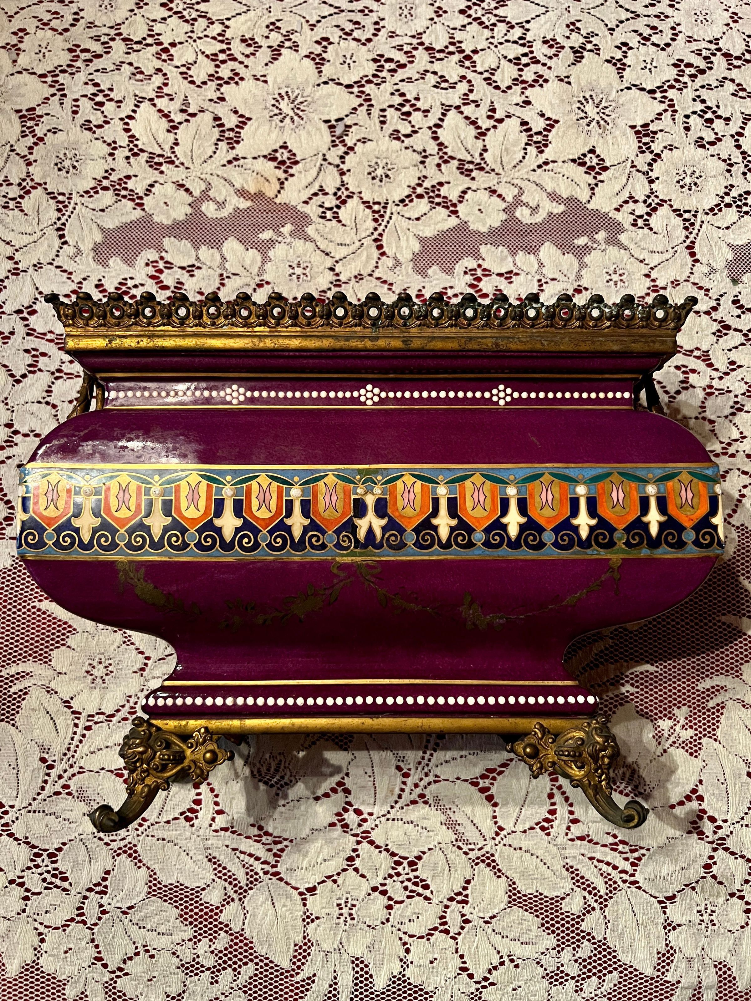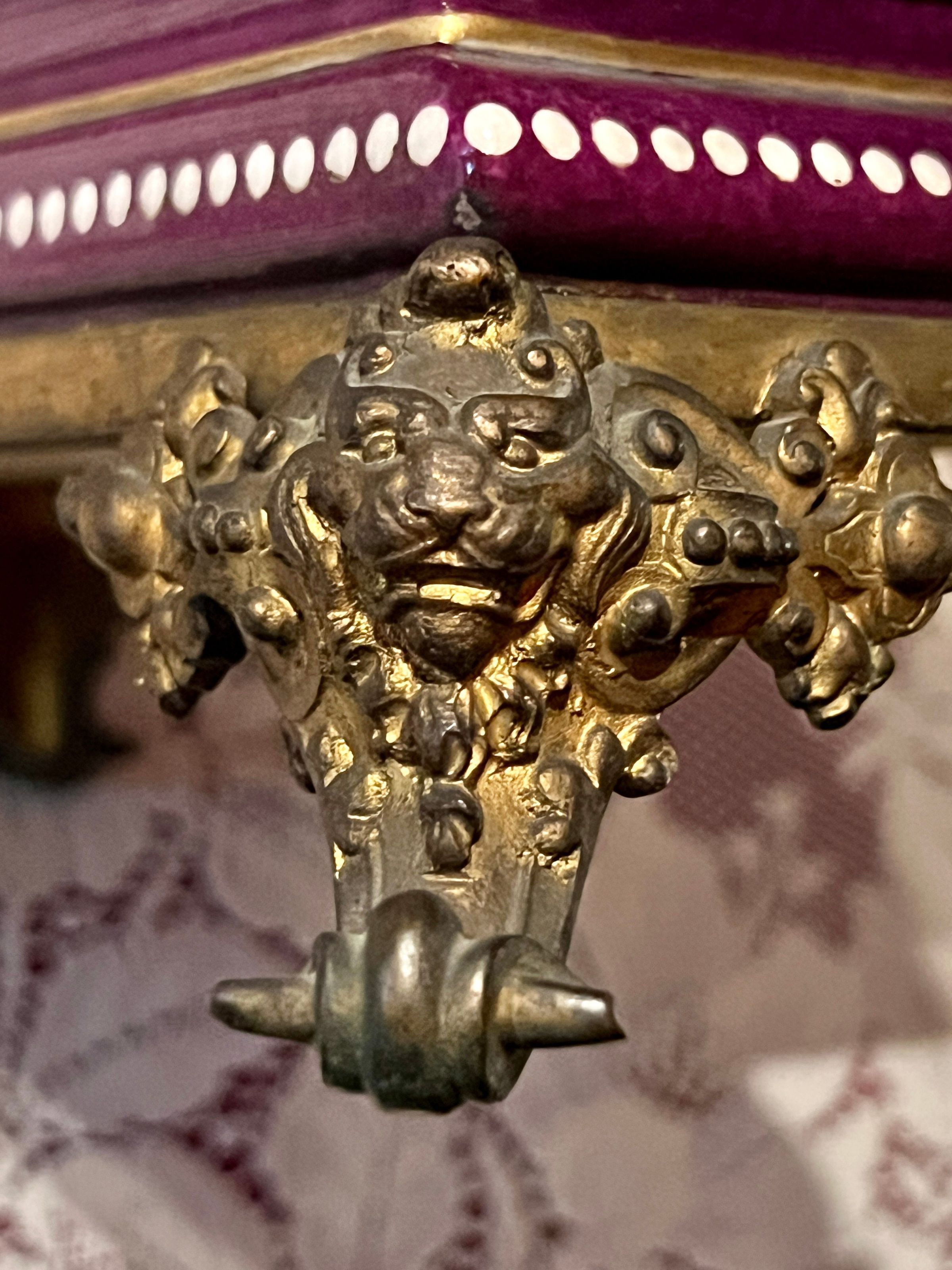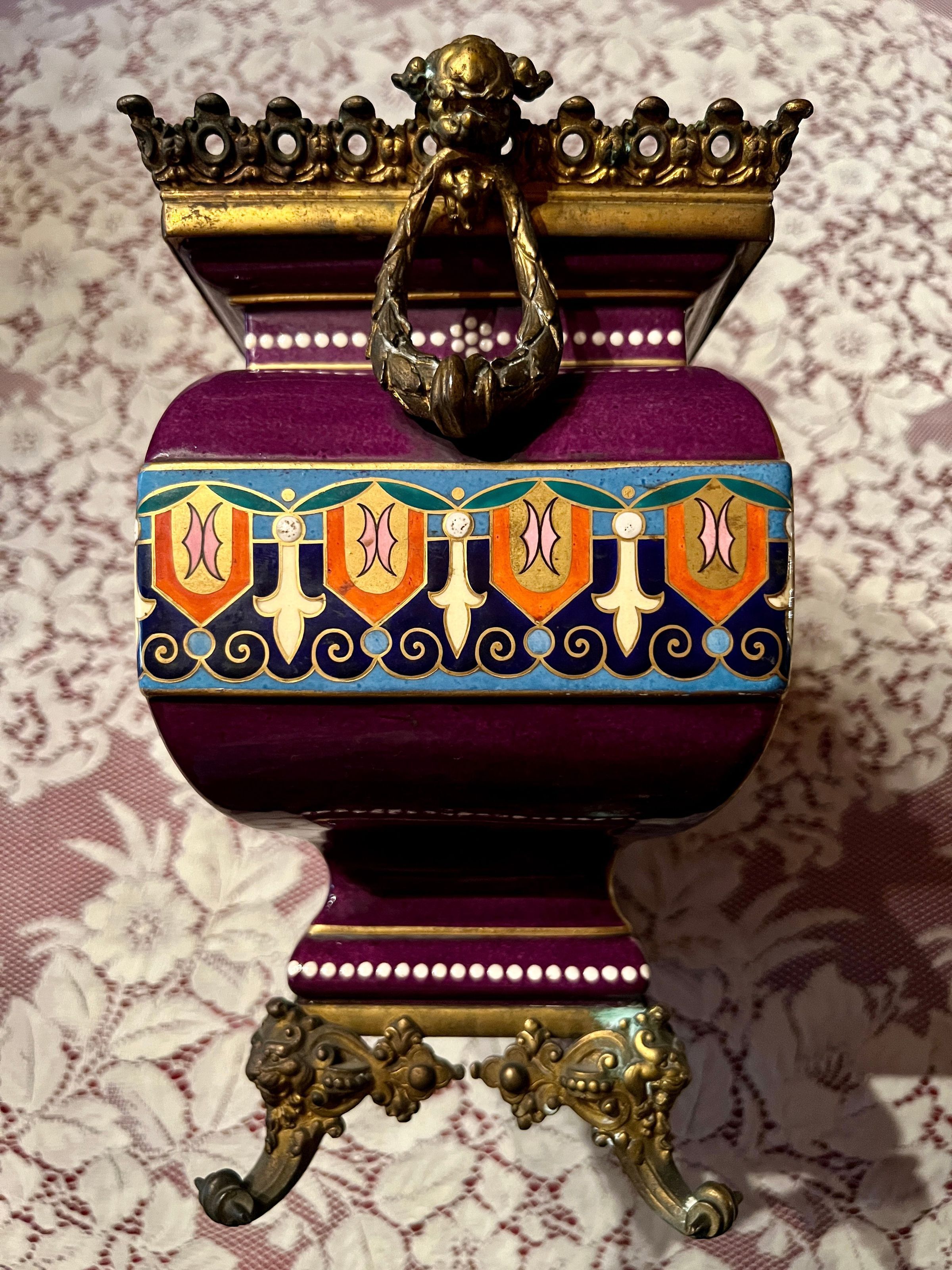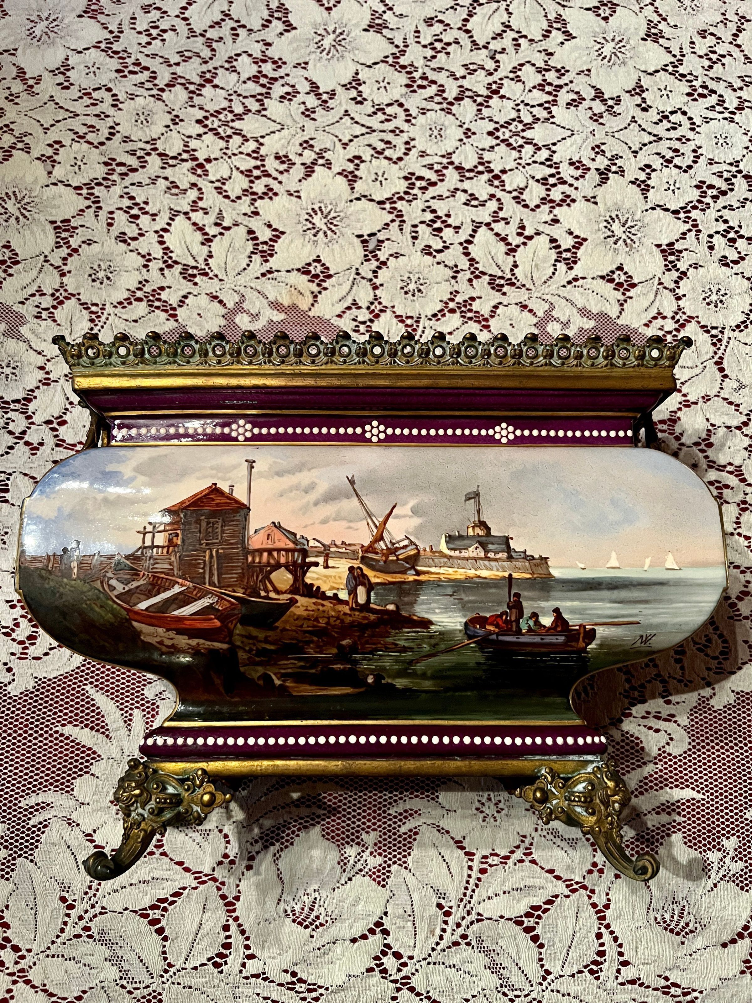 Ceramic and bronze vase with a painted nautical scene of a harbor with boats pulled ashore, figures just off the shore in a rowboat and sailboats at sea; painted filigree detail on the sides and back; bronze gargoyle head handles and bronze lion head feet.Inscription/Signature/Marks