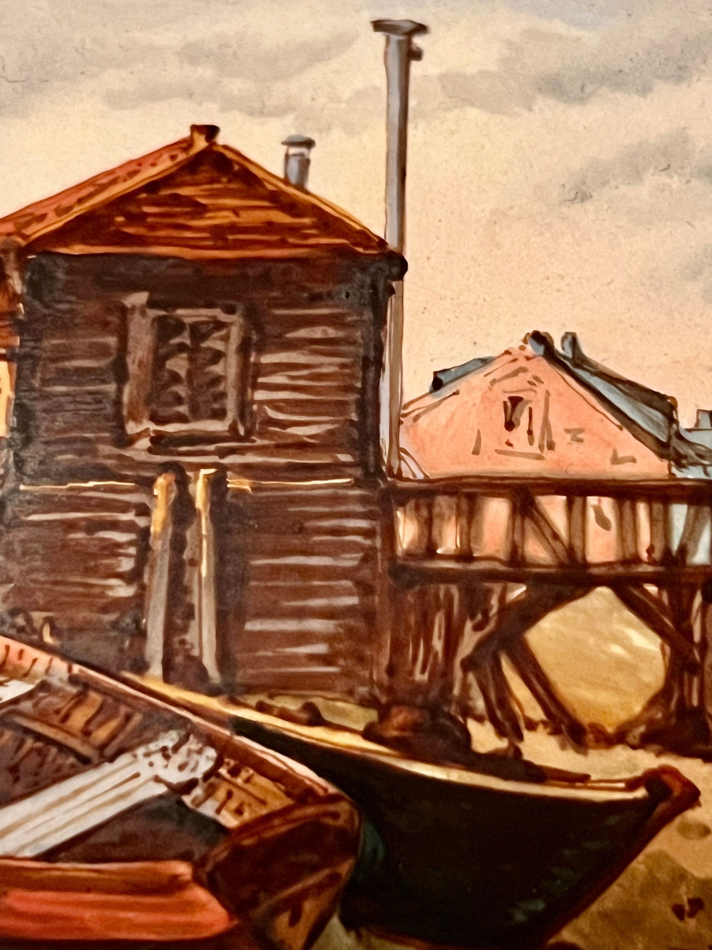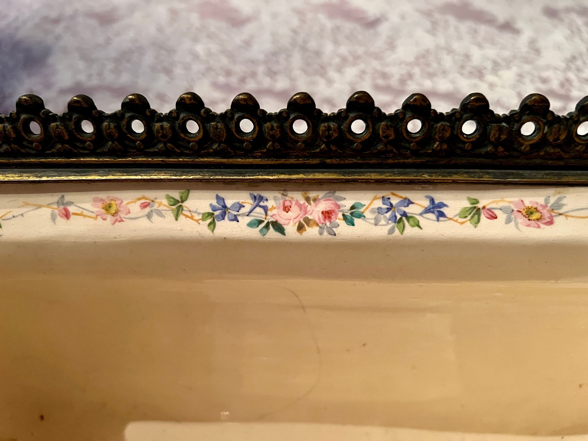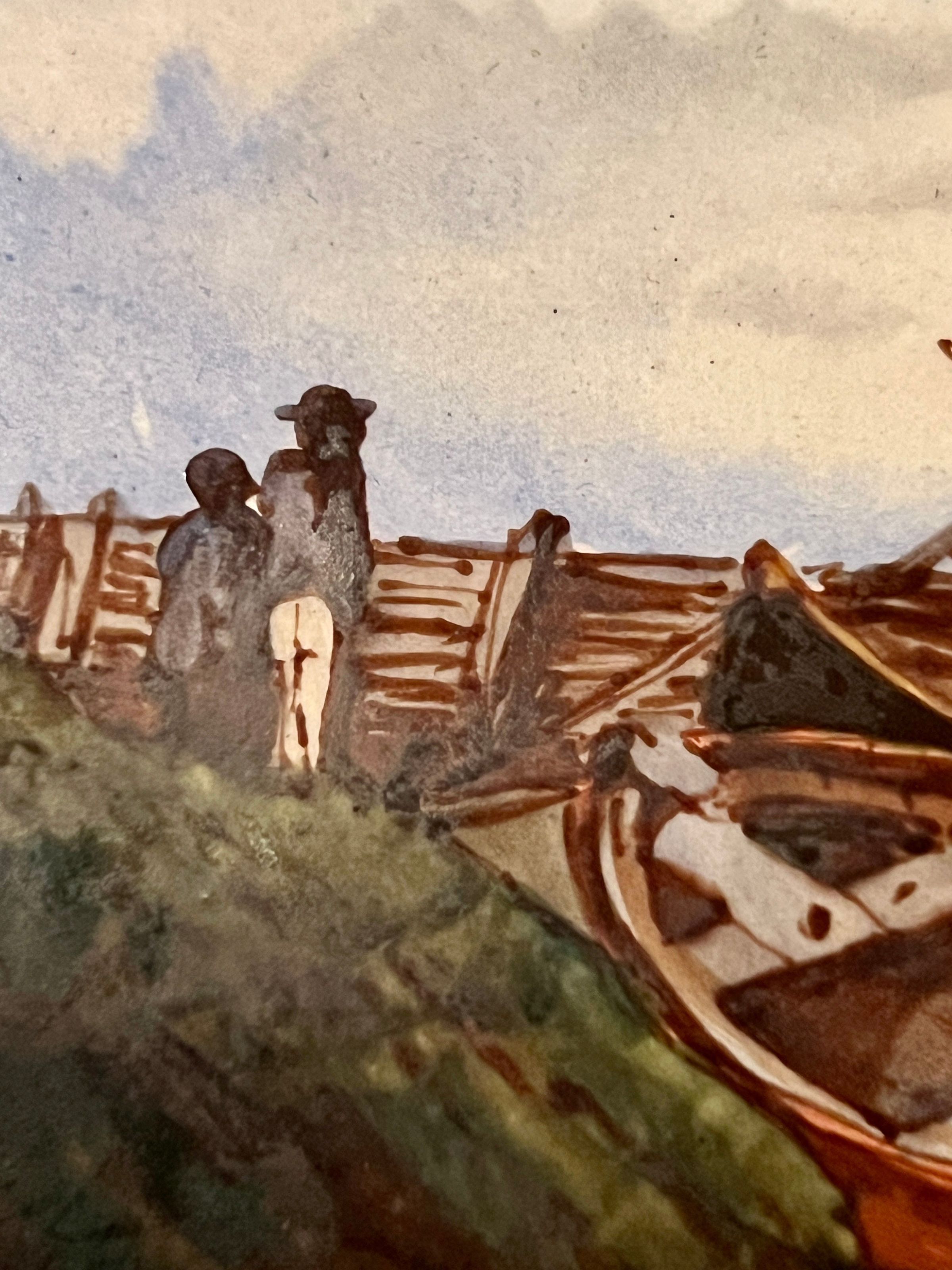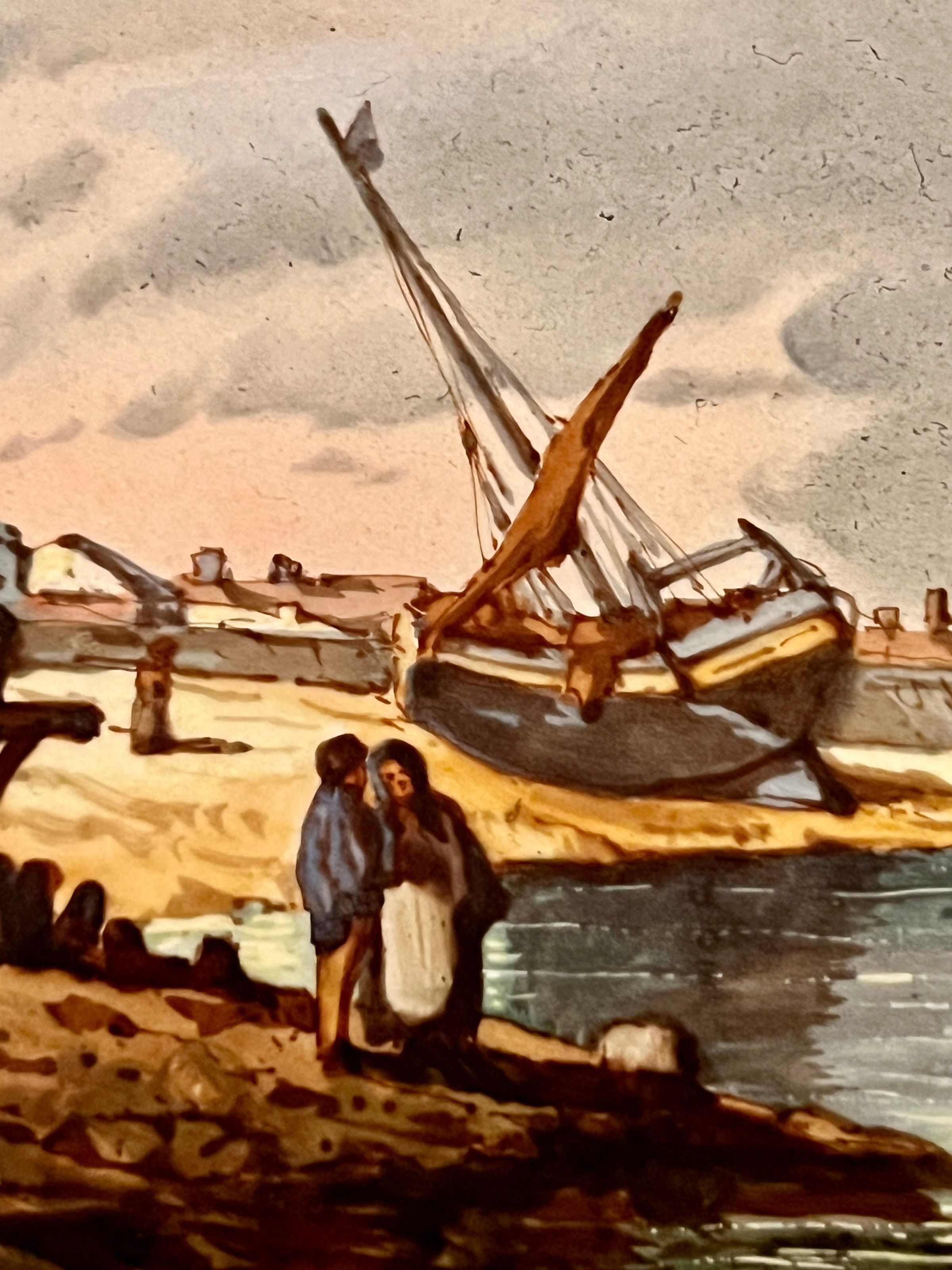 Ceramic and bronze vase with a painted nautical scene of a harbor with boats pulled ashore, figures just off the shore in a rowboat and sailboats at sea; painted filigree detail on the sides and back; bronze gargoyle head handles and bronze lion head feet.Inscription/Signature/Marks