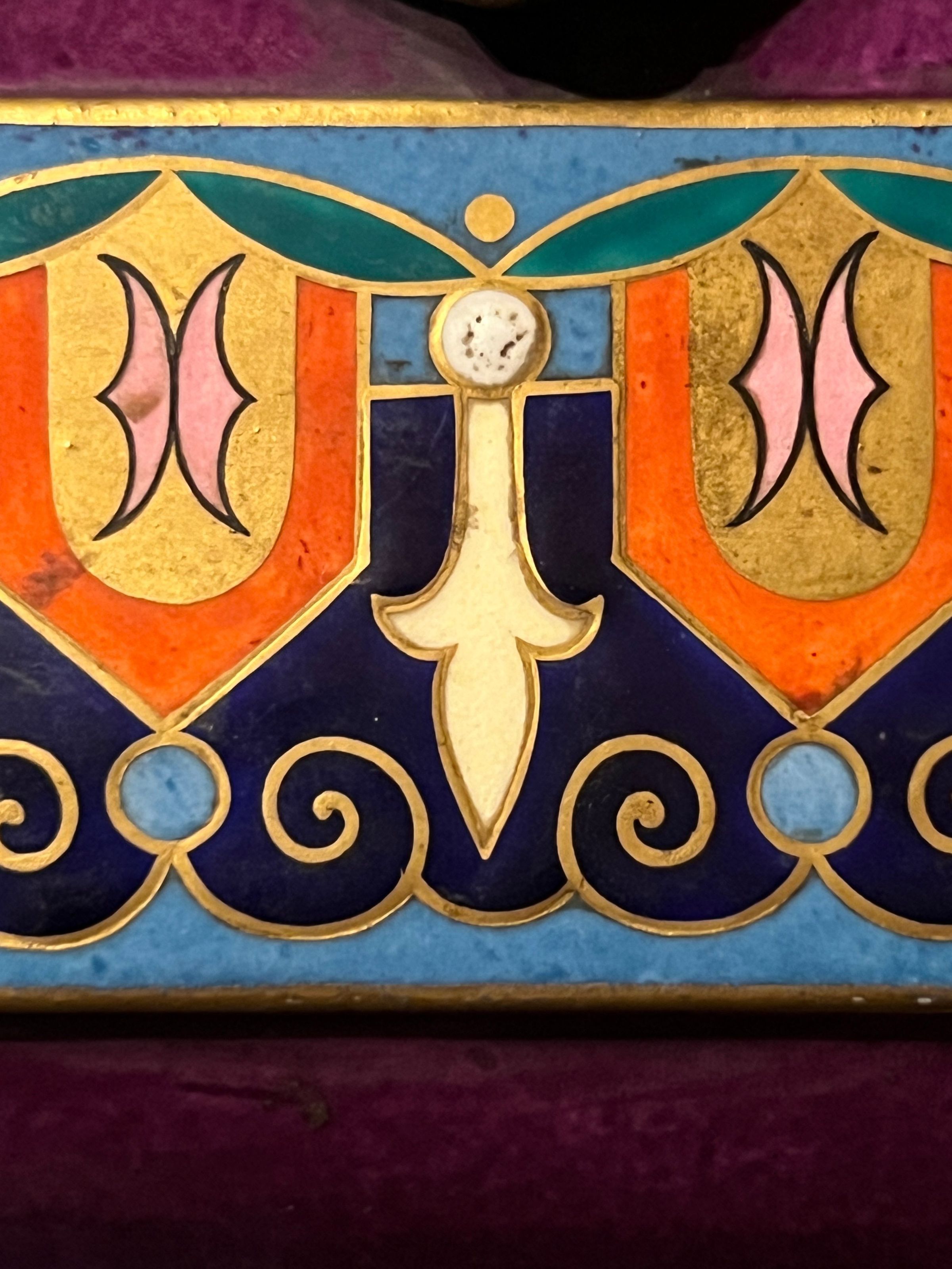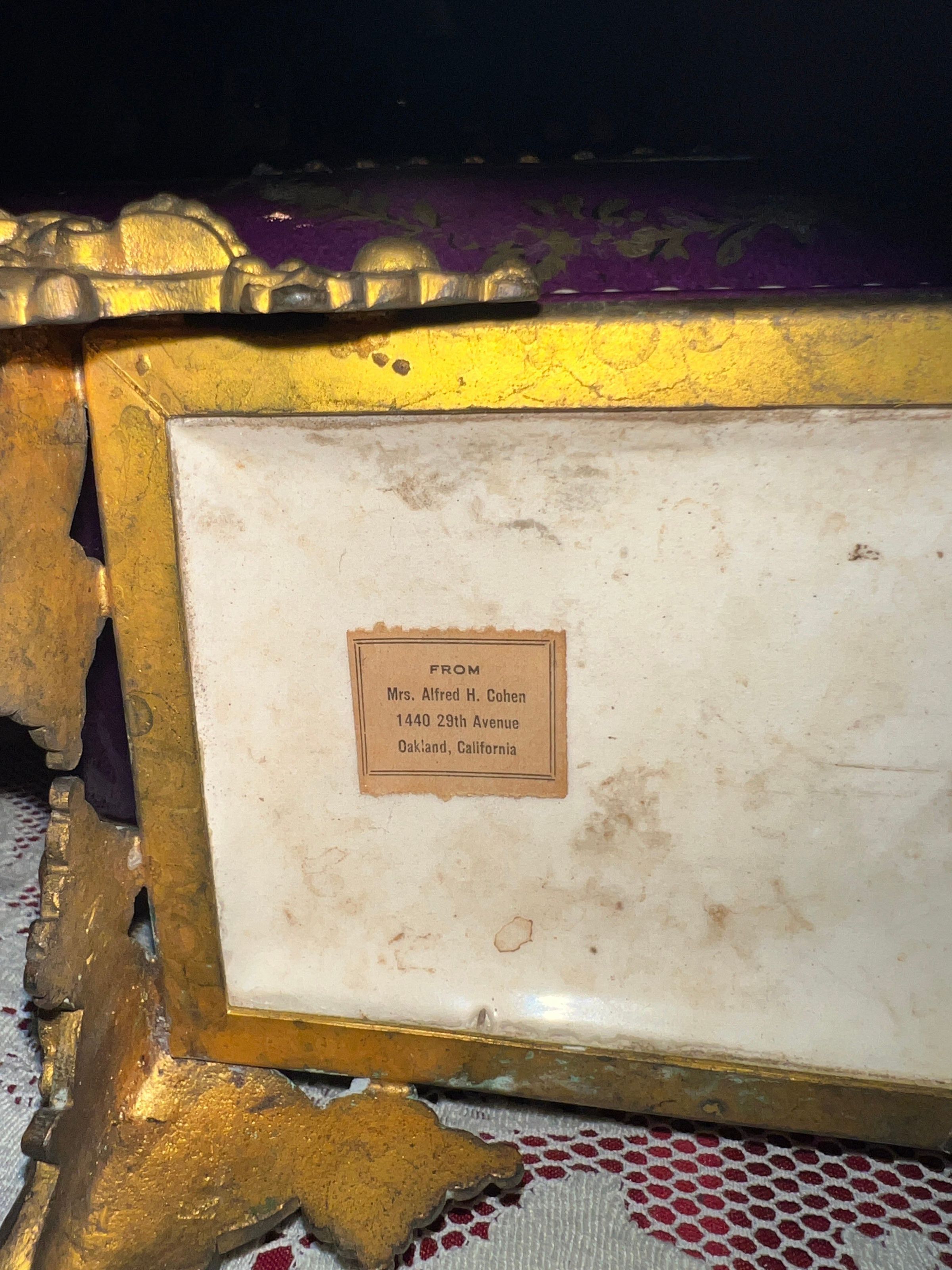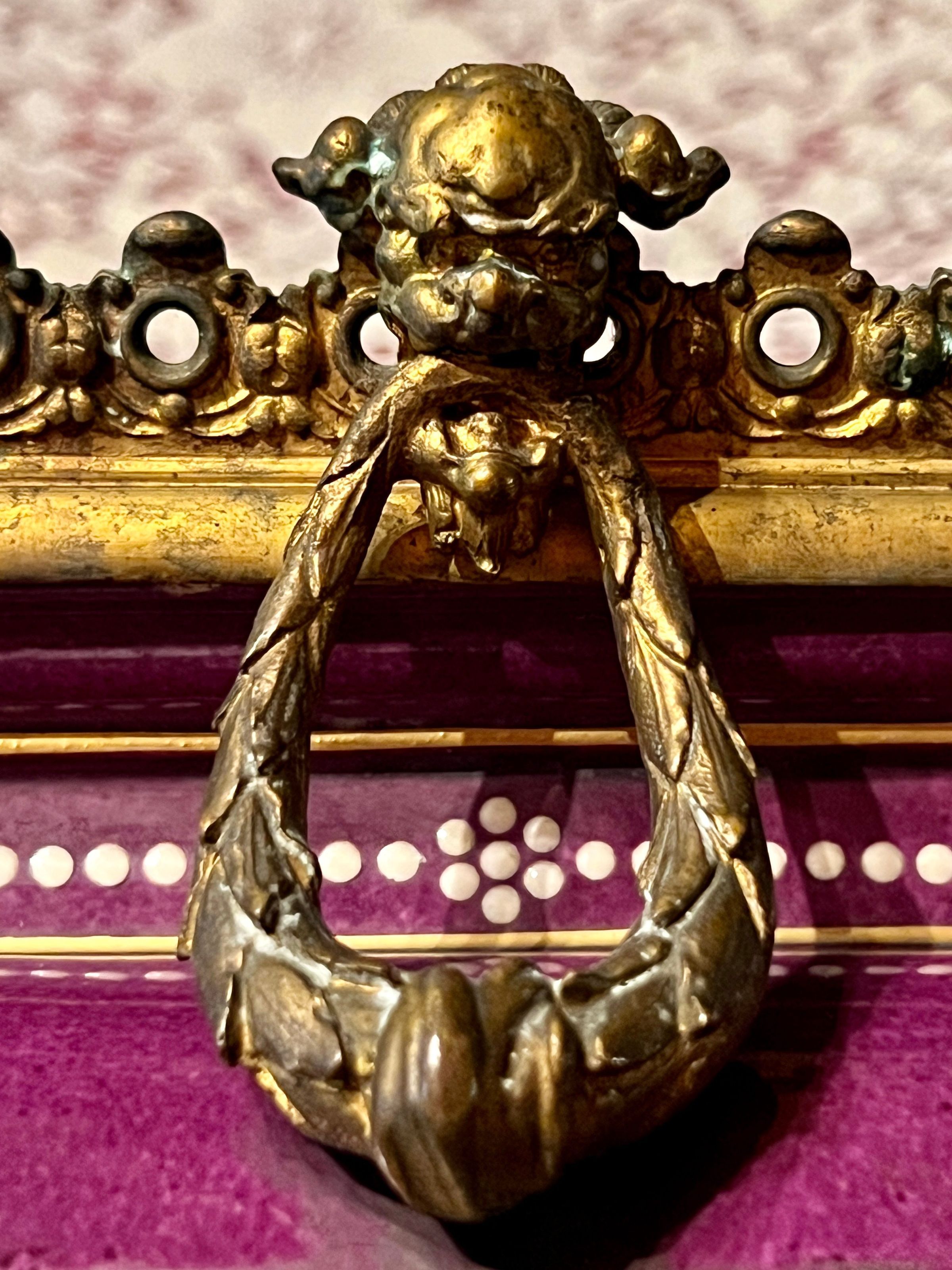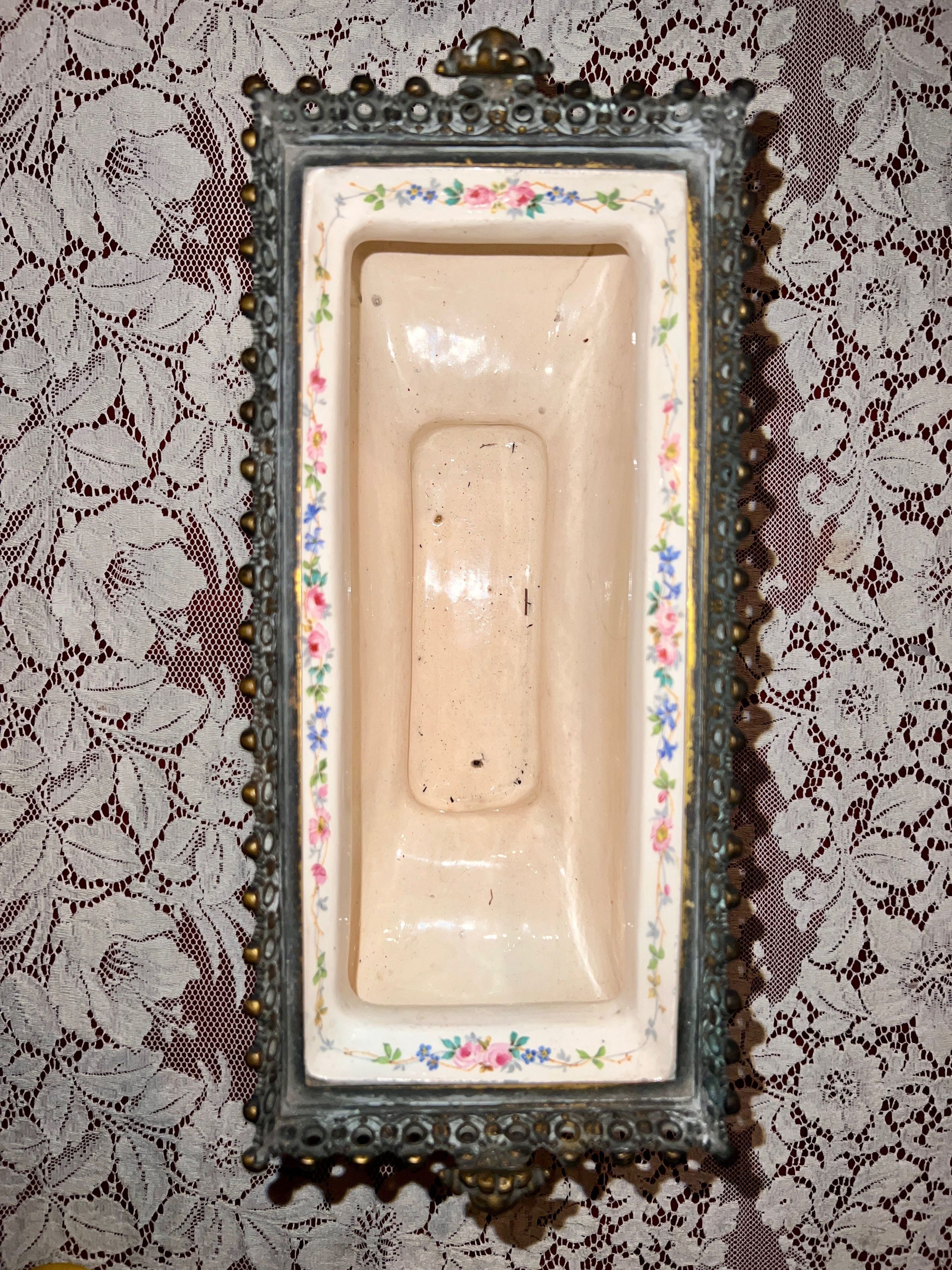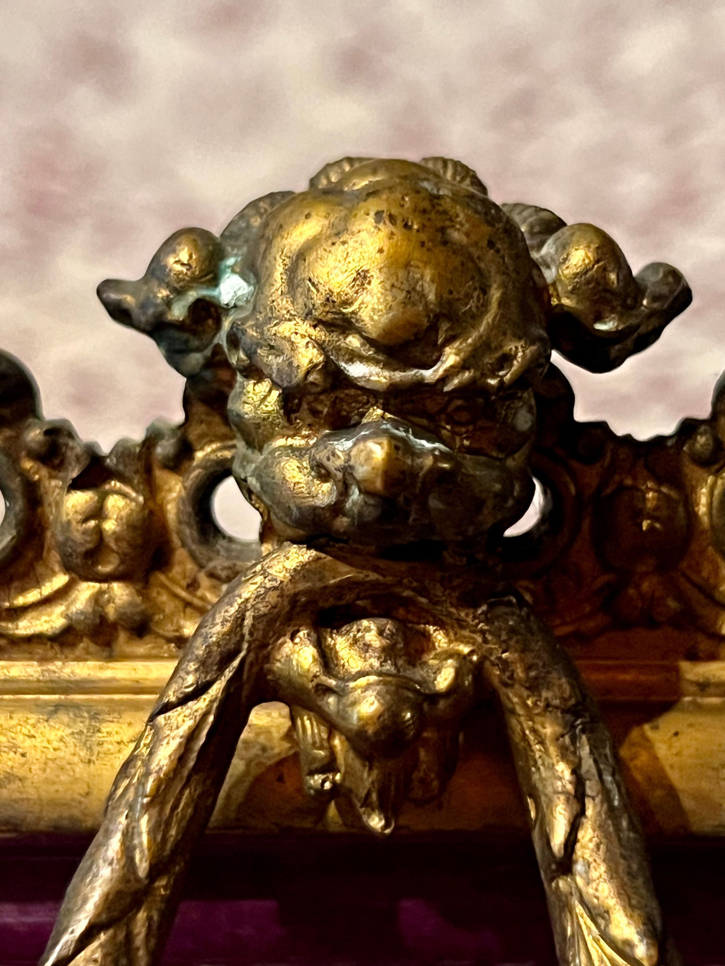 Ceramic and bronze vase with a painted nautical scene of a harbor with boats pulled ashore, figures just off the shore in a rowboat and sailboats at sea; painted filigree detail on the sides and back; bronze gargoyle head handles and bronze lion head feet.Inscription/Signature/Marks