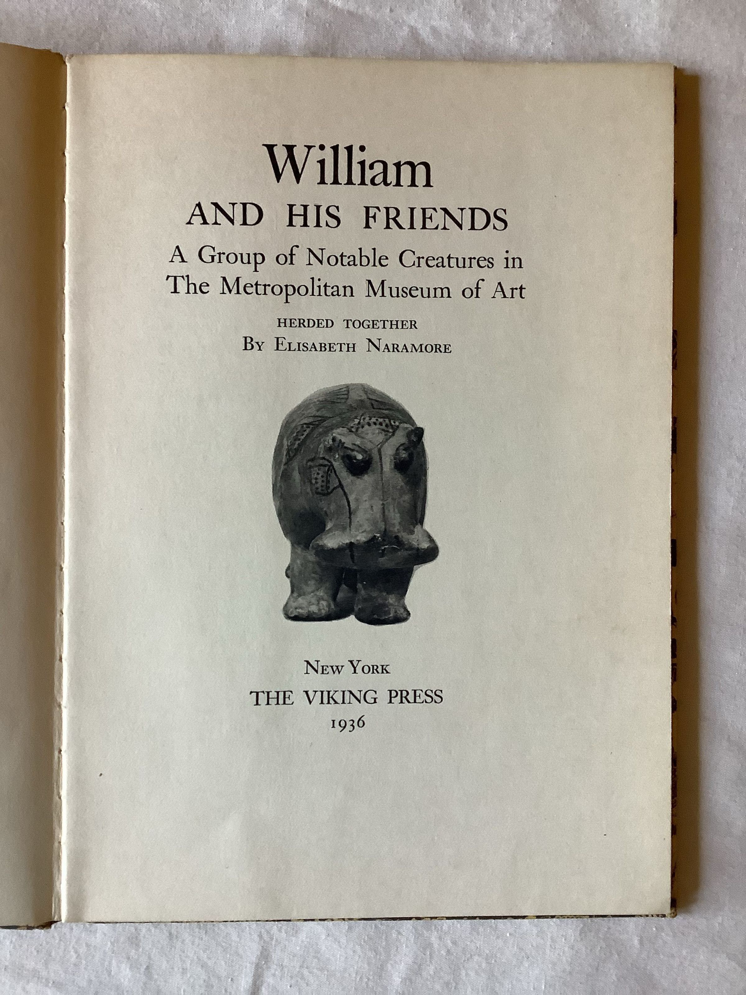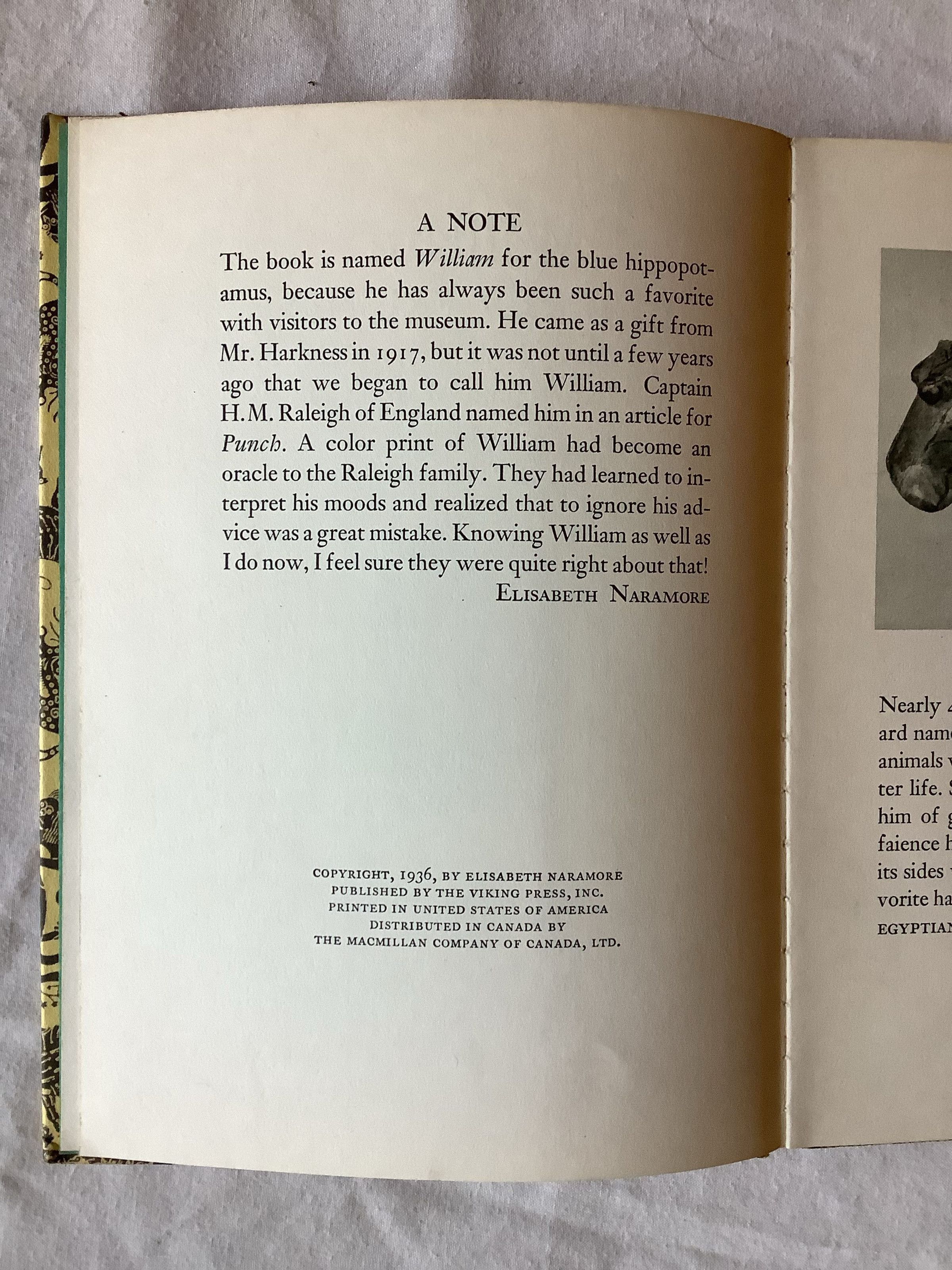 The book is named William for the blue hippopotamus, because he has always been such a favorite with visitors to the museum. -NoteInscription/Signature/Marks
