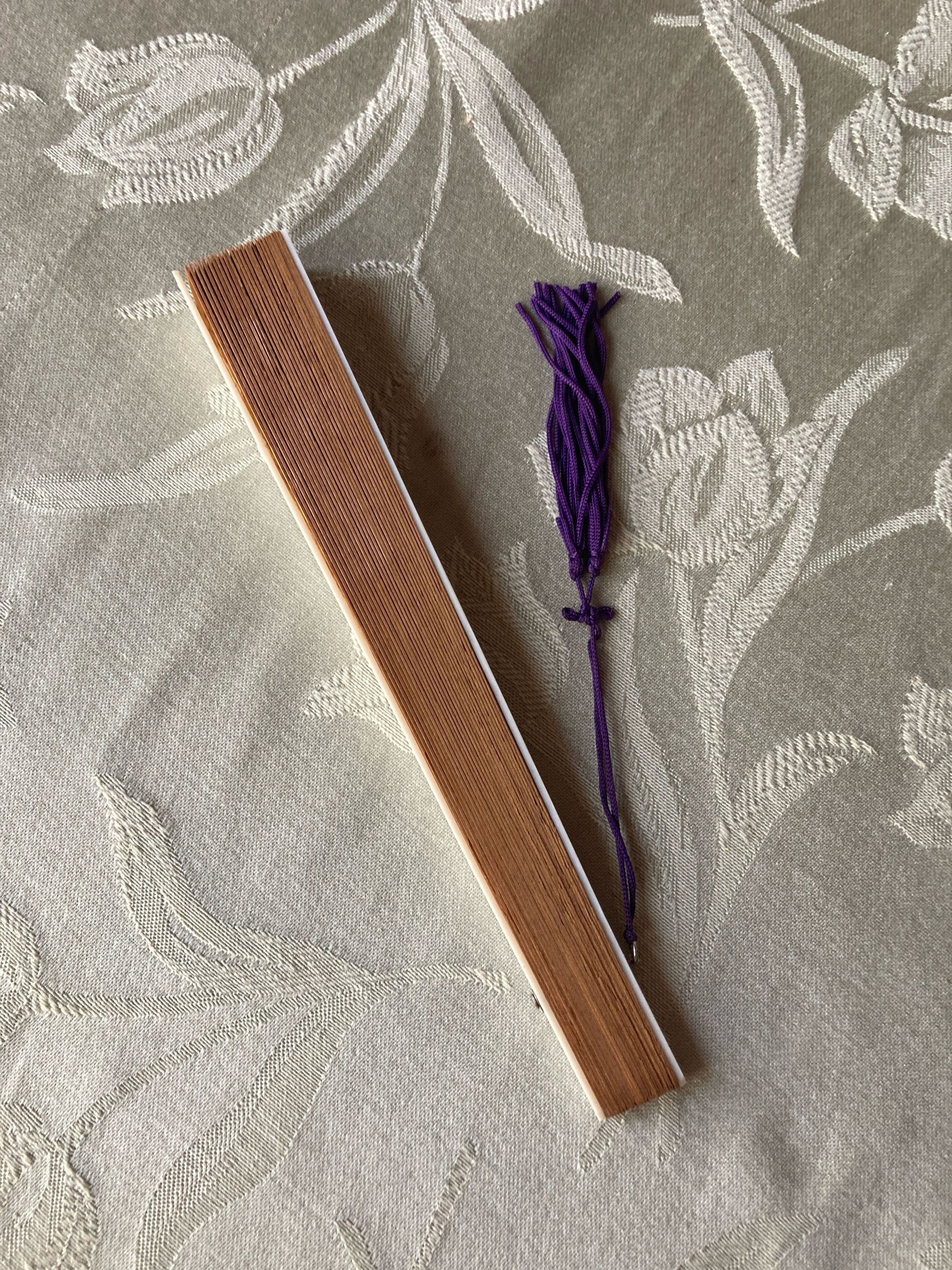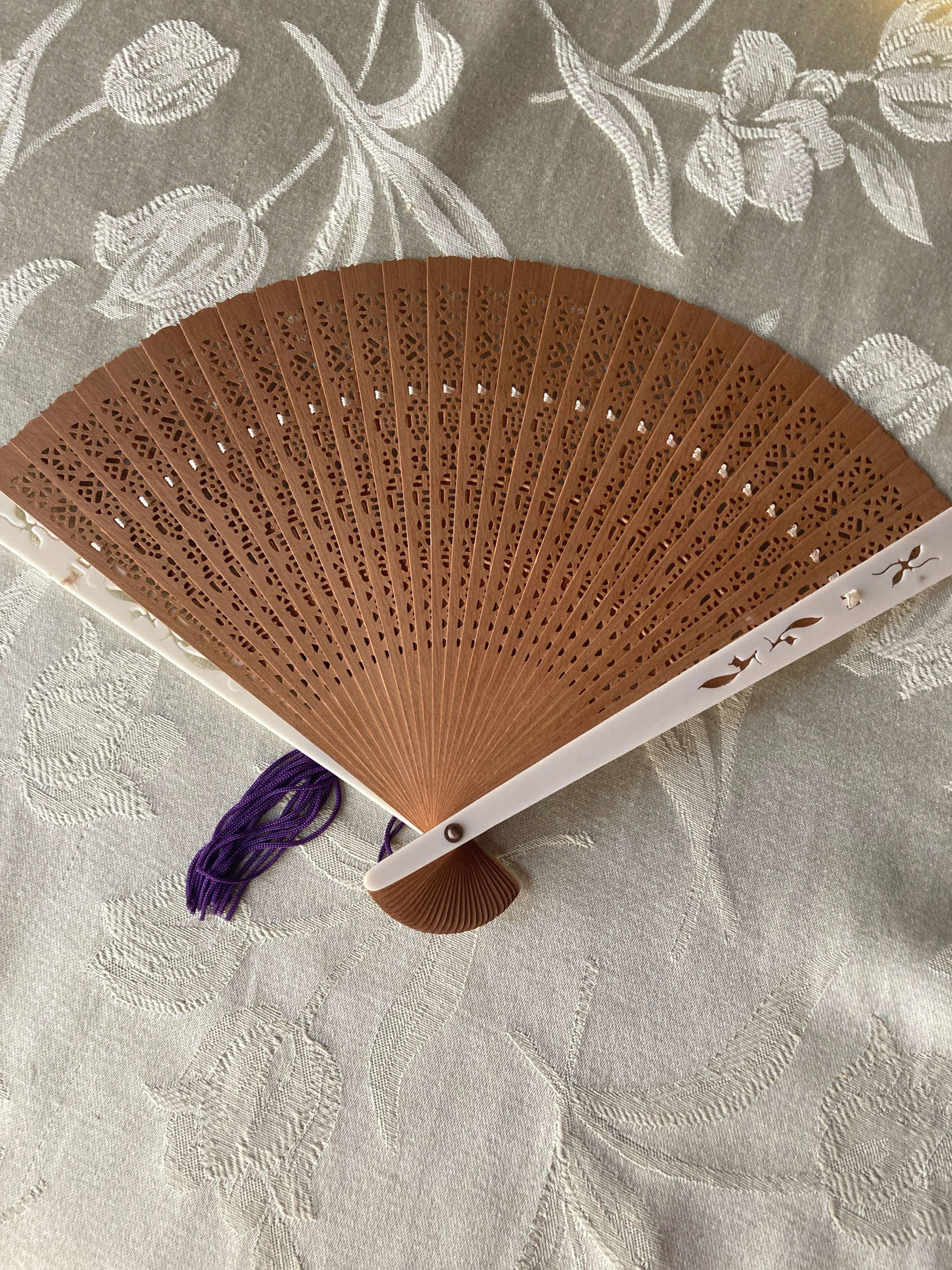 A folding fan made of intricately carved wooden slats, held together by white string. White plastic slats bookend the ends. A purple tassel hangs on the end. A Japanese inspired design.Create Date