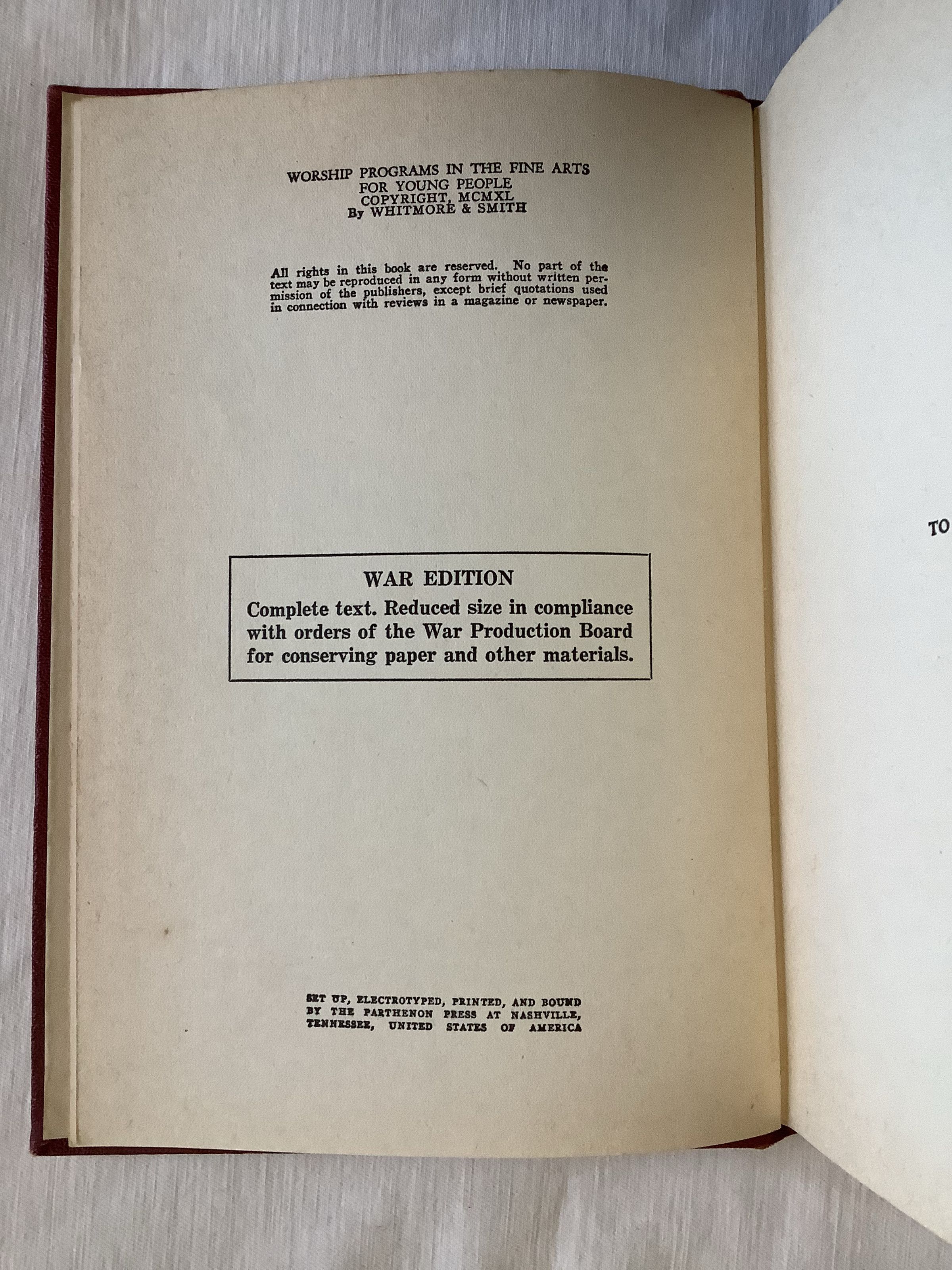 Thirty-seven complete worship services centering in works of art paintings, sculpture, hymns-specially planned to fit the interests and needs of young people. --Book JacketInscription/Signature/Marks
