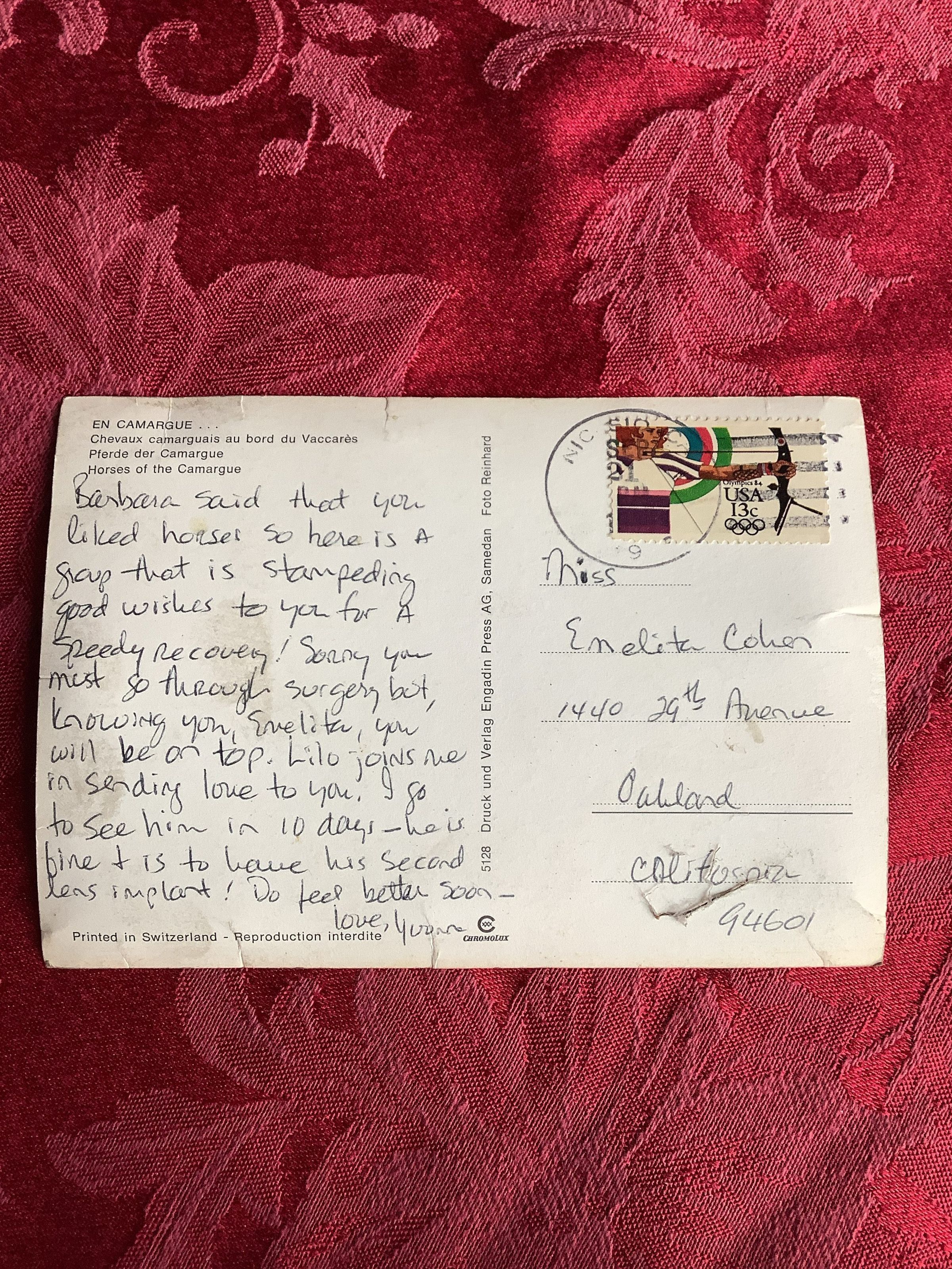 A small written postcard to Emelita from Yvone (?) with a printed picture of horses drinking on one side. The postcard itself describes good wishes for Emelita’s speedy recovery post surgery.Create Date