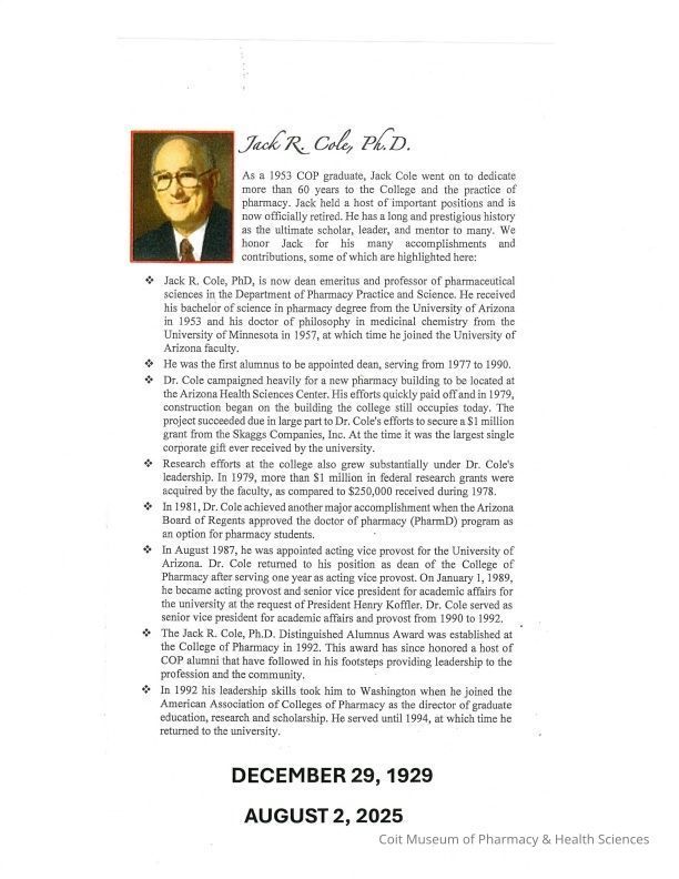College of Pharmacy Jack Cole In memoriam/Obituary/Biographic information