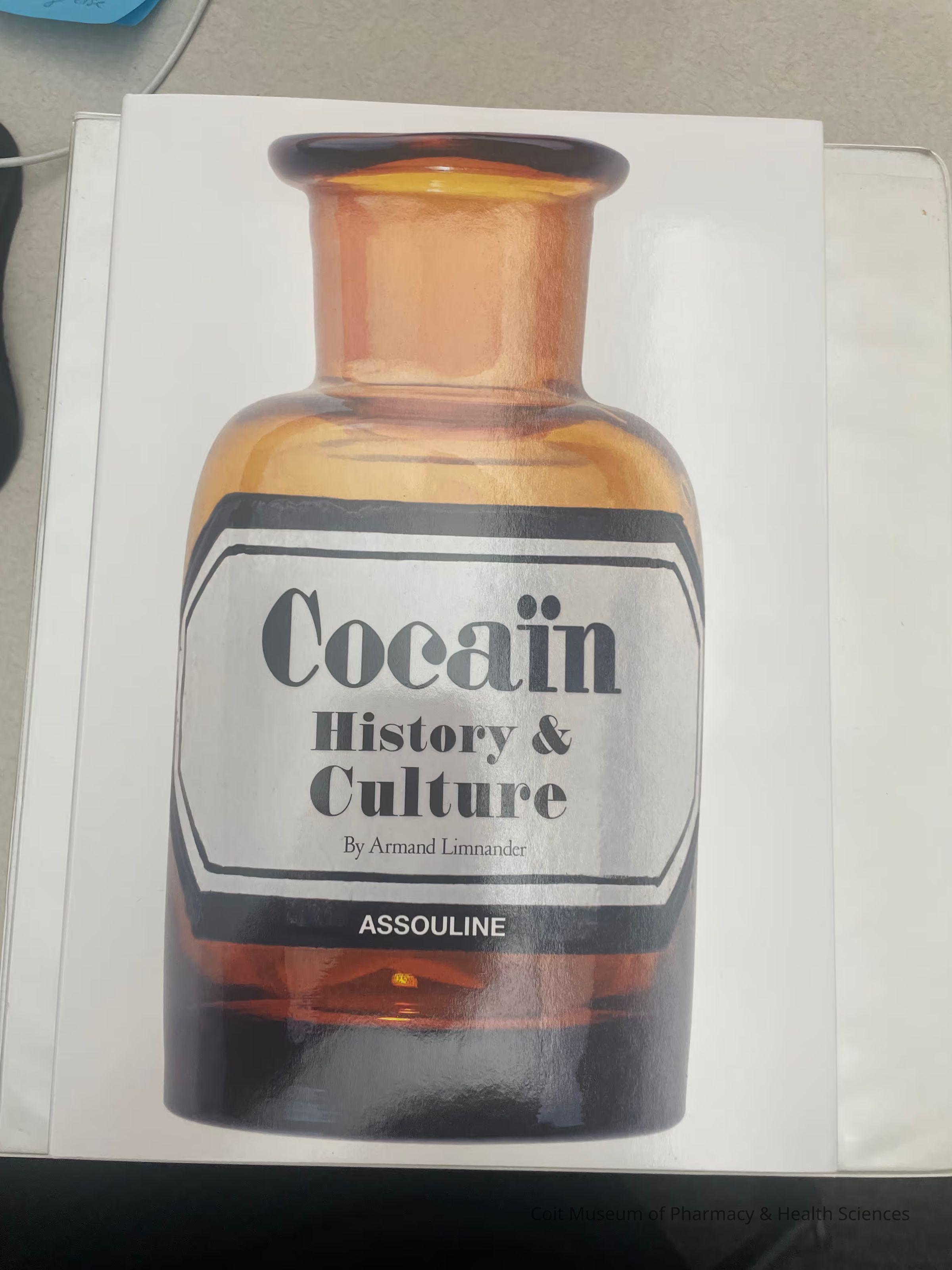 White front page with an image of a brown bottle with a white label, the label surrounded by two black outlines, and the label says "Cocain History & Culture By Armand Limnander" Bottom of the label in white on black says AssoulineLexicon