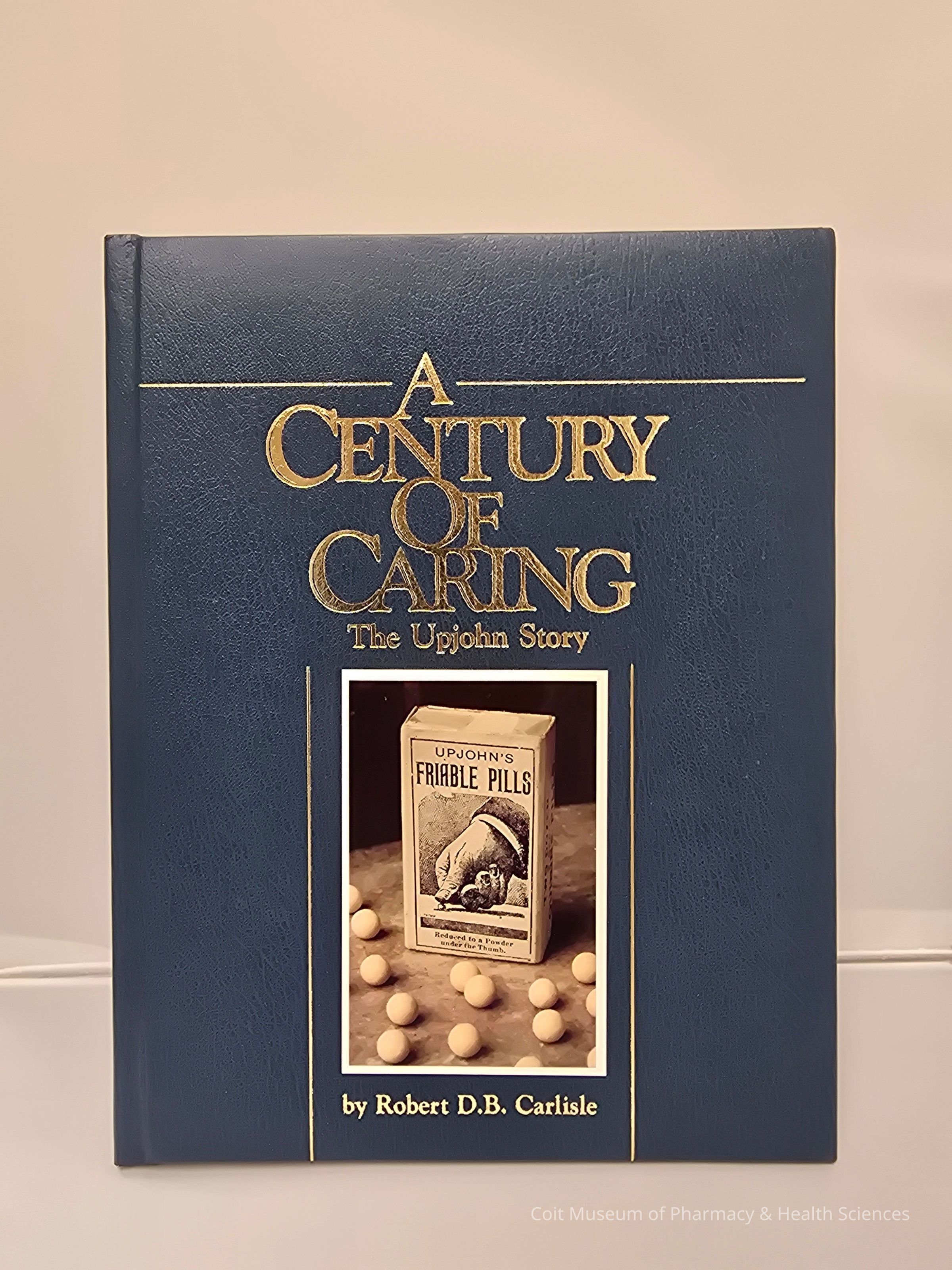A blue hardcover book with golden lettering stating “A Century of Caring The Upjohn Story by Robert D.B. Carlisle on the front cover alongside a photo of a box of Upjohn’s Friable Pills.Collection