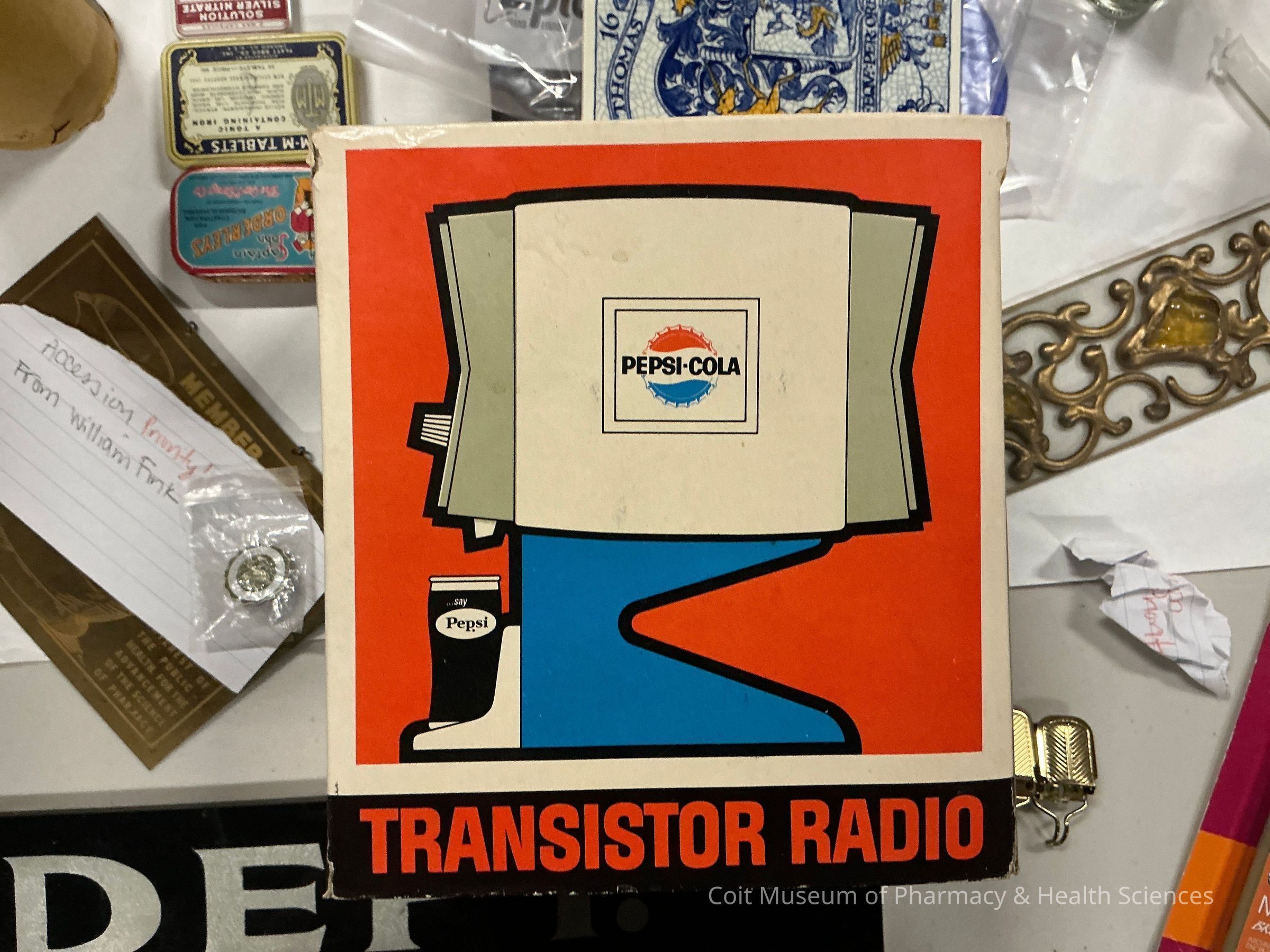 Pepsi-Cola branded transistor radio, box is red white and blue with black accents and labeled on all sides with depictions of the radio. Inside box is the radio, which has a blue base and a TV styled transistor radio with 3 knobs and a small Pepsi glass that emulates a soda machine.Collection