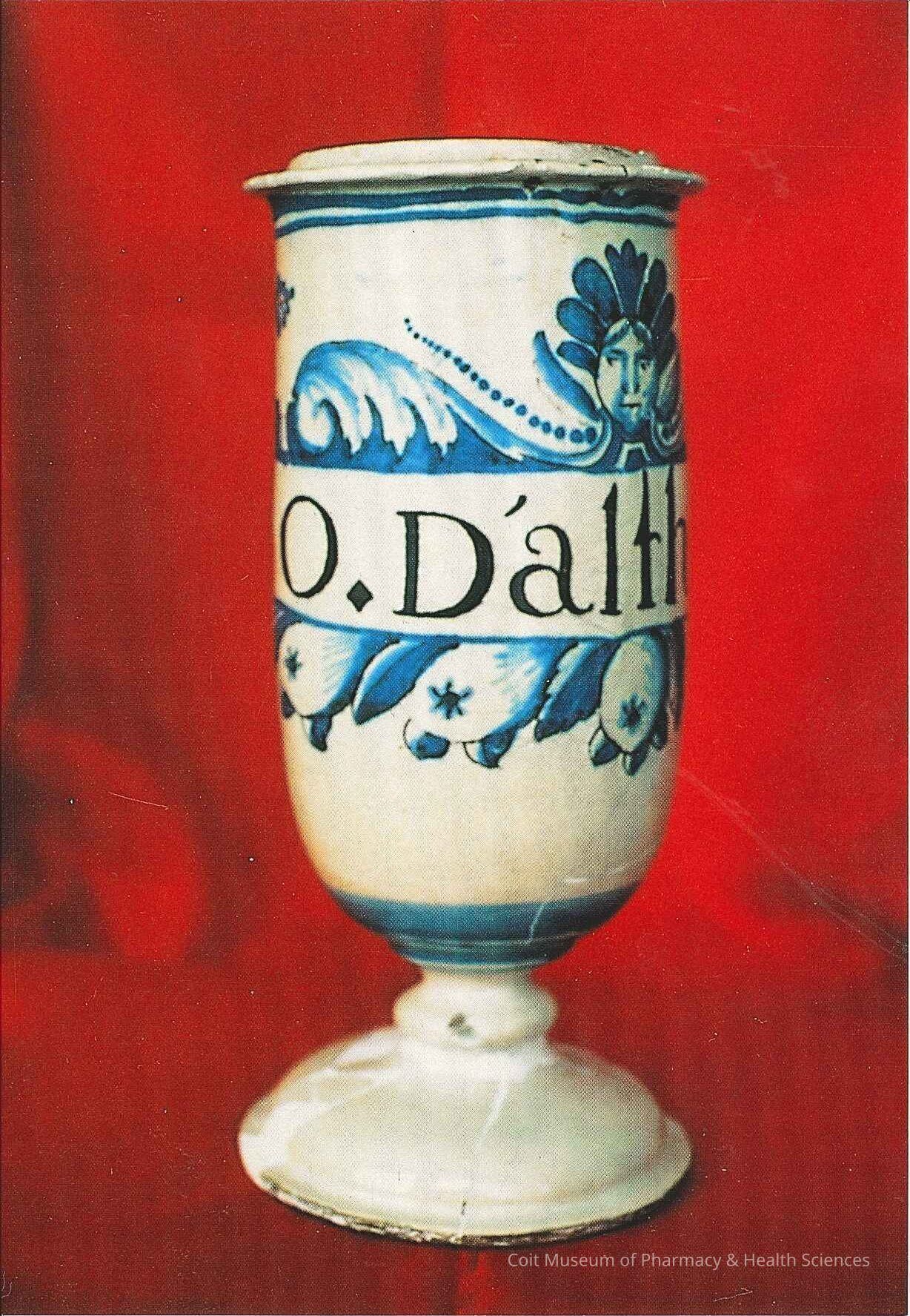 Postcard from the Musee de la Pharmacie de Montpellier. Photo shows "Pot droit sur piédouche - Atelier Ollivier (1710)."