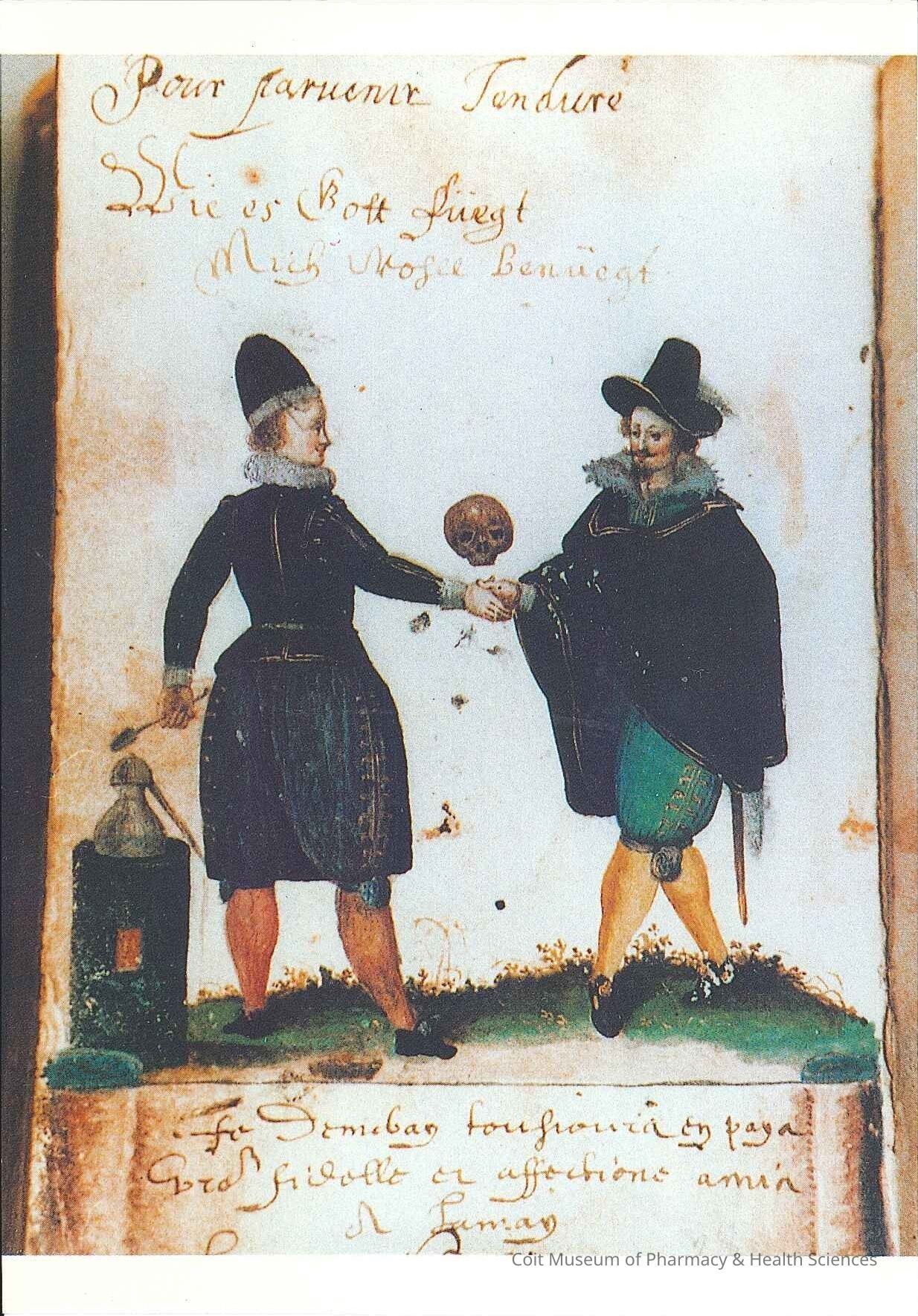 Postcard from the Musee de le Pharmacie de Montpellier. Photo shows "Emmanuel Ryhiner: étudiants en pharmacie et en médecine á Montpellier en 1614."