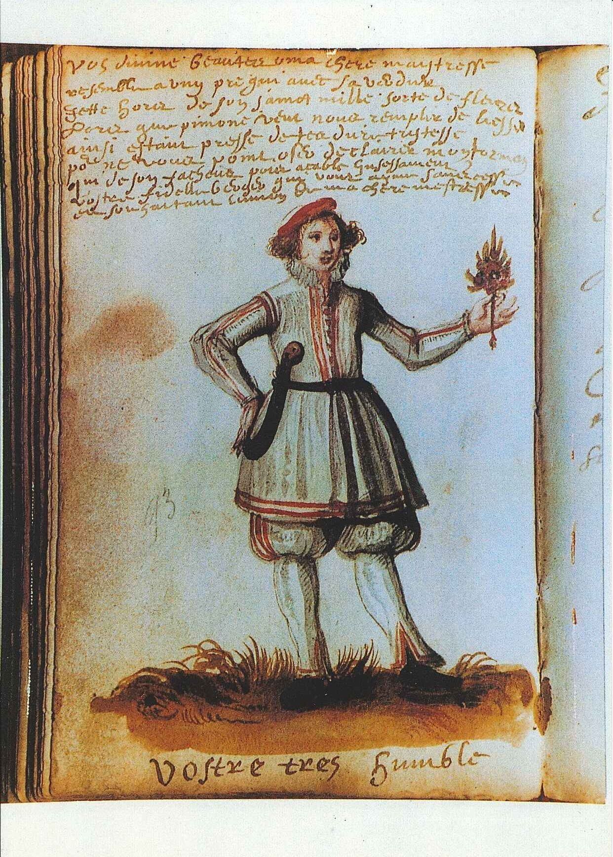 Postcard from the Musee de la Pharmacie de Montpellier. Photo shows "Emmanuel Ryhiner, Etudiant en pharmacie á Montpellier en 1614."