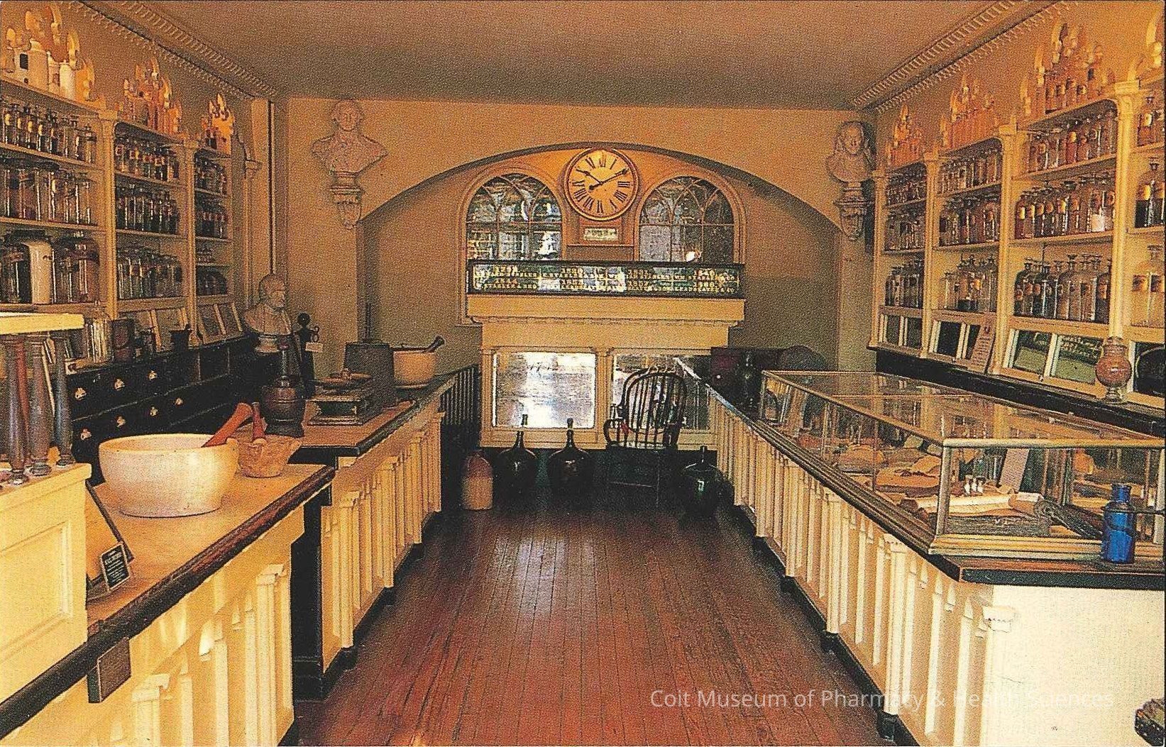 "Contains a remarkable collection of early medical ware and hand-blown glass containers, all original to this Apothecary. Founded in 1792, owned and operated by the same family for 140 years. Now a Museum."Collection