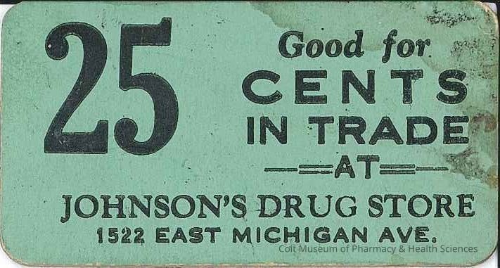 Coupon from Johnson's Drug Store, Jackson, MI. Reads "Good for 25 cents in trade at Johnson Drug Store, 1522 East Michigan Ave."Collection