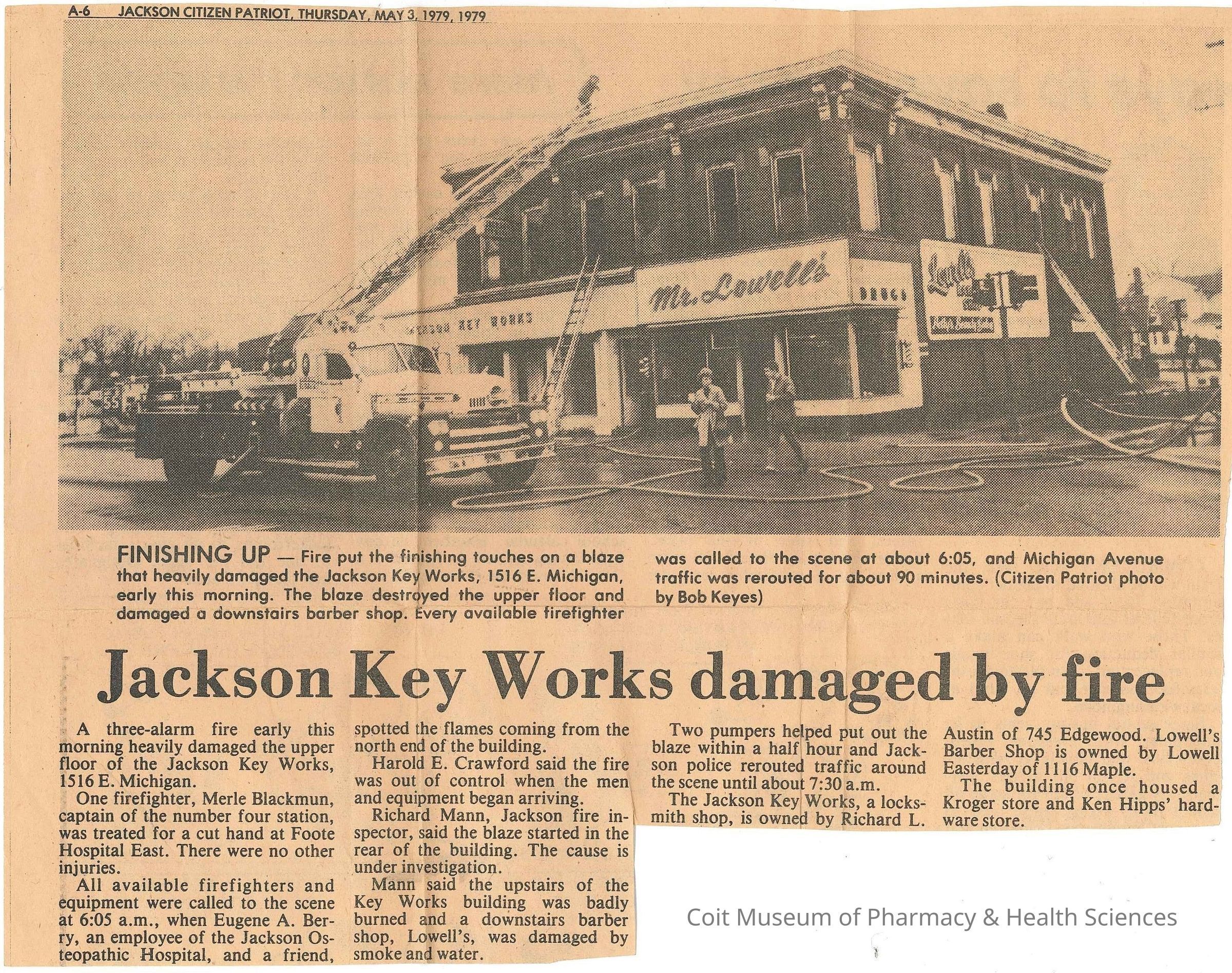 Article from Jackson Citizen Patriot (Jackson, MI), 5/3/1979. Describes fire at Jackson Key Works, adjacent to former Johnson's Drug Store.Collection