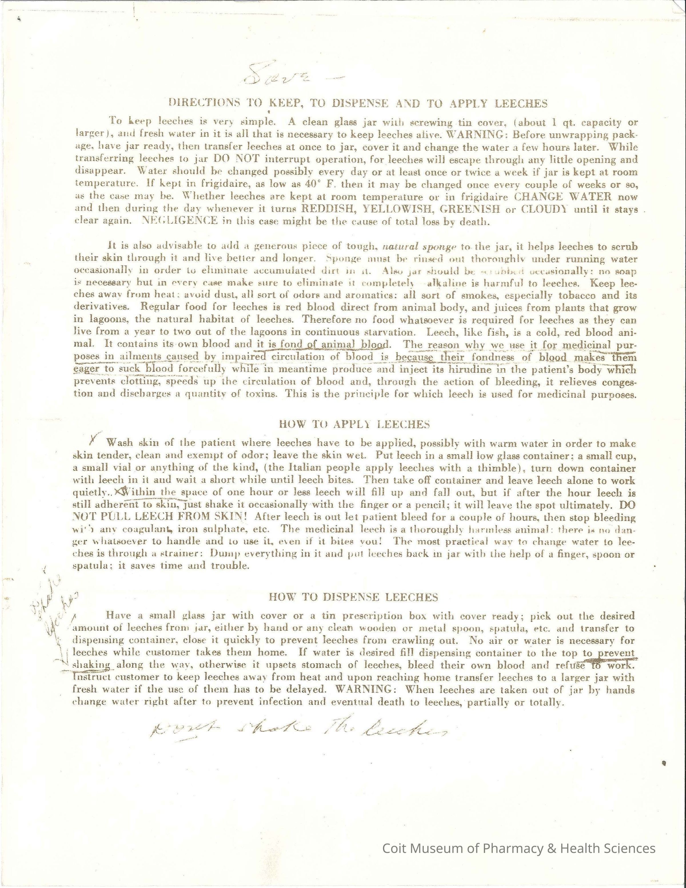 Directions to keep, dispense, and apply leeches.Collection