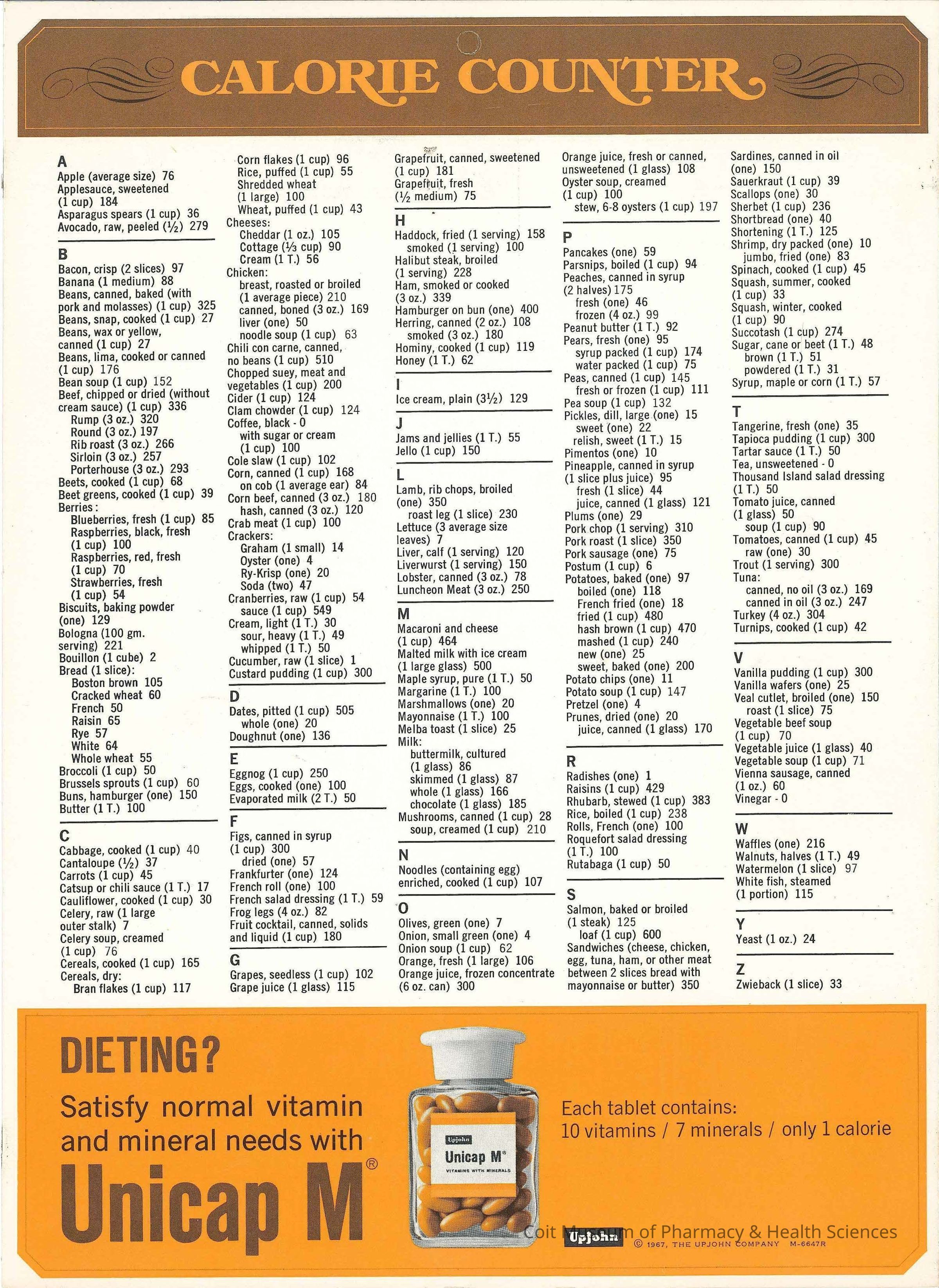 Calorie Counter Chart, with advertisement for Upjohn Unicap M Vitamins. [x8]