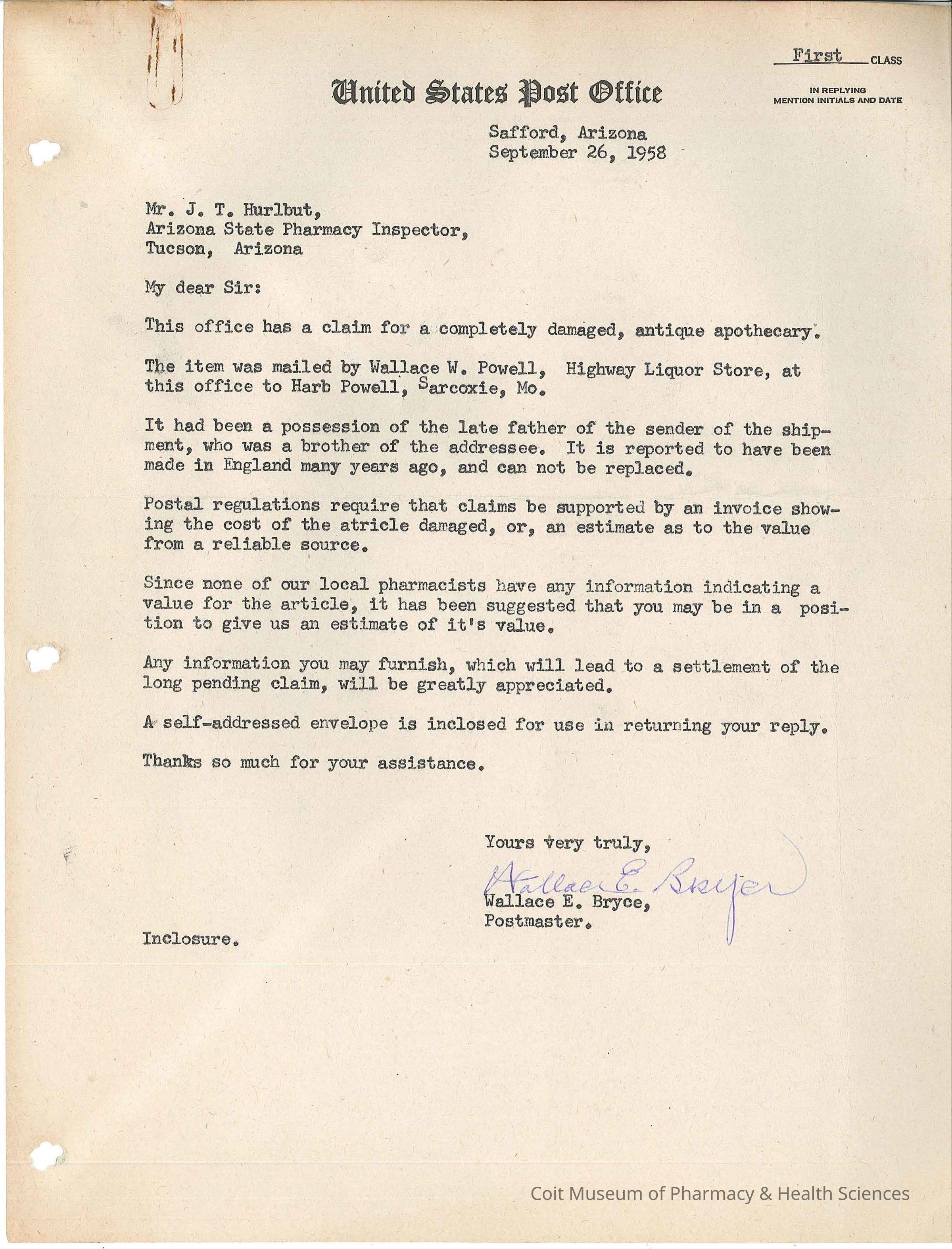 9/26/1958: Letter to Jess Hurlbut from Postmaster Wallace E. Bryce asking if Hurlbut can provide an estimate for a damaged "antique apothecary".