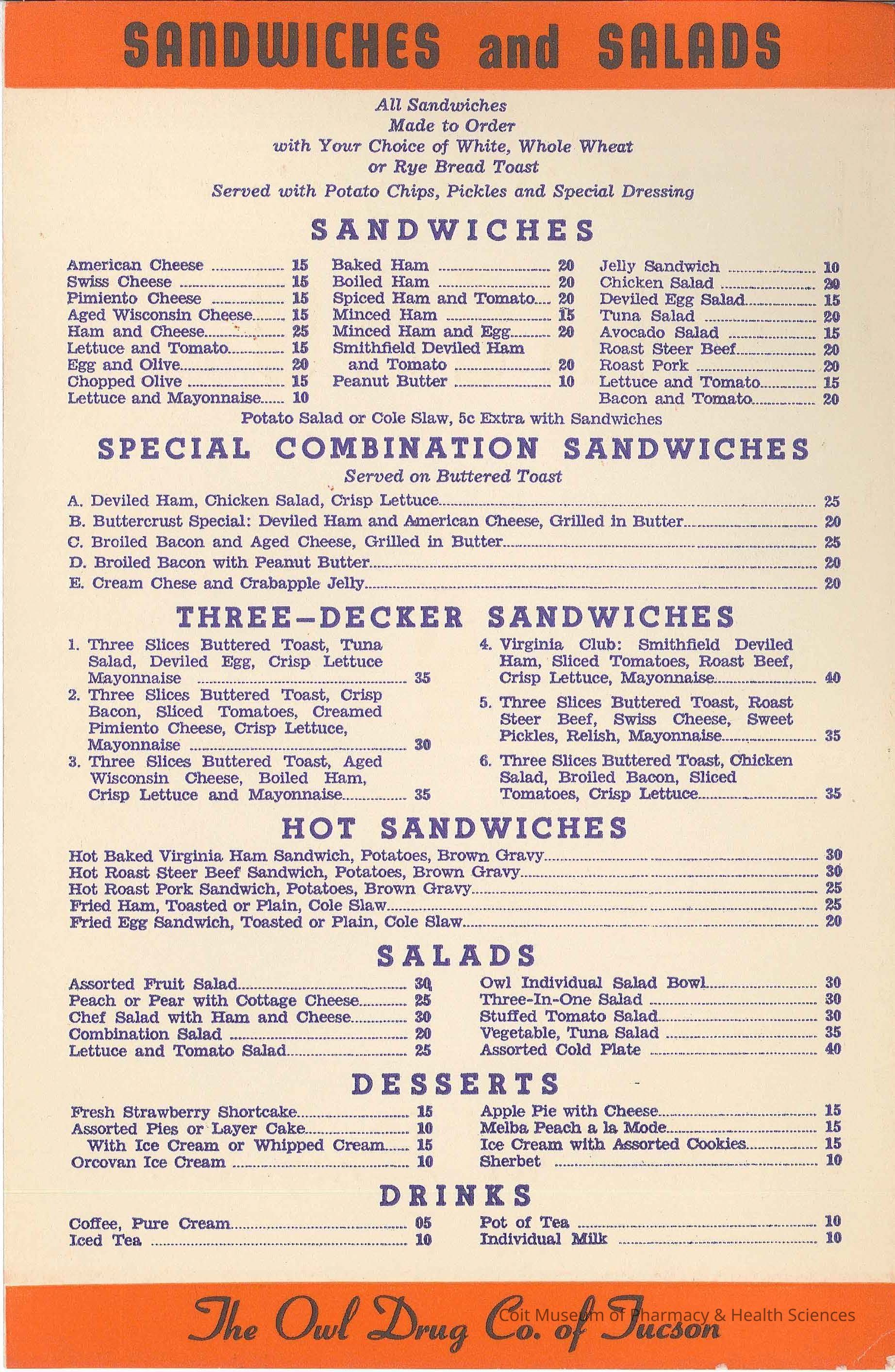 Soda fountain menu featuring sandwiches and salads from the Owl Drug Co. of Tucson.