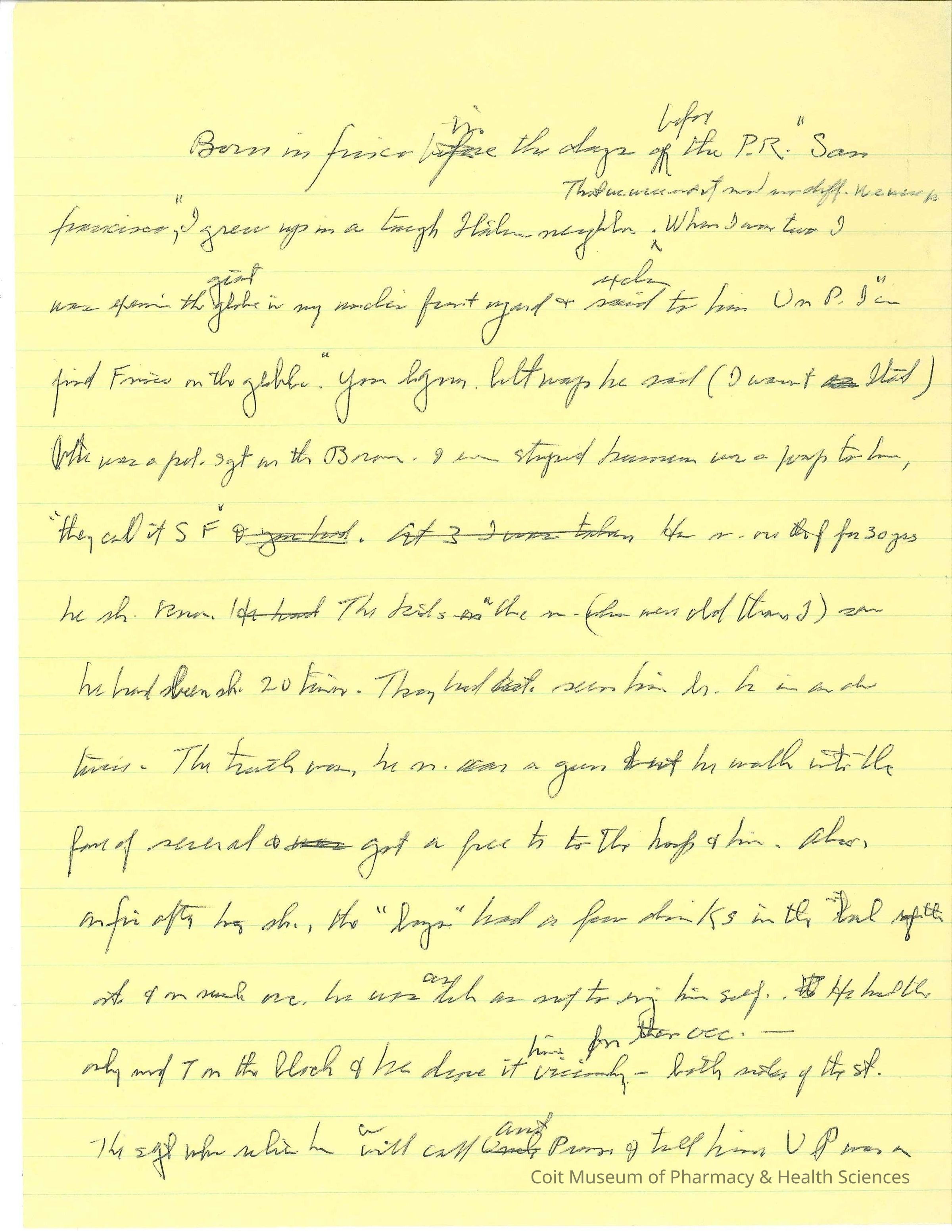 Handwritten excerpts on yellow legal paper of what would become Russell's "The Maid of Petticoat Lane" manuscript.
