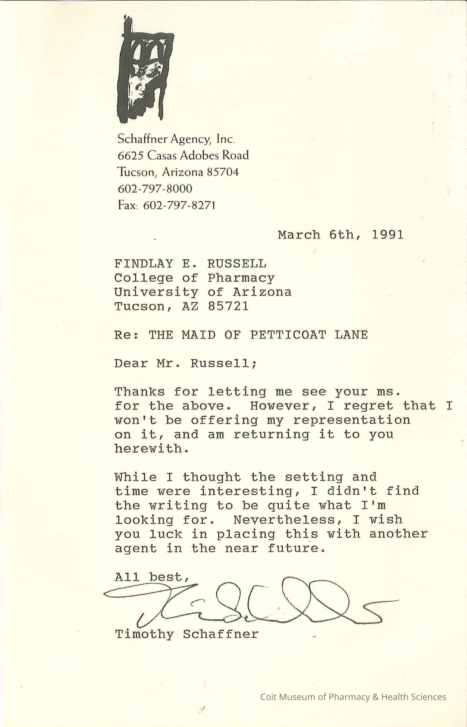 Rejection letter to Findlay Russell from Timothy Schaffner of the Schaffner Agency, Inc concerning the manuscript for The Maid of Petticoat Lane.