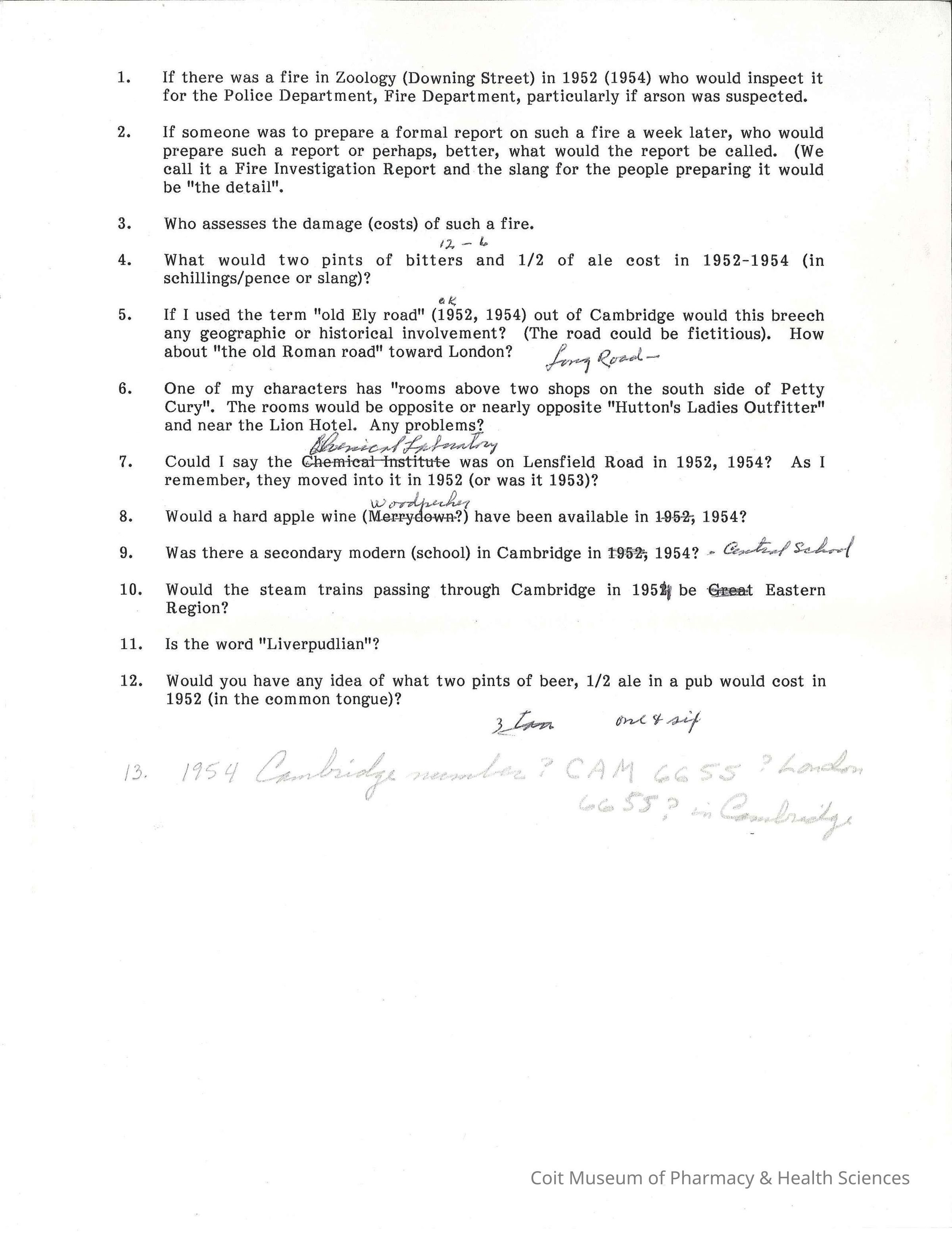 List of questions about Cambridge and English life. Russell sent many lists of questions to his English correspondents in order to perform research for his novel.