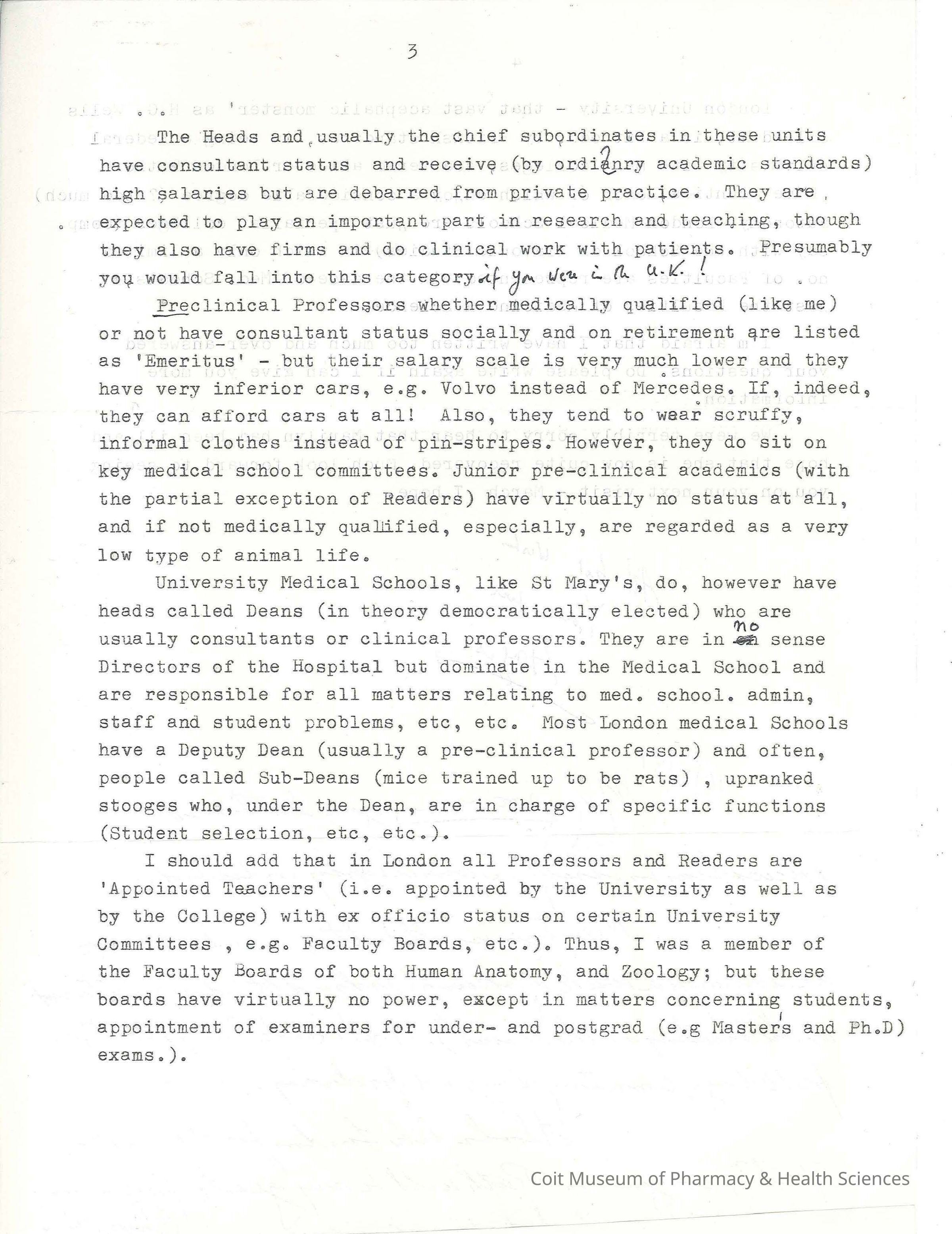 Page from a letter to Findlay Russell from one of his English correspondents Angus (no last name provided). The writer is answering Russell's research questions about medical school life in 1950's England. Includes Russell's handwirrten response to the letter.