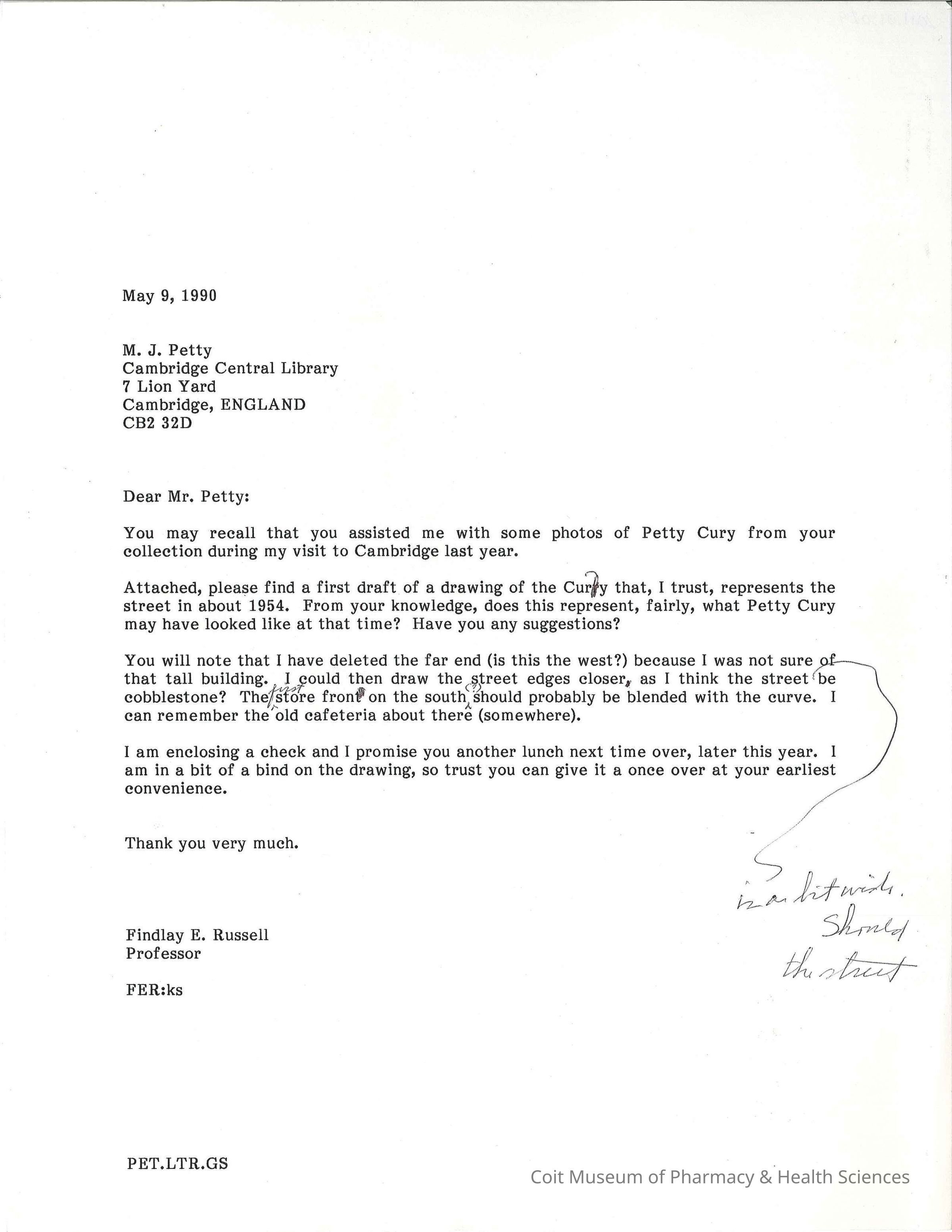 May 9, 1990: Russel writes asking Petty to evaluate a drawing of Petty Cury created using photographs that Petty helped Russell find. Letter mentions a check and another lunch. Urges Petty to look over drawing at his earliest convenience.