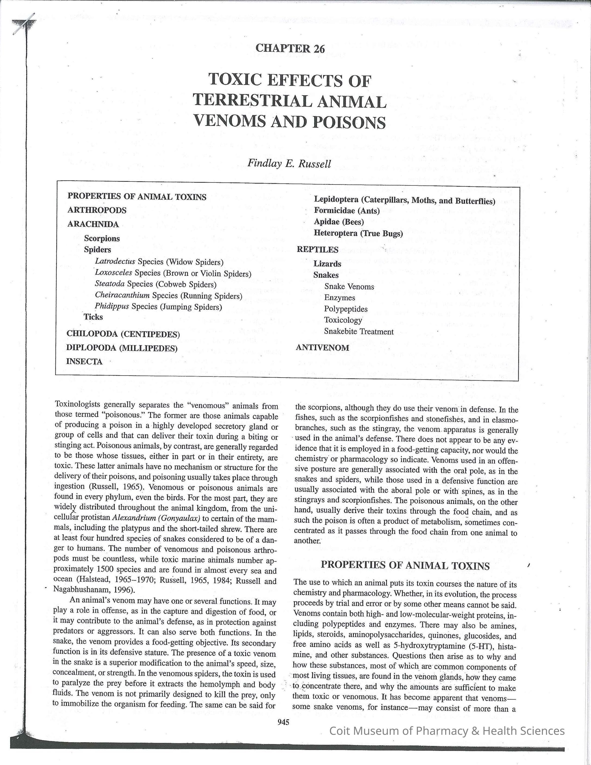 Copy of Chapter 26: Toxic Effects of Terrestrial Animal Venoms and Poisons written by Findlay Russell. From Casarett and Doull's Essentials of Toxicology textbook, 3rd Edition.
