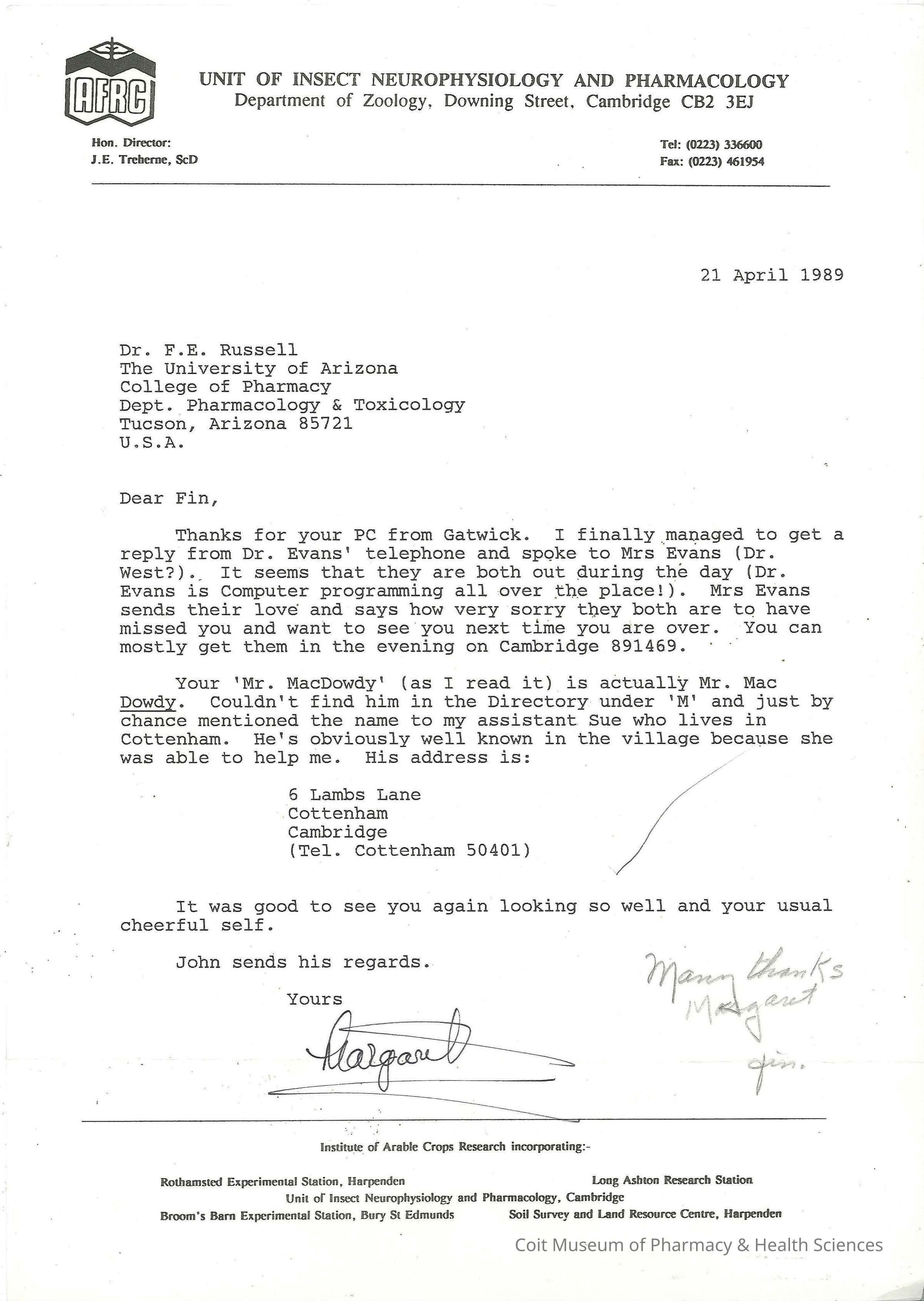 Letter to Findlay Russell from Margaret (no surname provided) on the Cambridge University Unit of Insect Neurophysiology and Pharmacology letterhead. Letter answer's Dr. Russell's inquiries about Dr. and Mrs. Evans as well as Mr. Mac Dowdy.