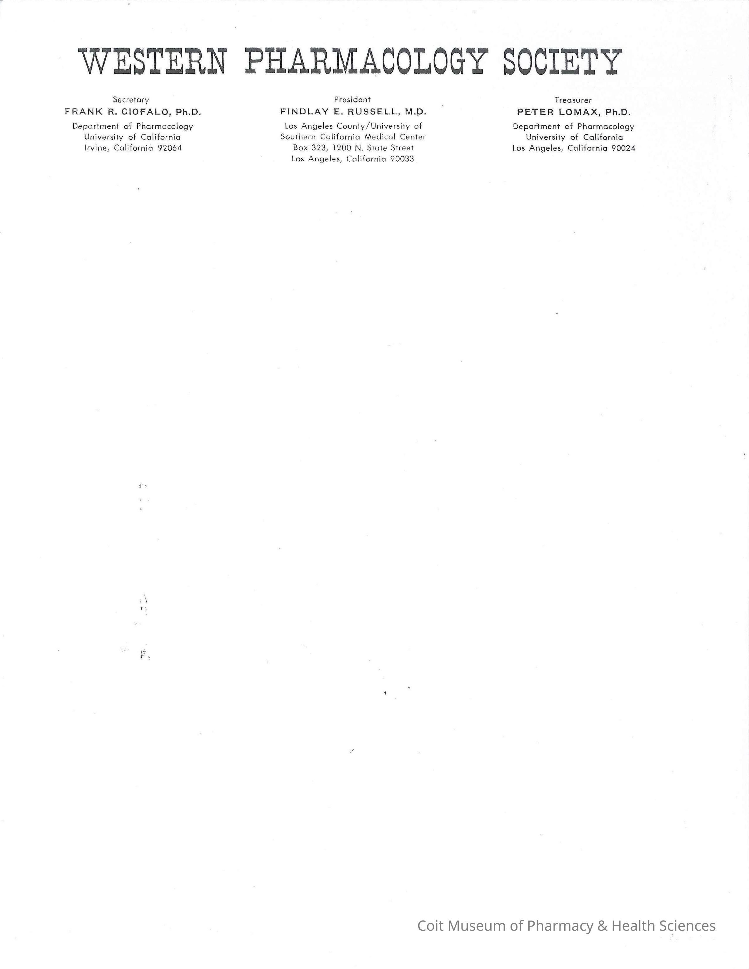 Western Pharmacology Society letterhead. Lists Frank Ciofalo as secretary, Findlay Russell as president, and Peter Lomax as treasurer.