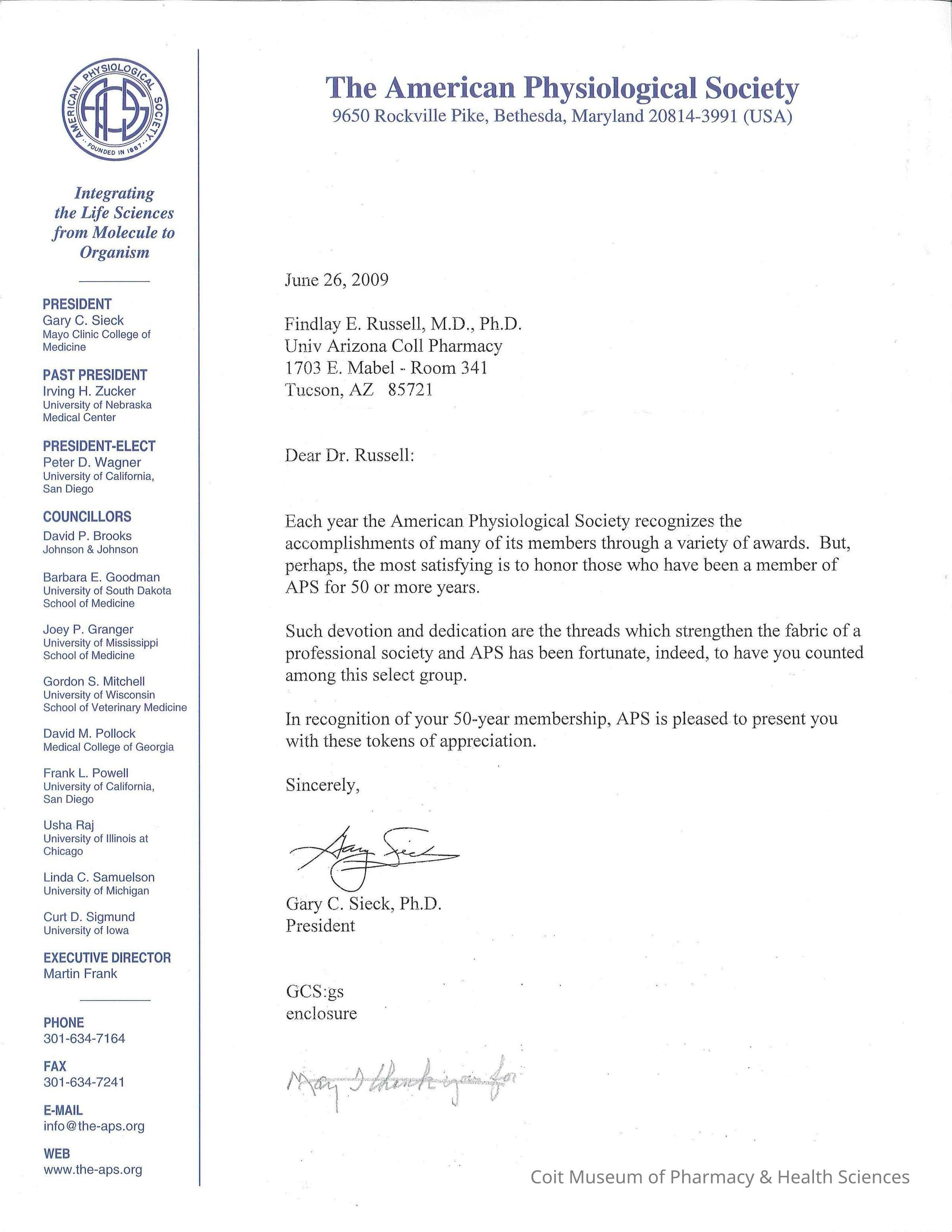 Letter to Findlay Russell from Gary Sieck, President of the American Physiological Society, commending him for his 50 year membership in the American Physiological Society. Contains a handwritten response from Russell.Collection