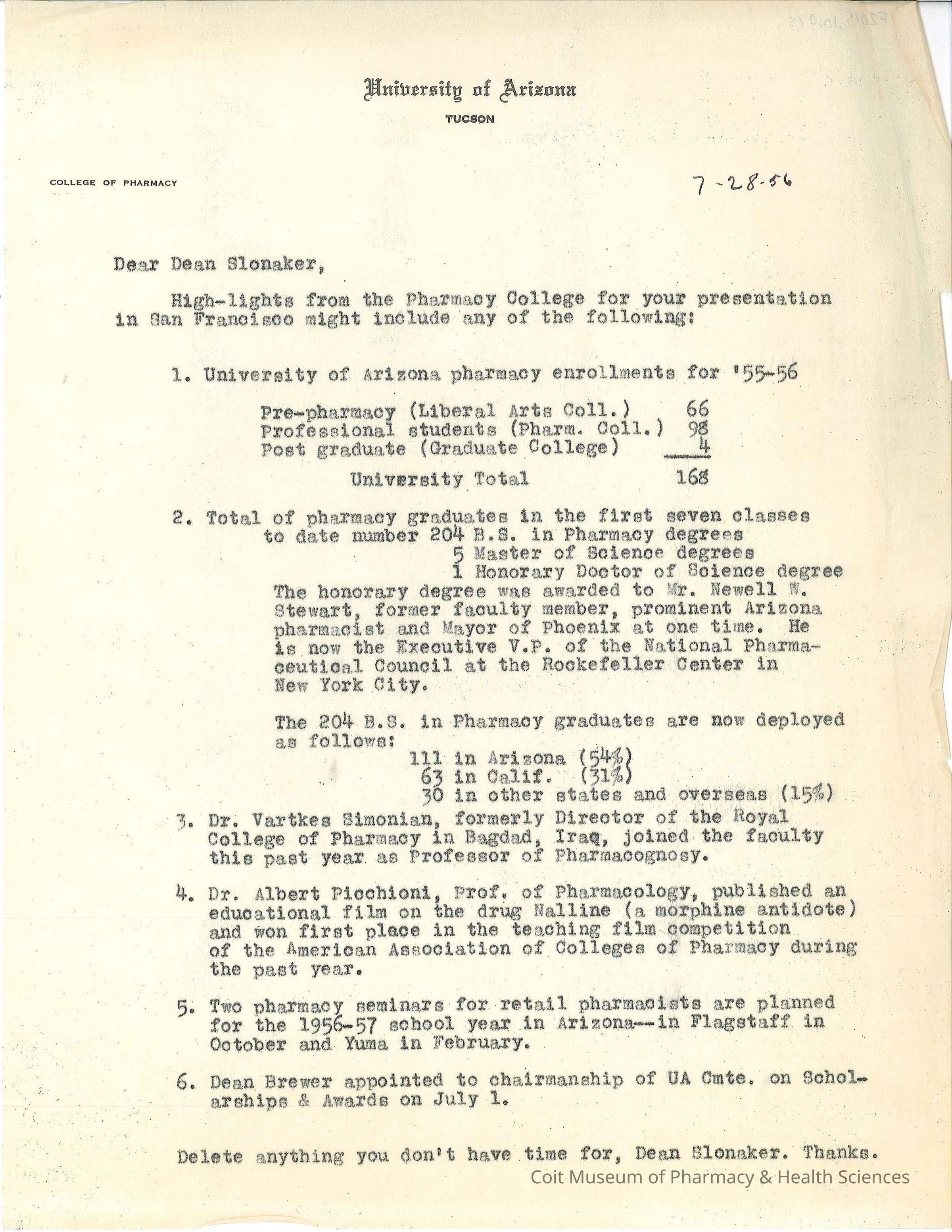 Letter to Dean Slonaker from the College of Pharmacy containing enrollment information and news items relating to the college for a presentation.