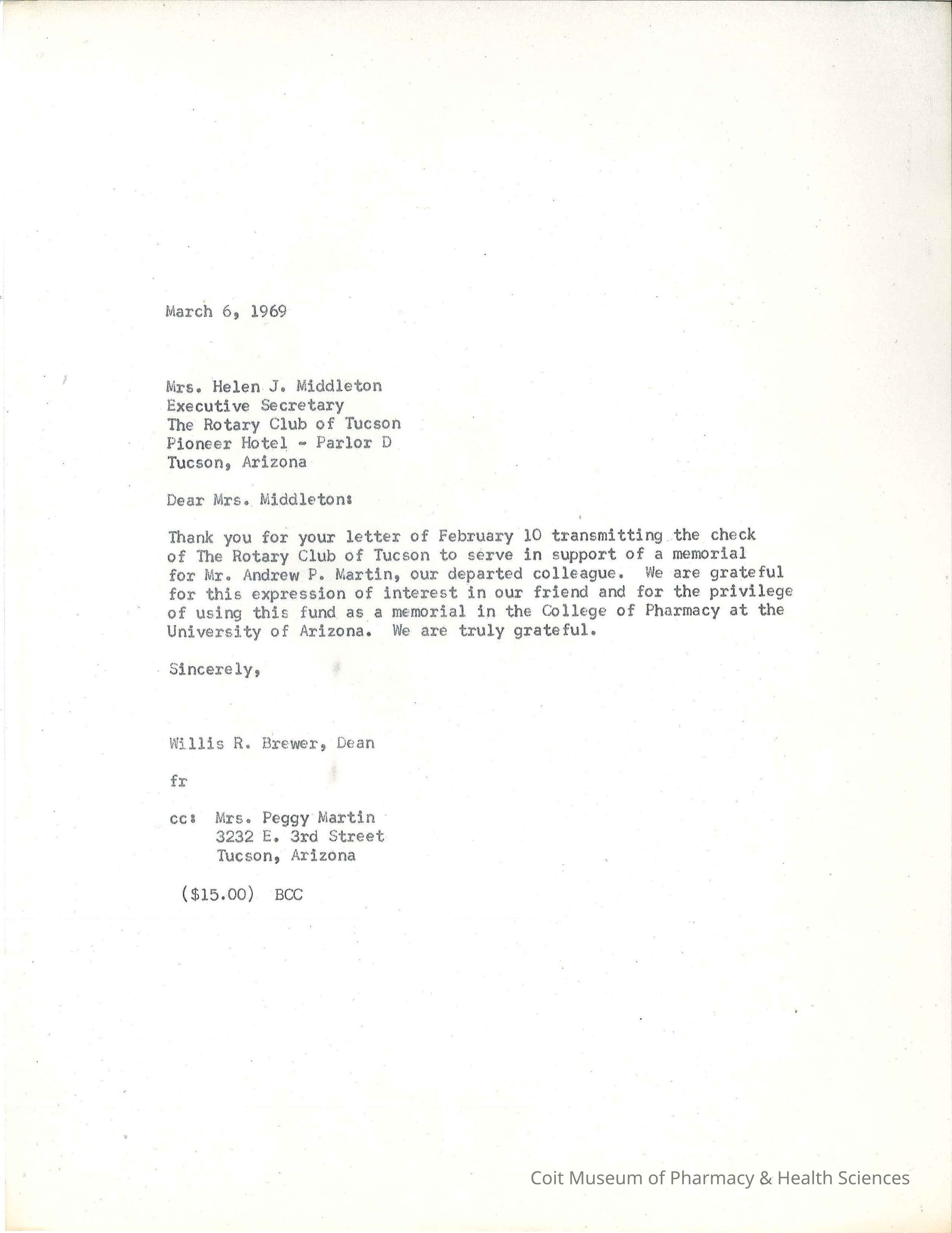 Letter from W.R. Brewer to Helen Middleton, executive secretary of the Rotary Club of Tucson thanking the Rotary Club for their donation to the Andrew Martin memorial. Includes Middleton's original letter dated 2/10/1969.Collection